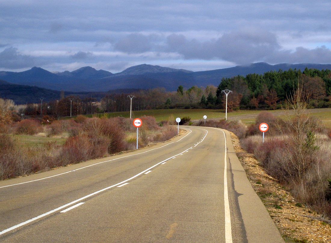Buen día de diciembre para rodar en bici, por las carreteras llanas del valle del Cea, Picos de Europa al fondo.