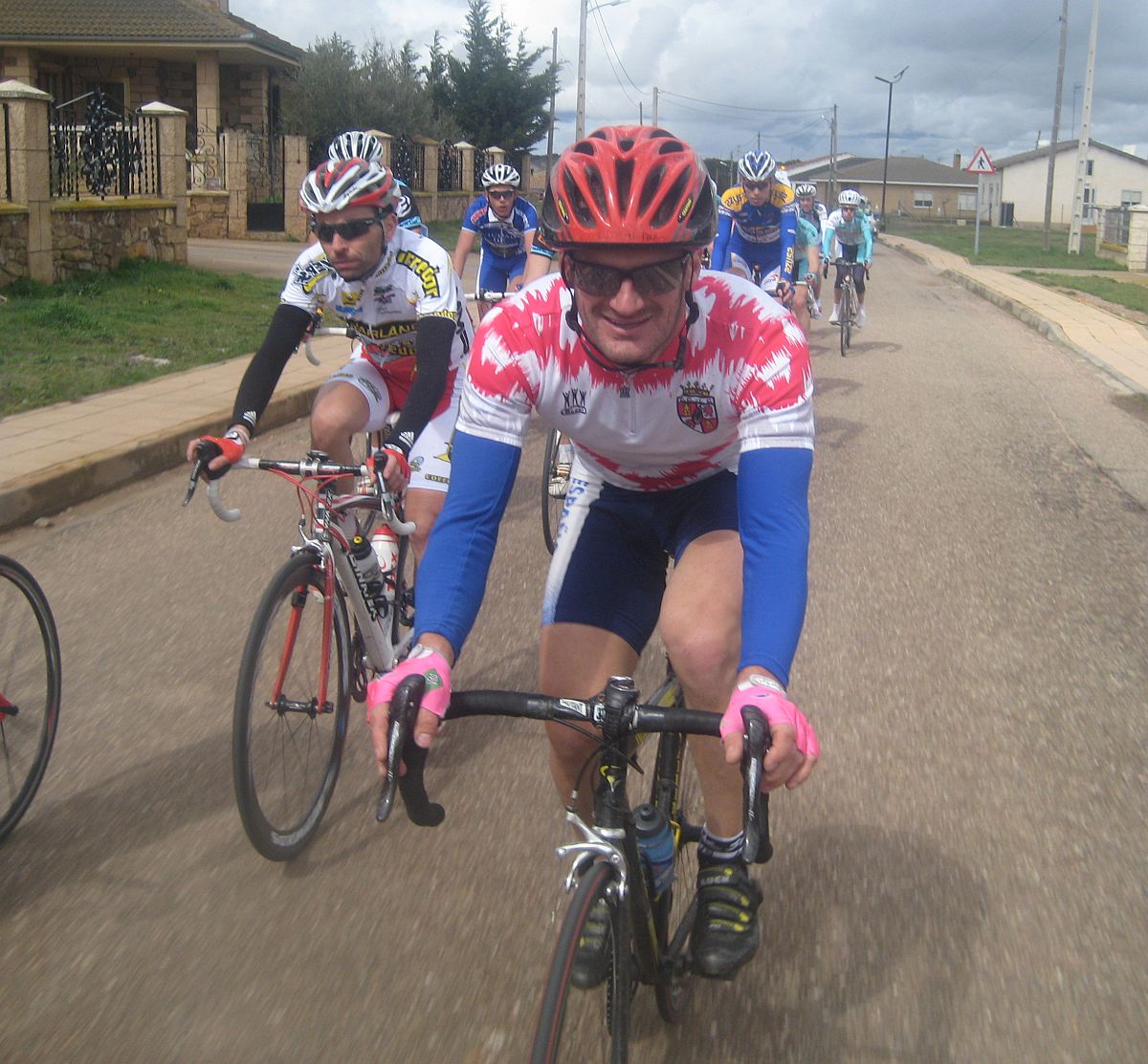 La podríamos llamar la clásica de los Pinchazos, yo lo haría en el km 10 o así, y tras complicarse el cambio de rueda tuve que parar 2 veces, una pila de kms persiguiendo con el pelotón perdido en el horizonte, primero entre coches, luego solo pasando gente que se descolgaba, se había salido a fuego y había repechos de cierta entidad, también con un Cai, los pueblos que te frenan los coches... al final entré, pero muy tocado, el pelotón iba muy deprisa en una carrera tan corta y había costado muchisimo entrar.