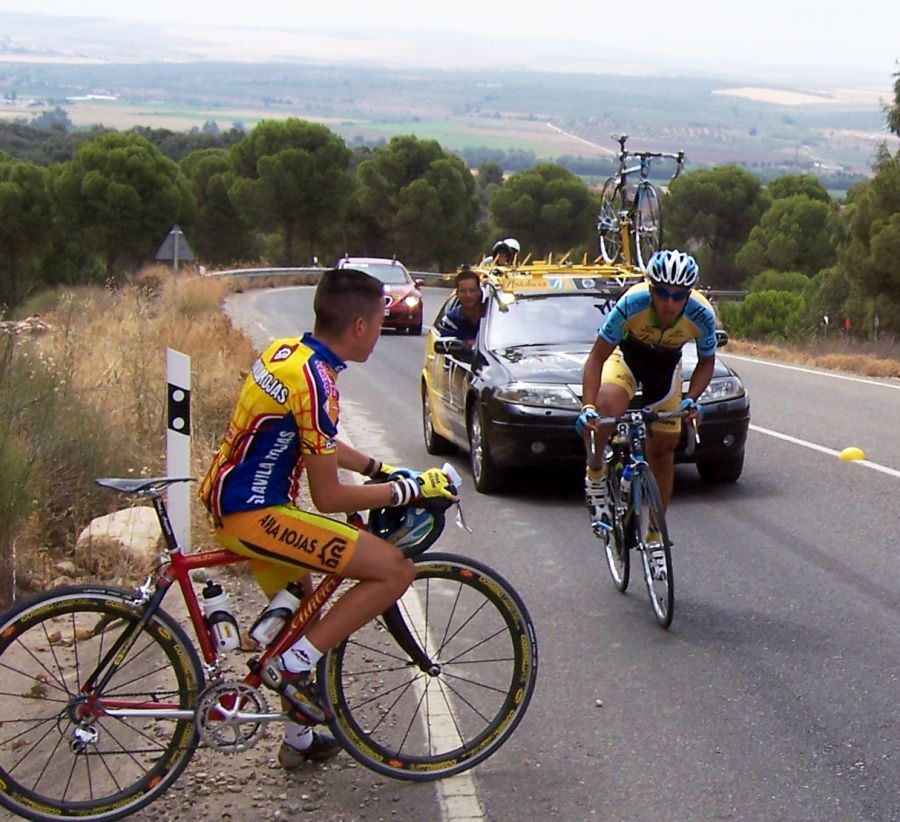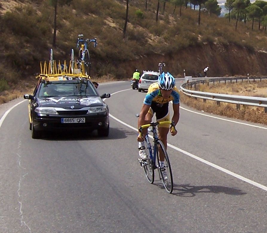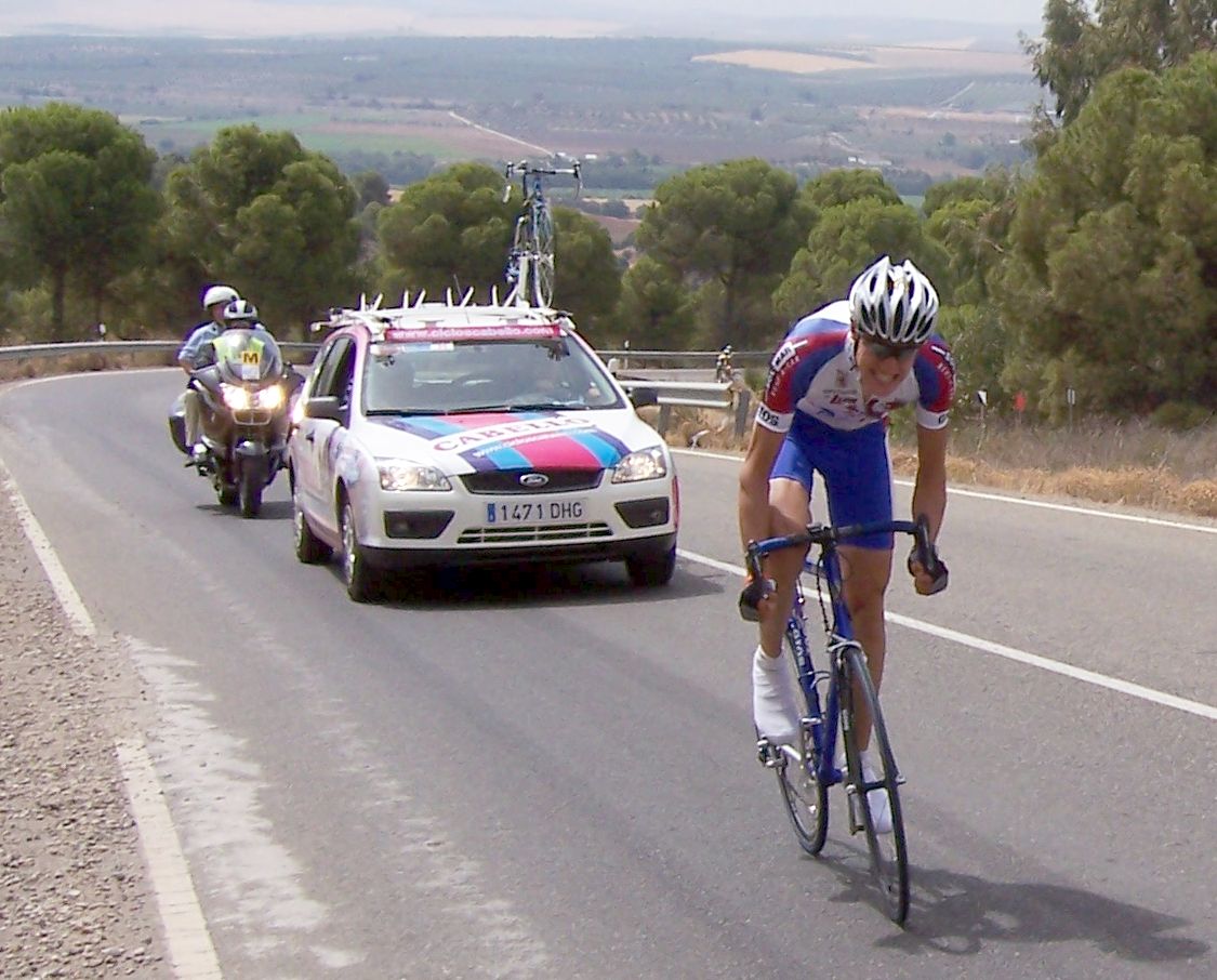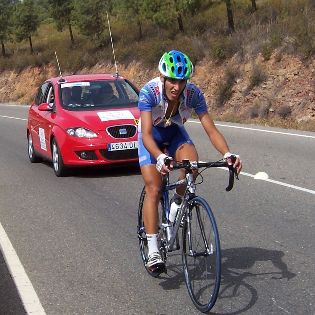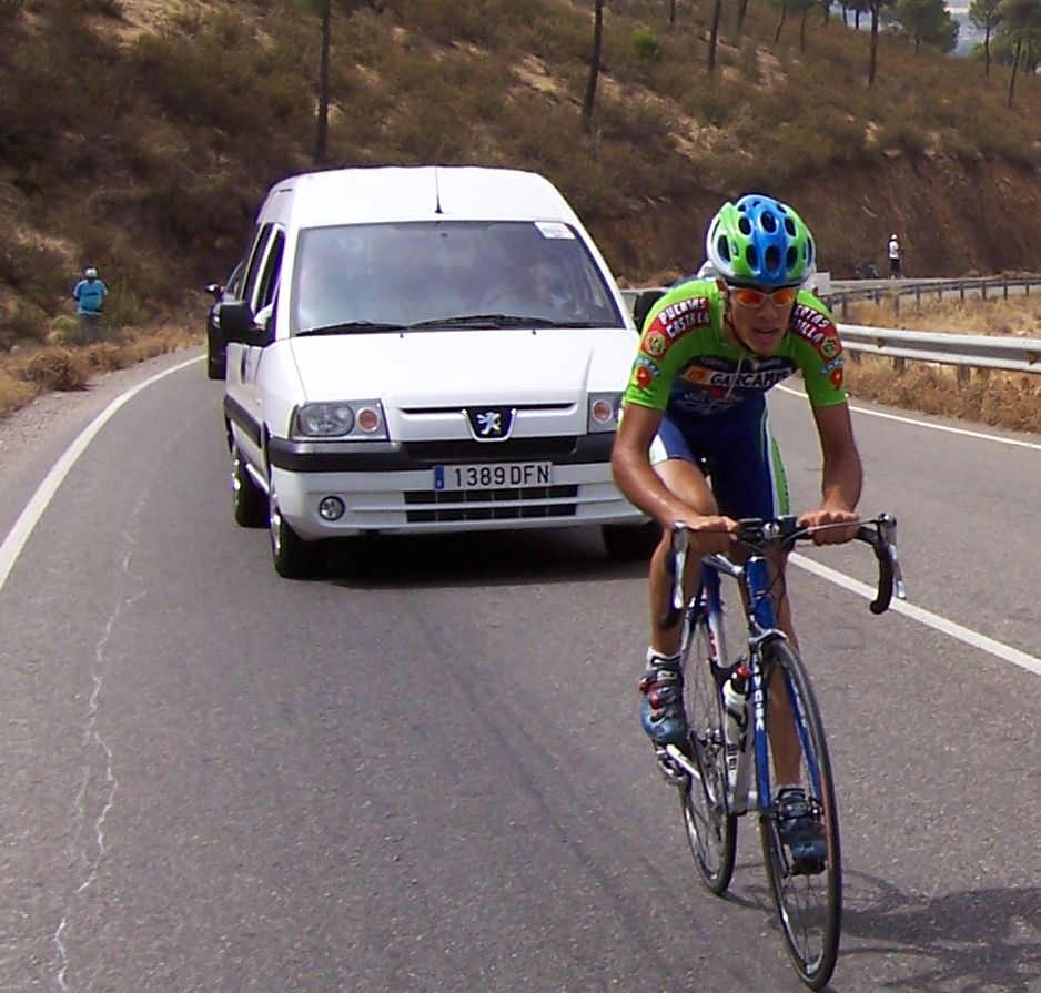 Mi director no me dejó relajarme en ese grupo, yo queria bajar al médico por que me dolía mucho el brazo pero tuve que arrancar, salté de alli y enganché con el segundo pelotón, cuando enganché llegamos a las subidas de la carretera de Santa Eufemia a El Viso, allí salte y me metí en otro corte de 5 o 6, nos pusimos a tirar a bloque para perseguir al grupo de 26 que quedaba en cabeza.