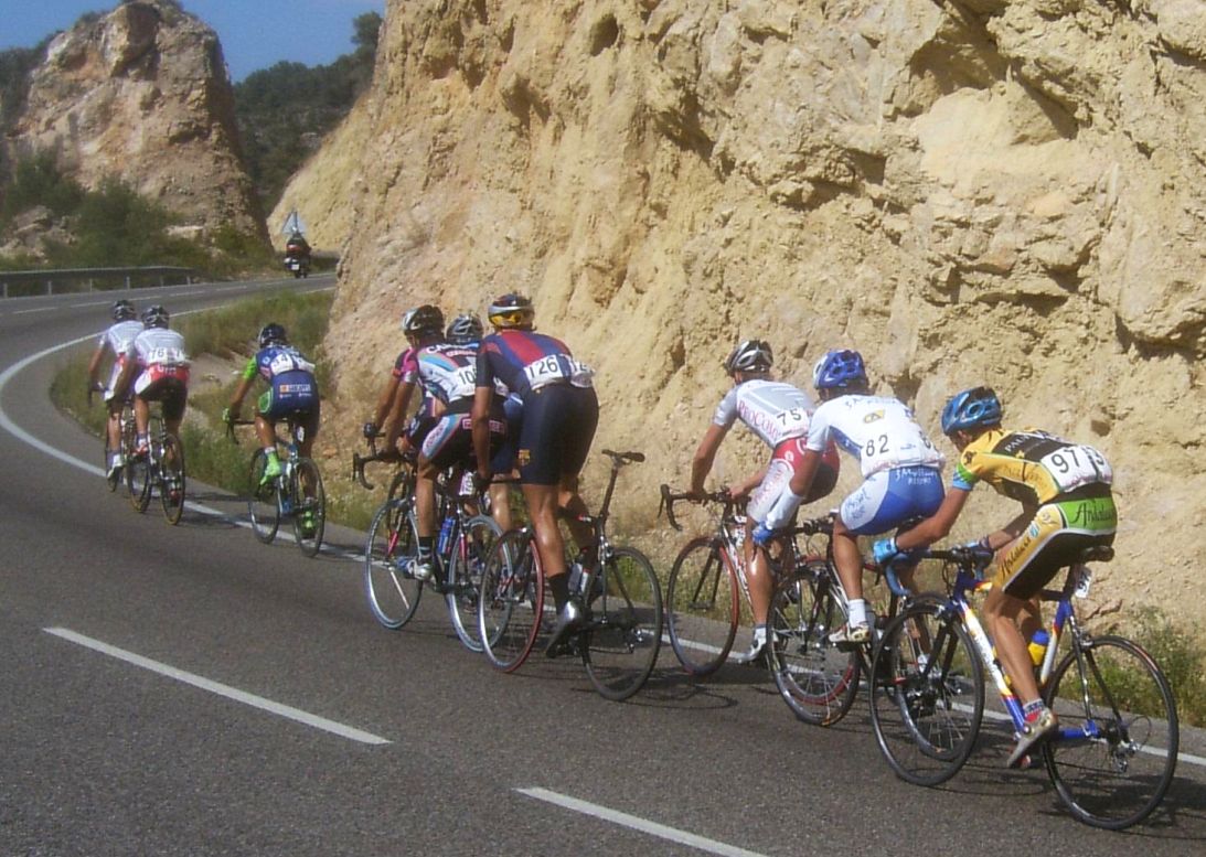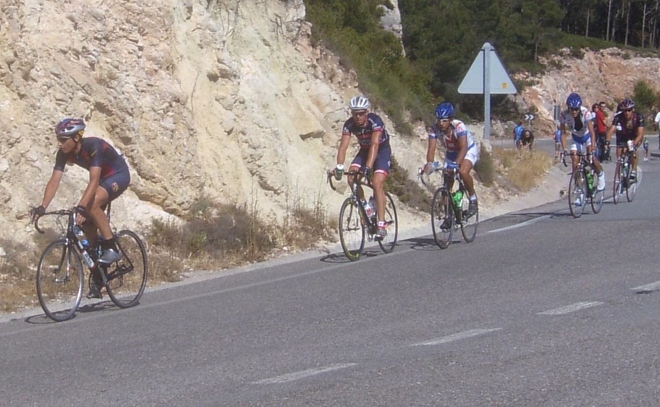 Nos alejamos de la costa y empezamos a entrar en terreno montañoso, alli ya iba yo mejor, empezé a arrancar, con la bici flexada mis ataques son mas tristes pero bueno, me meti ahi en los fregaos, hasta que Sergio Carrasco marchó solo por delante, muy valiente el chabal. Llegamos al puerto y se fue un grupo por delante que pilló a Sergio y que le soltaron, el puerto era durillo, rampas serias, yo lo pasé ahi metido, ya se quedó mucha gente pero empalmaron por que se cayó el segundo de la general y le esperó todo el pelotón.