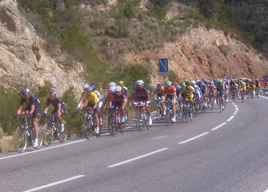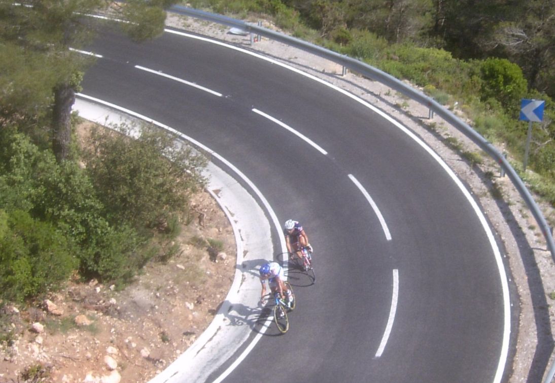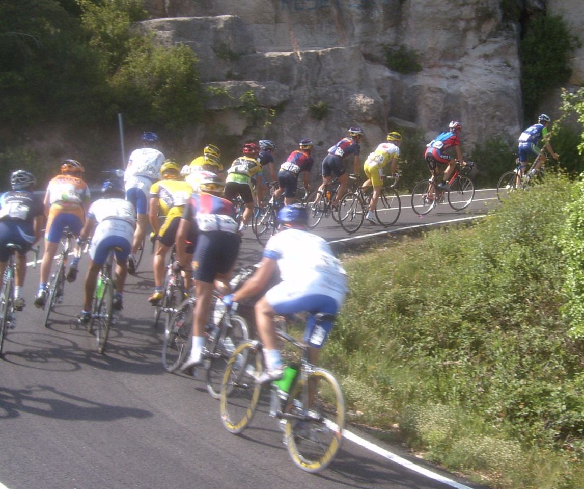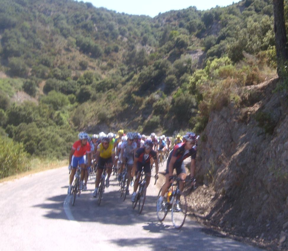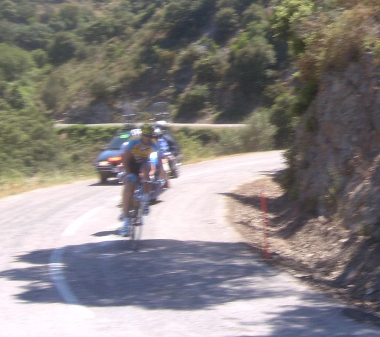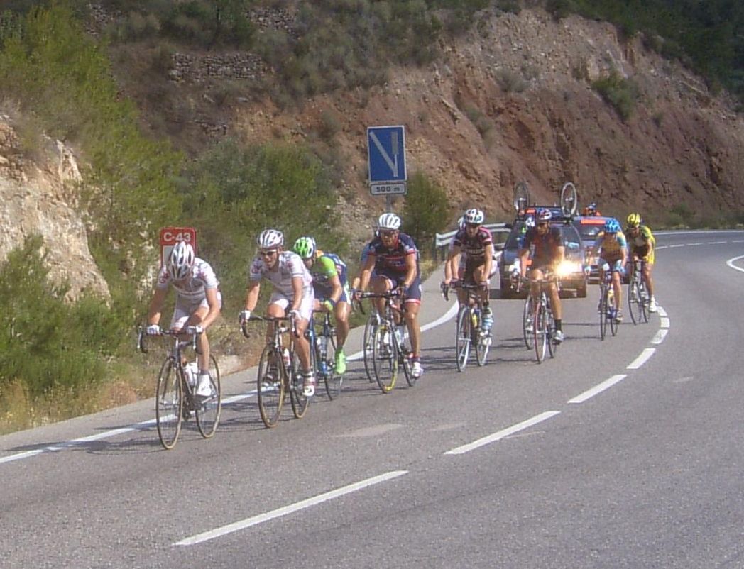 Por fin llegamos al descenso de ese puerto y empezamos otra subida, que era otro puerto larguisimo no puntuable, alli subiendo subiendo, iban tirando los Procom a por un corte que se habia hecho, a rueda se iba bien tranquilo, mirando los barrancos que habia que daban vertigo. A rueda de los guiris coronamos el puerto no puntuable y se empezaba el descenso de la Almussara, un puerto muy largo con muchas curvas, buen asfalto pero muchas piedras sueltas, donde perdió Sebastian Franco la Vuelta, en una curva vimos al lider de la vuelta en el suelo. El lider ha perdido, Franco ha muerto...pero resucitó ganando el dia siguiente. Cuando llegamos abajo se habia partido el paquete, habia un repecho del 10%, lo subi a tope para enganchar con los primeros y alli ya a rueda de los guiris otra vez.
