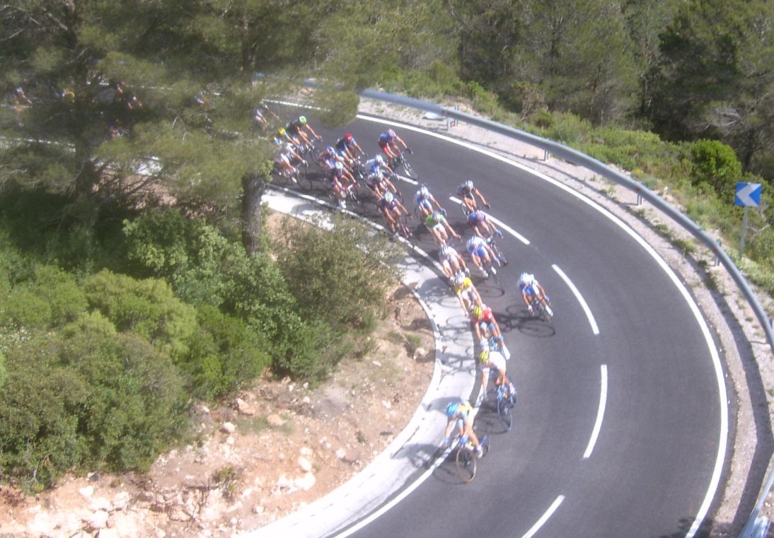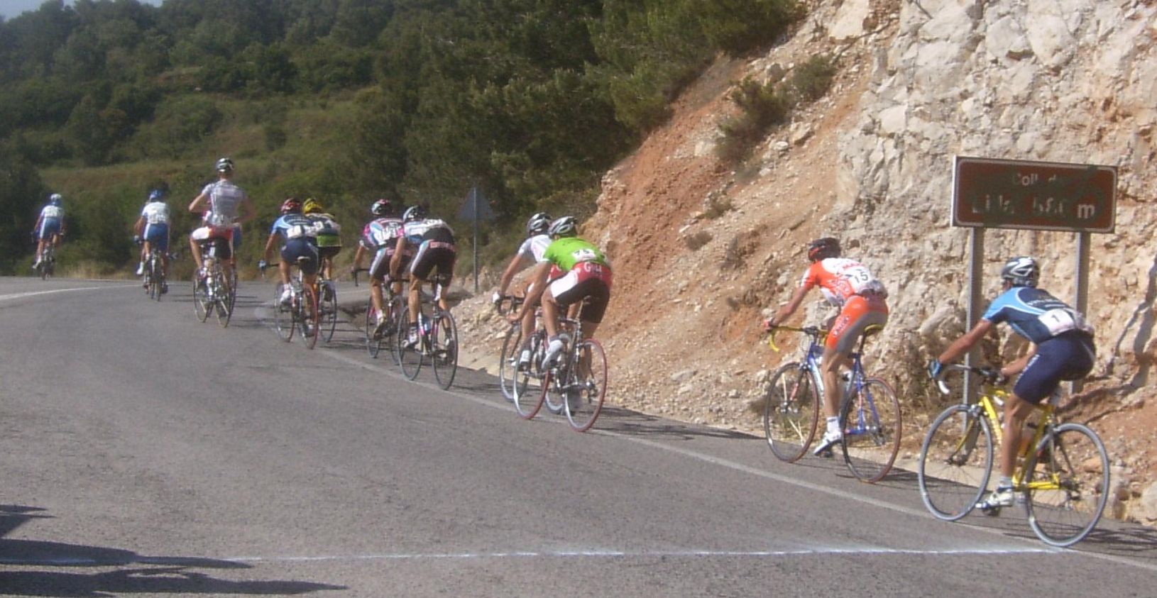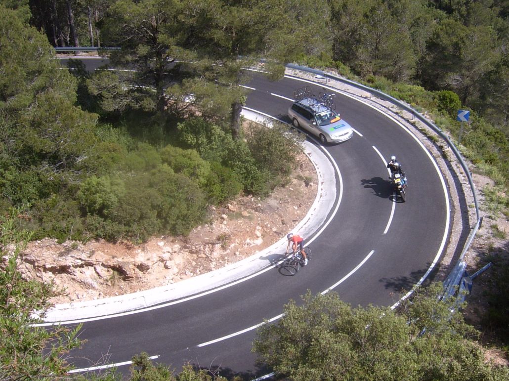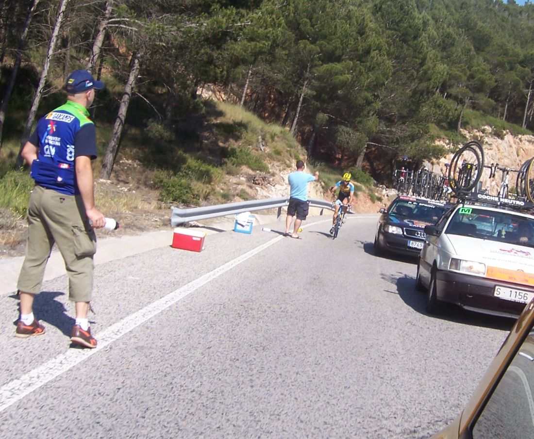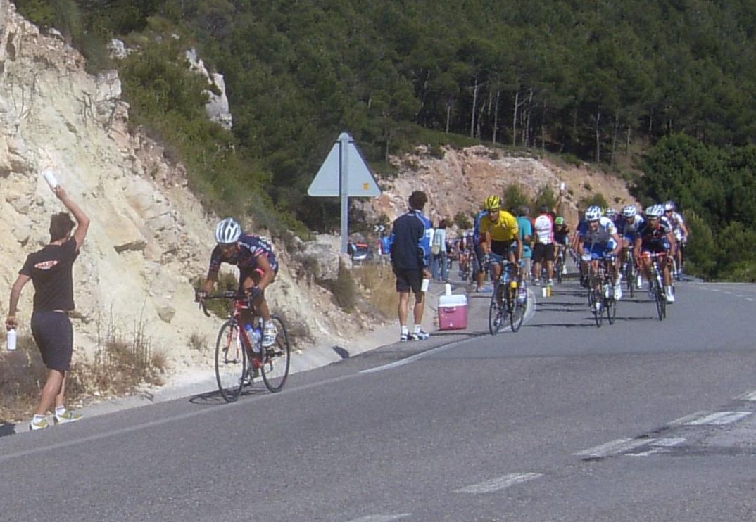Por fin llegamos al descenso de ese puerto y empezamos otra subida, que era otro puerto larguisimo no puntuable, alli subiendo subiendo, iban tirando los Procom a por un corte que se habia hecho, a rueda se iba bien tranquilo, mirando los barrancos que habia que daban vertigo. A rueda de los guiris coronamos el puerto no puntuable y se empezaba el descenso de la Almussara, un puerto muy largo con muchas curvas, buen asfalto pero muchas piedras sueltas, donde perdió Sebastian Franco la Vuelta, en una curva vimos al lider de la vuelta en el suelo. El lider ha perdido, Franco ha muerto...pero resucitó ganando el dia siguiente. Cuando llegamos abajo se habia partido el paquete, habia un repecho del 10%, lo subi a tope para enganchar con los primeros y alli ya a rueda de los guiris otra vez.
