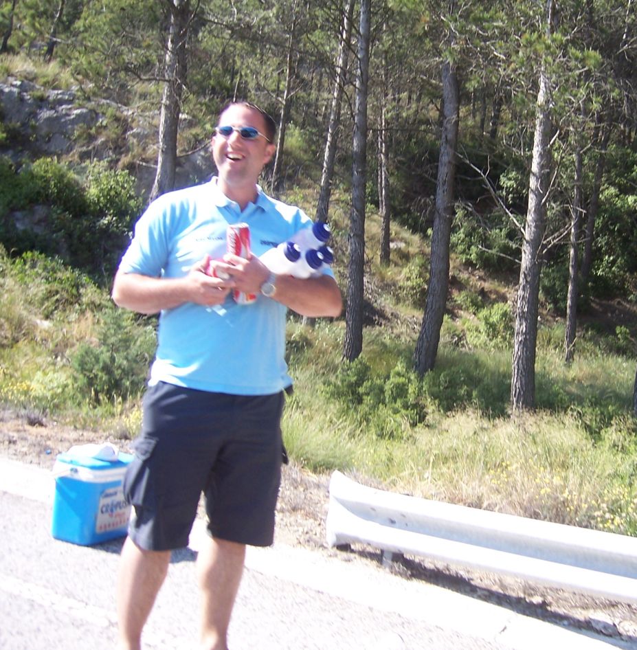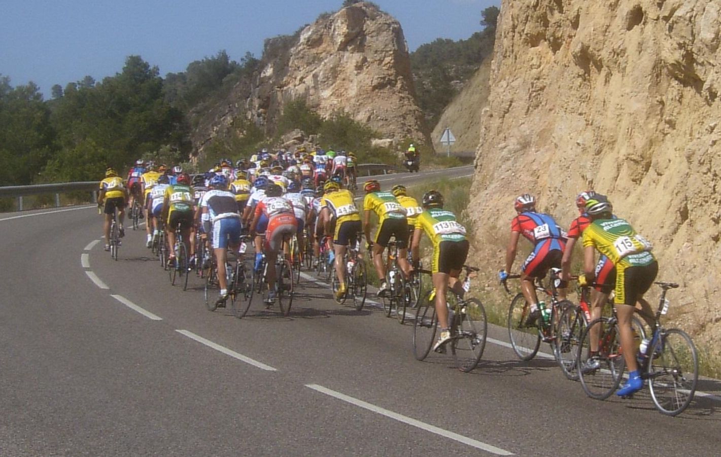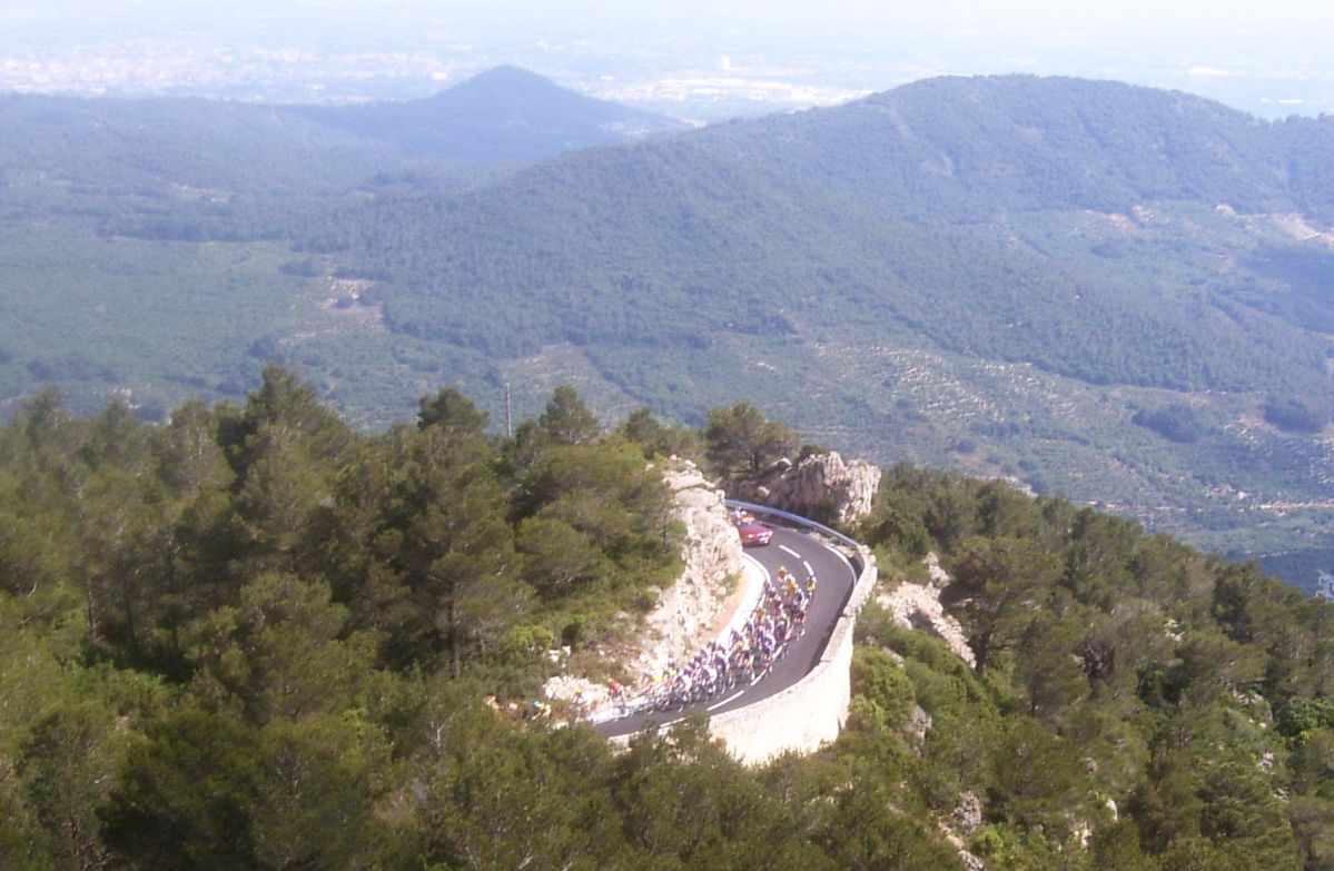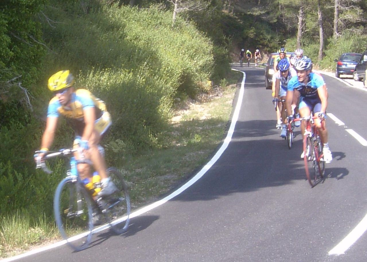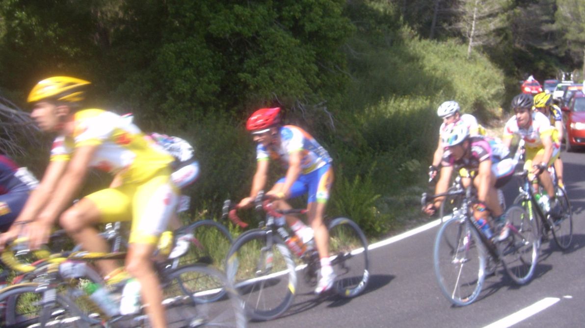 Por fin llegamos al descenso de ese puerto y empezamos otra subida, que era otro puerto larguisimo no puntuable, alli subiendo subiendo, iban tirando los Procom a por un corte que se habia hecho, a rueda se iba bien tranquilo, mirando los barrancos que habia que daban vertigo. A rueda de los guiris coronamos el puerto no puntuable y se empezaba el descenso de la Almussara, un puerto muy largo con muchas curvas, buen asfalto pero muchas piedras sueltas, donde perdió Sebastian Franco la Vuelta, en una curva vimos al lider de la vuelta en el suelo. El lider ha perdido, Franco ha muerto...pero resucitó ganando el dia siguiente. Cuando llegamos abajo se habia partido el paquete, habia un repecho del 10%, lo subi a tope para enganchar con los primeros y alli ya a rueda de los guiris otra vez.