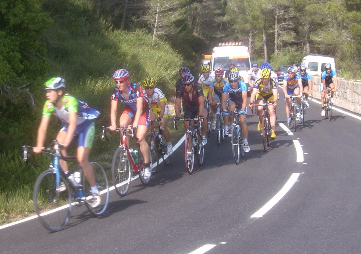 Asi que ya fuimos en grupeta, iba bien organizada, segun iban pasando los kms empezó a hacer mucho aire y frio, ya podia haberlo hecho antes que cuando yo me quedé hacia un calor asfixiante ahi en el puerto con aire de culo, que asco, ya en la grupeta se iba bien, incluso hacia frio. Bajamos hacia la costa y nos pusimos a tirar ahi a una ostia la grupeta, joder como iba la grupeta, mas deprisa que una escapada, nos metian 8 minutos y les recortamos a 4 minutos a los de alante, pero el Calata se empezó a pelear con los Maxxis por que le engatillaron en un repecho para que se quedara por que no pasaba y que alante al final apretan pues nos metieron 9 minutos, ganó Sebastian Franco, los guiris pestosearon con su equipo y sus malas artes, que no dejan tirar a los demas.
