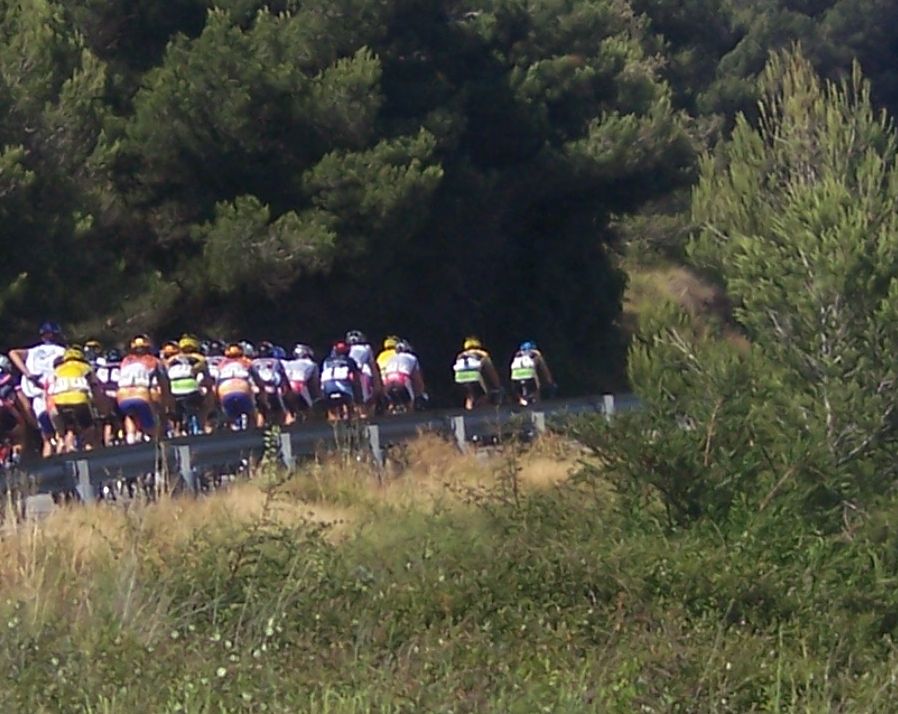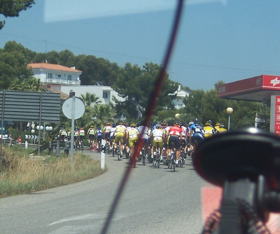 Todo el mundo queria dar el saque de honor en esta etapa, iban detrás del coche de los jueces con el gatillo abierto para arrancar, pero hubo falsos saques de honor por que entre que pinchaba la gente en la neutralizada y se les esperaba pues nos quitamos unos kms de etapa, pero como suele pasar en estos casos es peor por que se sale mas deprisa todavia, horrible como se salió con el aire de culo, la carretera costera de Alcanar-Amposta, se pasaban los pueblos a velocidades de vértigo, el Kiko que disputaba las Volantes, menudos latigos nos comiamos en las glorietas, yo iba en la cola pasando unos apuros..