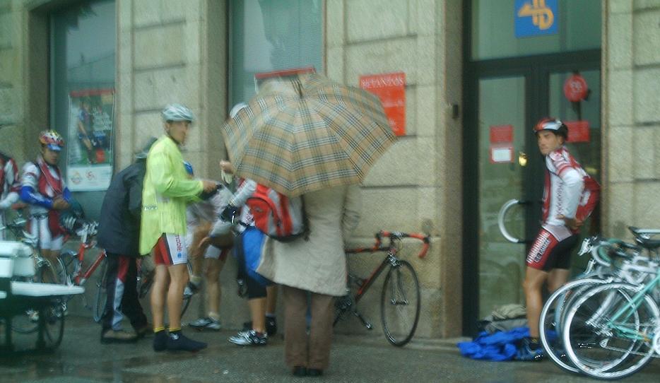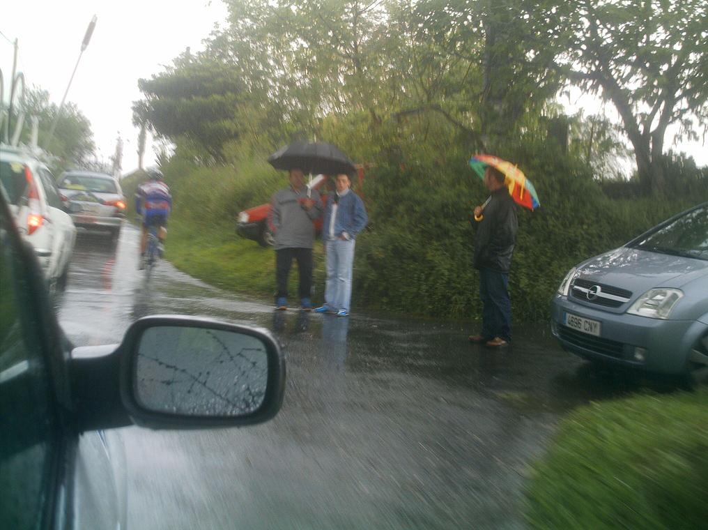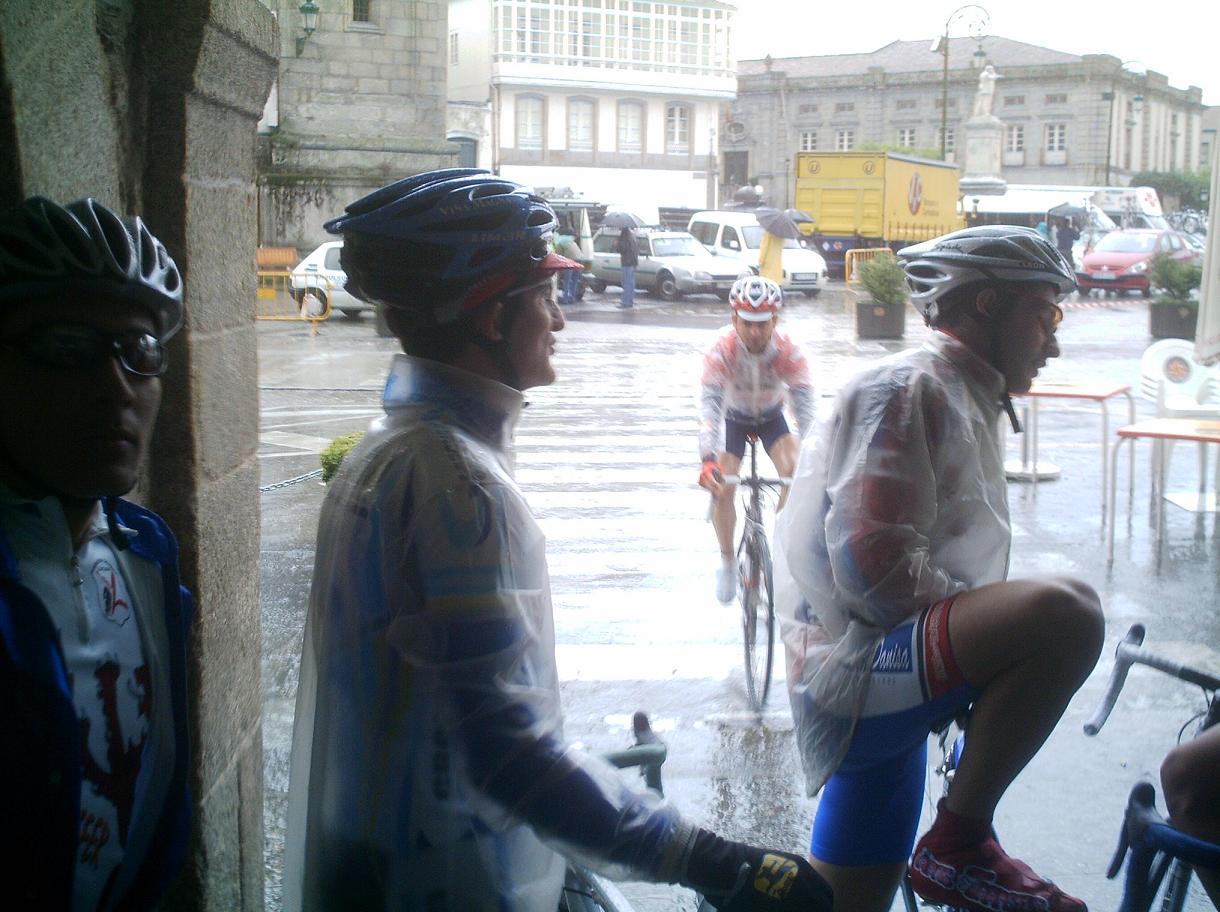 Redondo pusó el redondo automatico, tirar y tirar y tirar, y va tan sobrao que no pide ni relevo, el Capi le pasaba en las bajadas, que peligrosisismas con lluvia eran mi tortura, me comia unos latigos que pa que mas... yo iba a rueda en coche cama pero aun asi iba jodidisimo por el frio, las tiriteras, las bajadas, los repechos, la carrera se hacia eterna, anduvimos asi 30 kms, hubo momentos que bajando me entraba tales tiriteras de frio que tenia miedo de perder el control de la bici, pero habia que aguantar, estabamos disputando hacer de los 5 primeros.