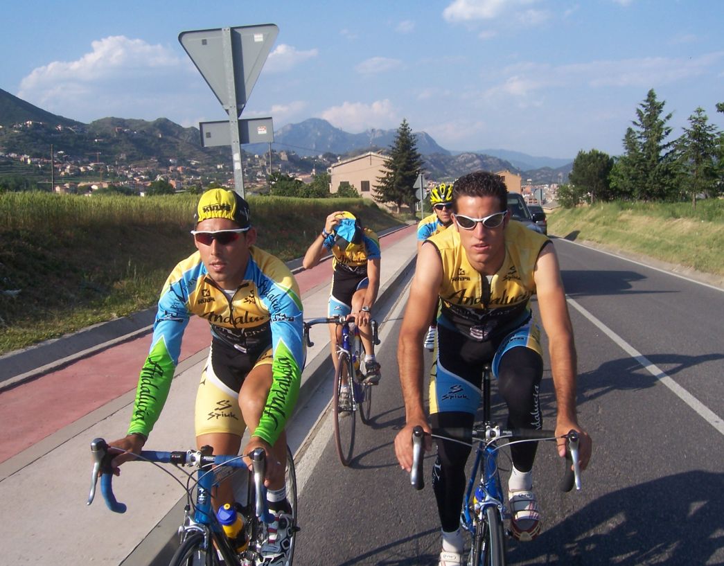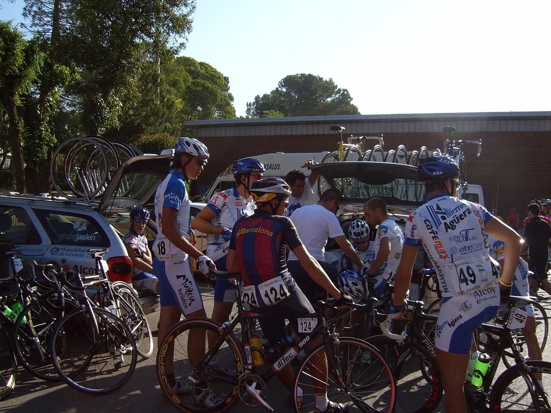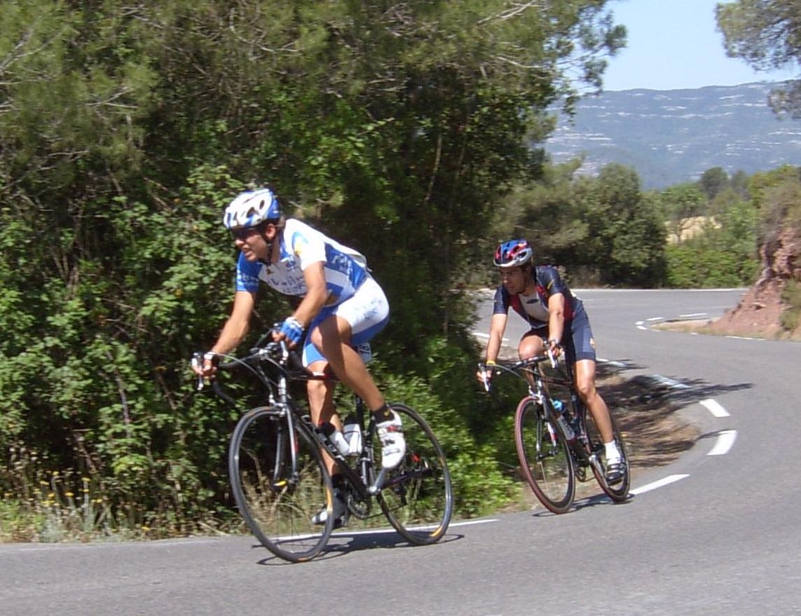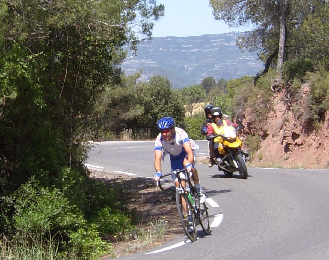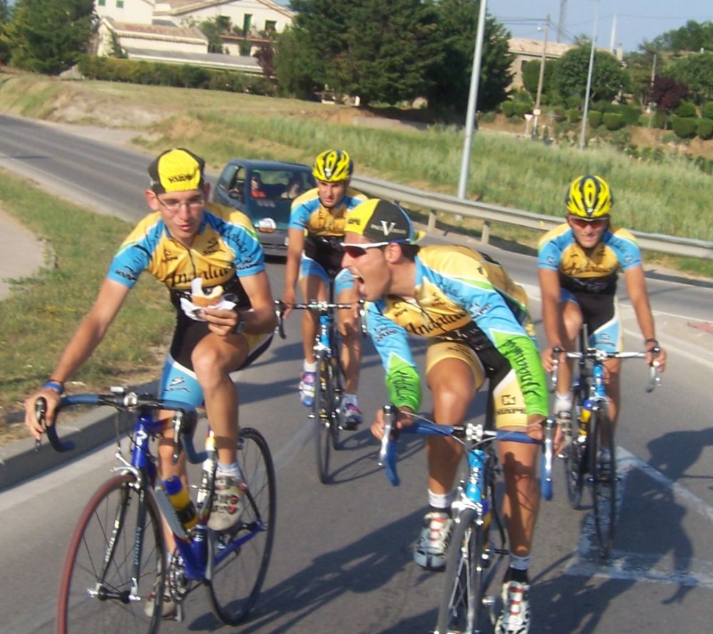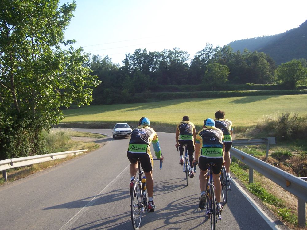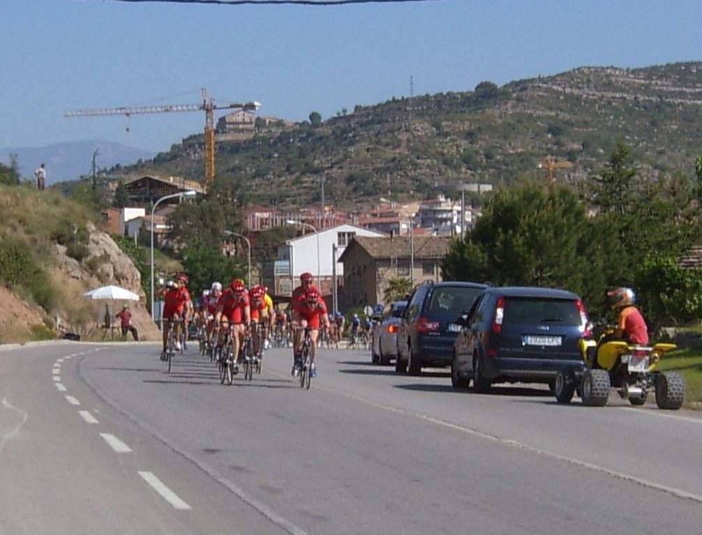 La mayoria era terreno plano descendente pero también habia subidas que se hacian duras por el calor, me mandaron tirar pero di dos relevos y otra vez me mandaron parar, asi que a rueda. Hasta que llegamos al segundo puerto del dia, donde se pusieron Rosendo y Cariñena a tensar, en ese puerto hacia muchisimo calor pero se iba bien ahi metido a rueda. Coronamos y la gente iba ya cansada, se habian eliminado algunos Barcelonas de los que tiraban, yo me puse a tirar bajando con Pol.