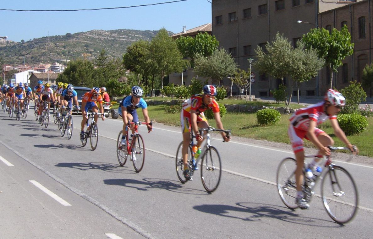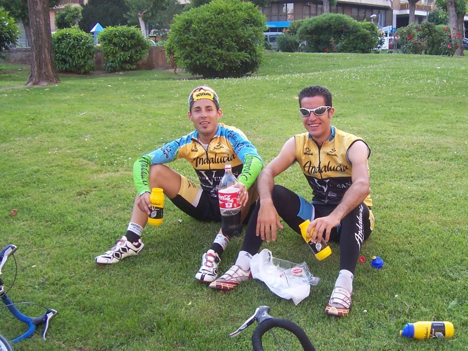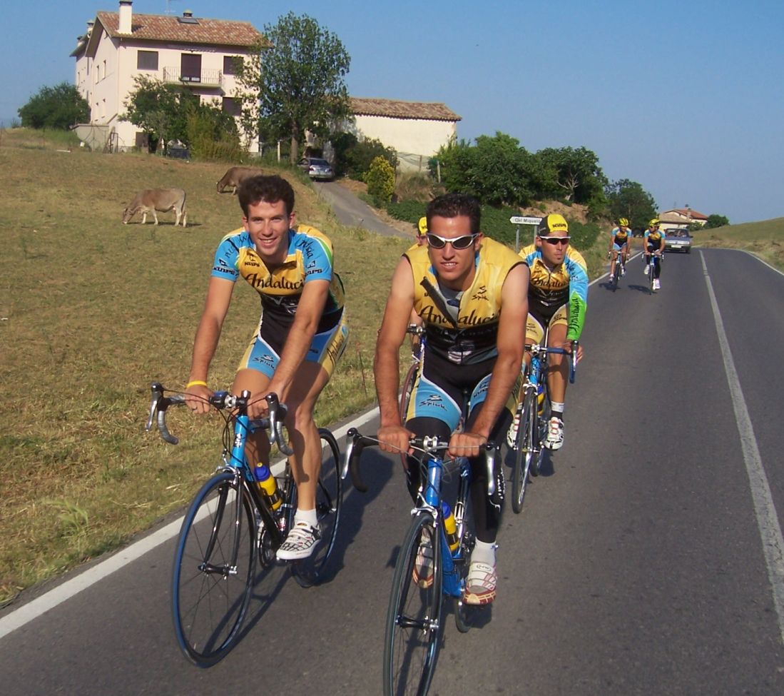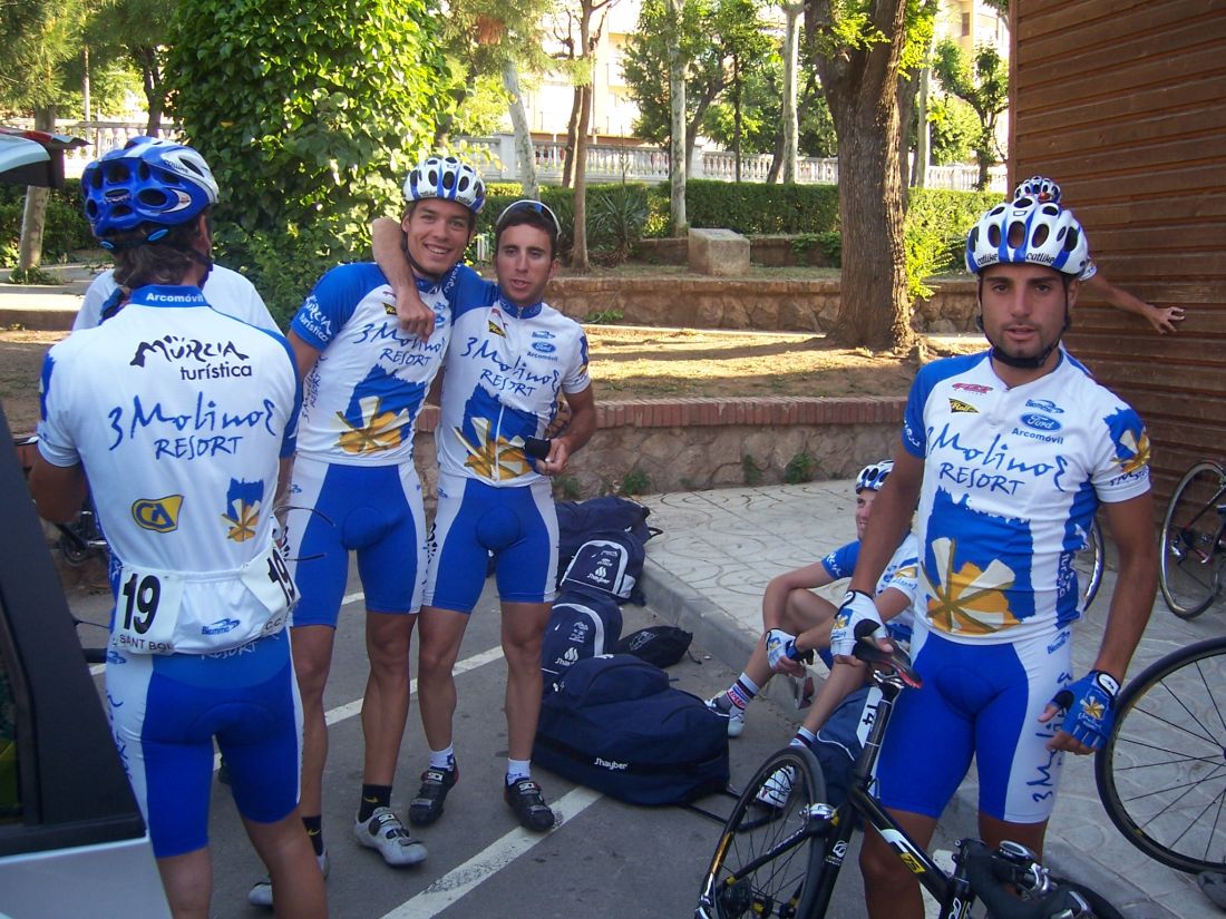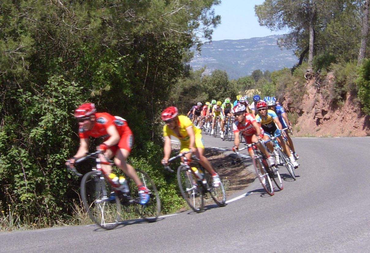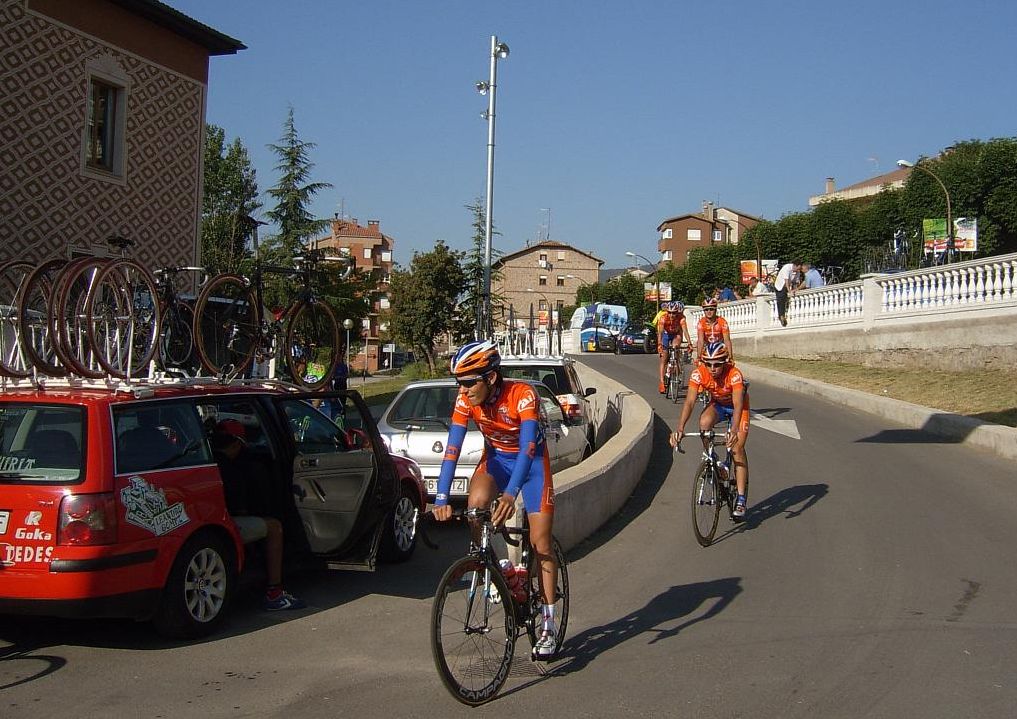 La mayoria era terreno plano descendente pero también habia subidas que se hacian duras por el calor, me mandaron tirar pero di dos relevos y otra vez me mandaron parar, asi que a rueda. Hasta que llegamos al segundo puerto del dia, donde se pusieron Rosendo y Cariñena a tensar, en ese puerto hacia muchisimo calor pero se iba bien ahi metido a rueda. Coronamos y la gente iba ya cansada, se habian eliminado algunos Barcelonas de los que tiraban, yo me puse a tirar bajando con Pol.