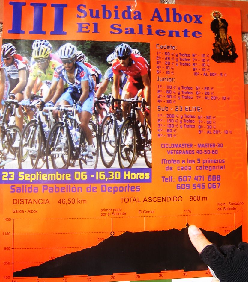 La Subida al Saliente de Albox es una carrera de 46 kms, en la que corrían todas las categorias juntas, aunque luego se separaban los premios. Se hacia dura, por que siempre picaba para arriba, carretera mala, descensos sinuosos, repechos duros y la subida final.