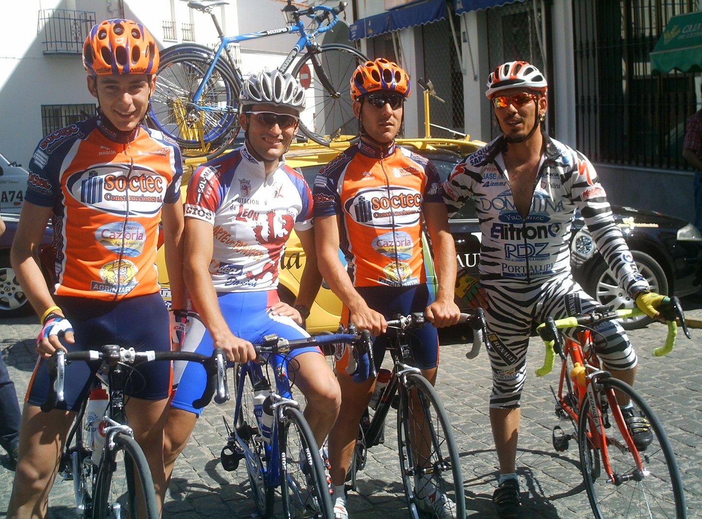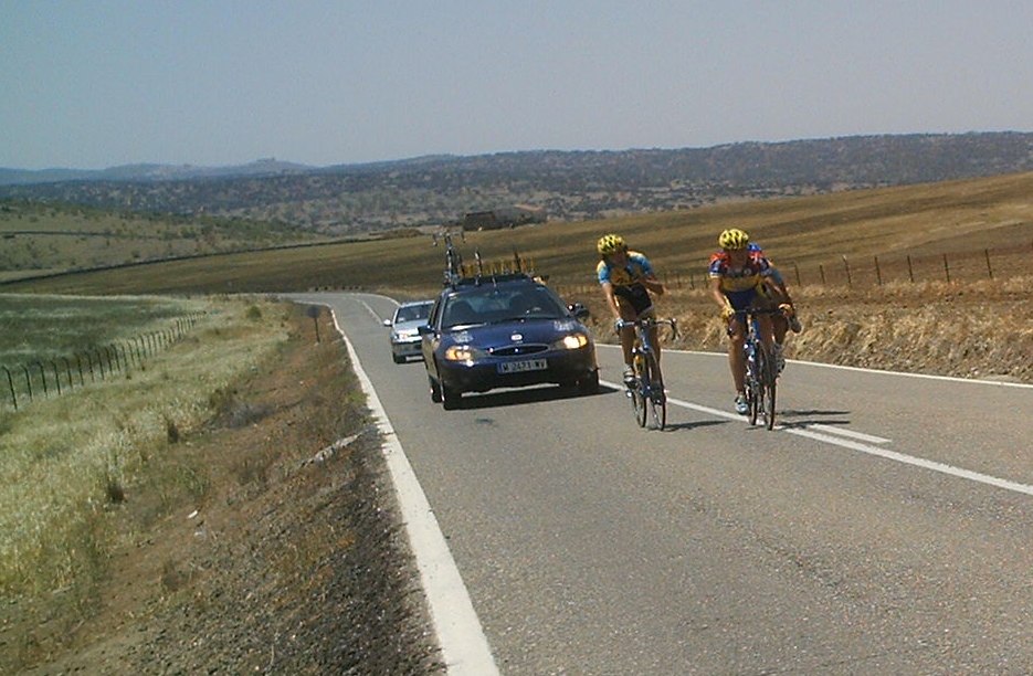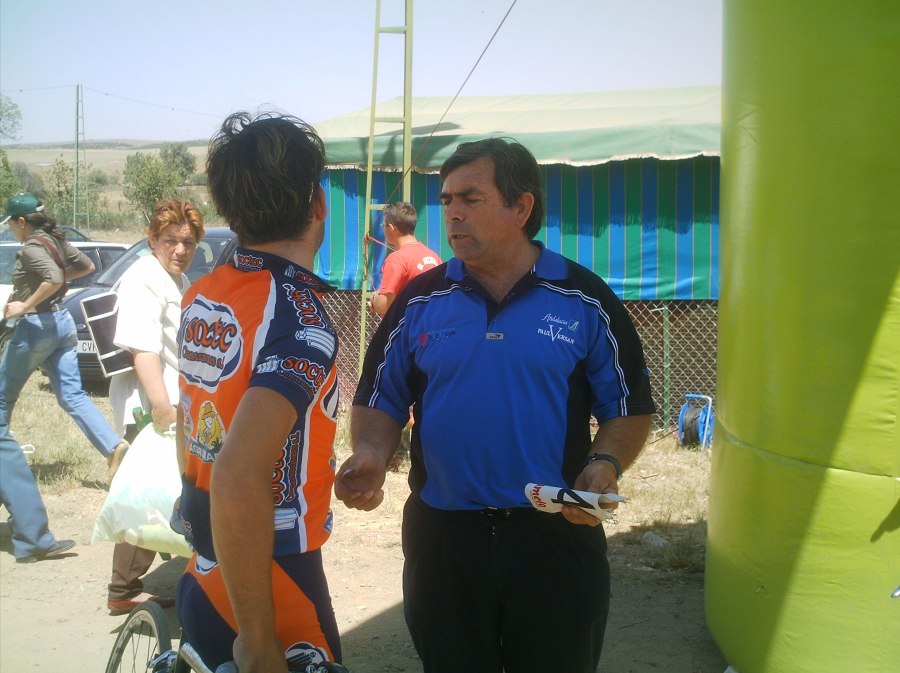 Coroné el puerto dandolo todo todo, habia un aire de cara que iendo solo te quitaba todo lo que tenias, pero yo iba rapido y me cundia, por detras no venia nadie, eso si, yo iba a todo lo que daba, llegué a una pequeña bajada, volvi a subir hacia Monesterio, de repente miro para atras y veo de repente a 5 tios solos con el coche del Paul Versan sin jueces al lado ni nada, vamos , tipico de las romerias estas, no habia nadie y de repente aparecen 3 Paul Versan el Edu y Cidoncha, a la ostia que habia subido yo imposible que me hubiesen recortado, me dijeron que les habian visto meterles coche pero yo no pude verlo.