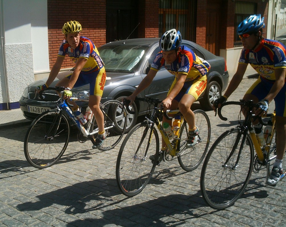 Se salía por la carretera donde estaba el agujero que me comi yo en la Vuelta, alli Abel y yo estuvimos atentos a los ataques hasta que me fui yo con el Frances del Paul Versan, abrimos hueco en el ataque y nos pusimos a tirar millas, este no era Extremeño, asi que no era peligroso para Abel, que queria disputar el Campeonato de Extremadura.