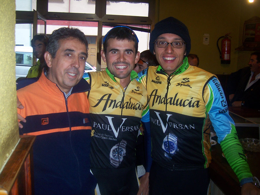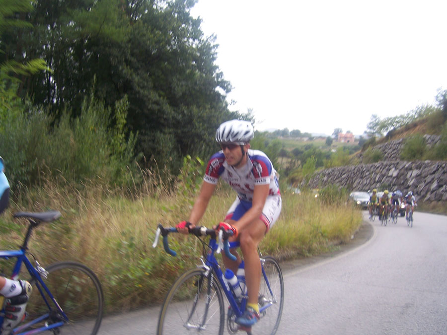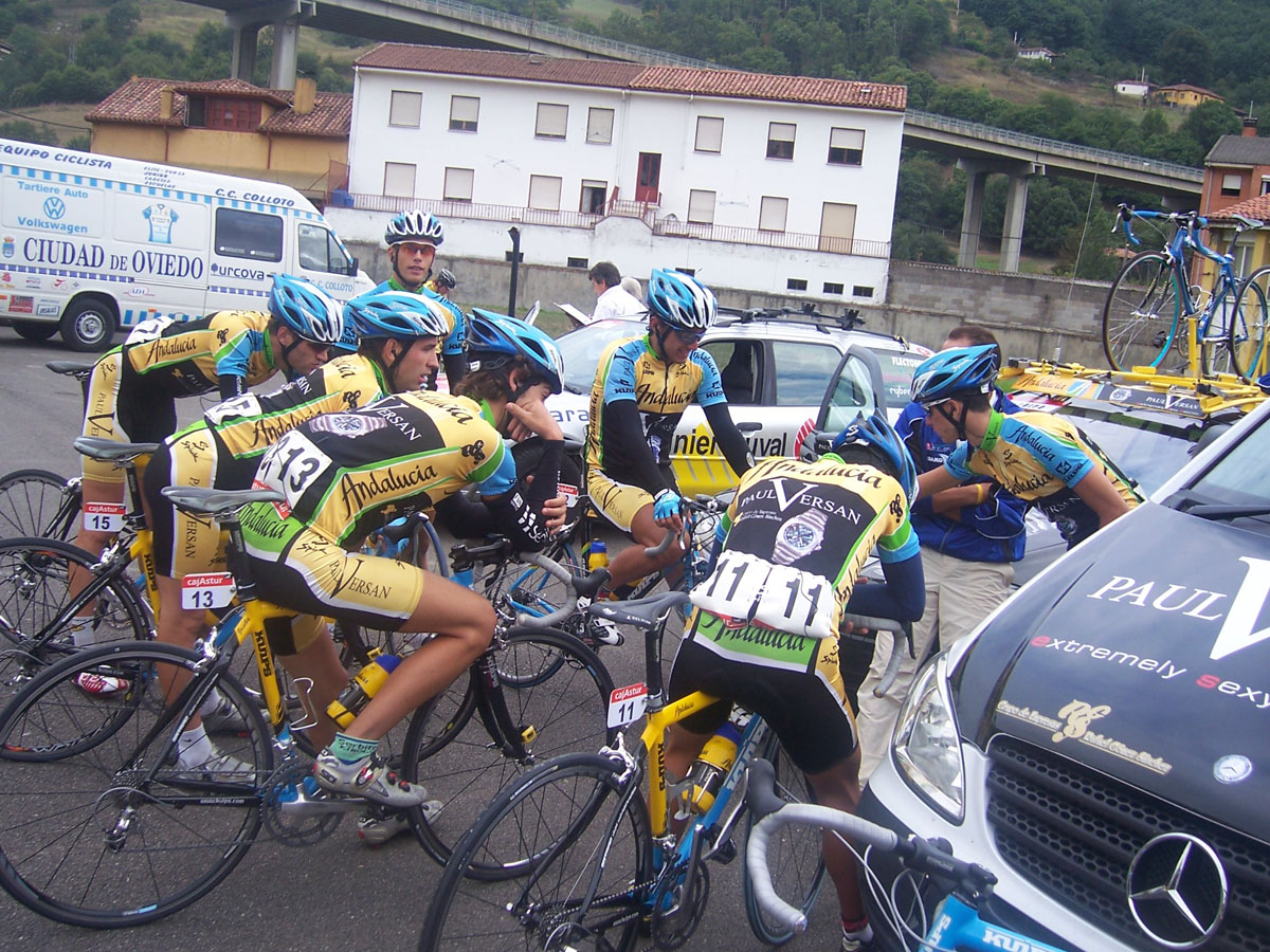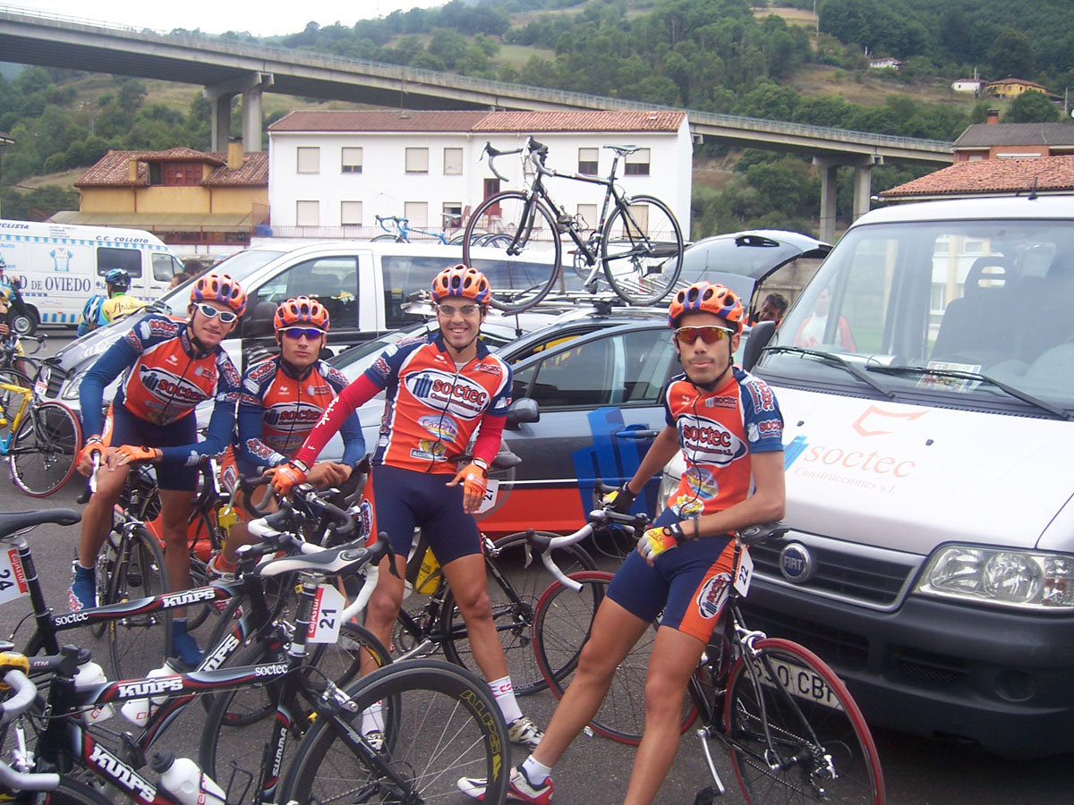 En un repecho largo que habia despues del primer puerto David Perez se puso a tensar hasta que nos fuimos 9 tios, David Perez iba tirando a una ostia impresionante, yo aguante ahi como pude hasta que coronamos y se consolido la escapada, ibamos Sergio y yo, Mario del Andalucia, Estrada de Soctec, Cima del Oviedo.. Llegamos a la segunda Meta Volante, Sergio y yo esprintamos uno por cada lado, paso el primero, Estrada segundo y yo tercero, justo despues empezaba otro puerto, empezo a tensar Perez, yo iba bien pero al final empeze a tener problemas serios, tan serios que me revento a poco de coronar y ahi quedé, teniamos 2 minutos de ventaja, fue una pena.