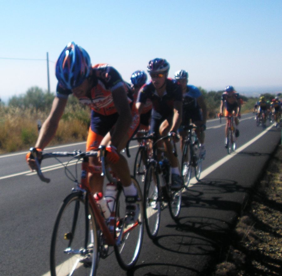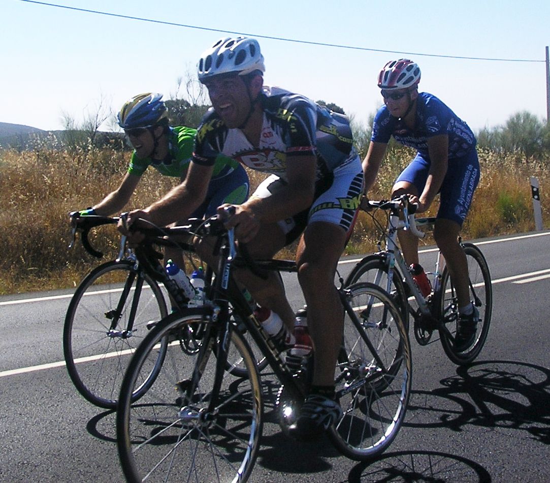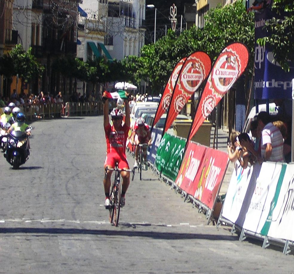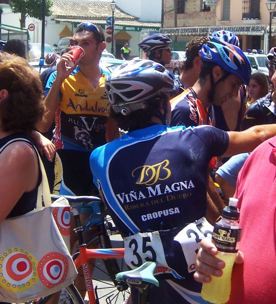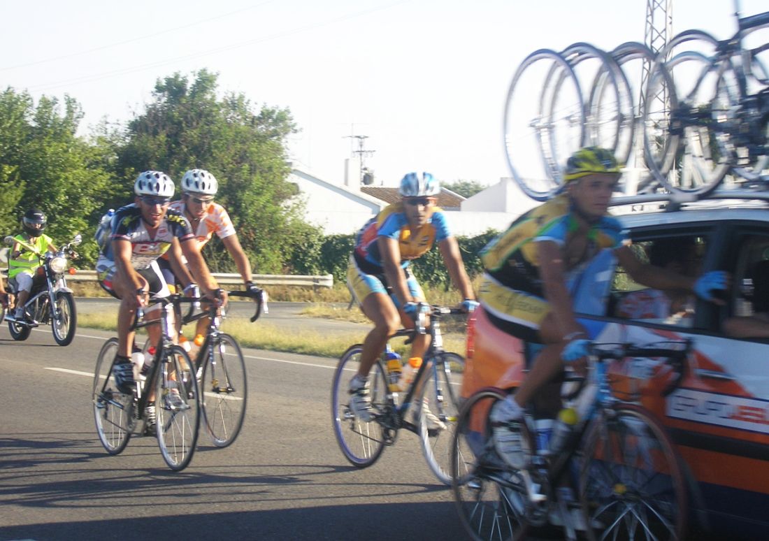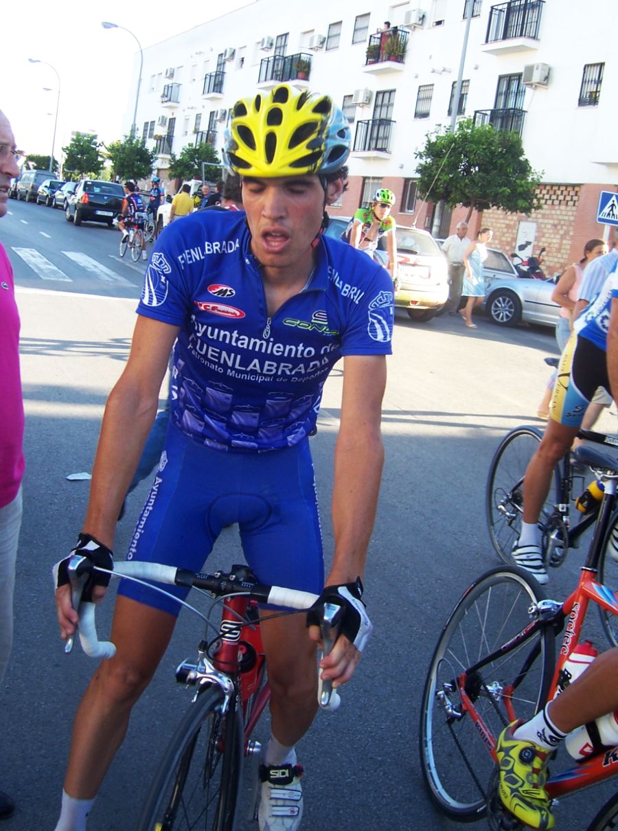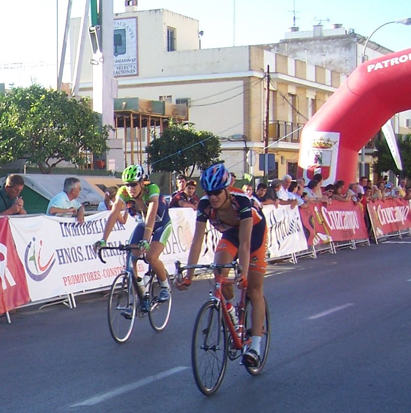 En las calles de Huevar se puso a tirar Jorge Pimienta, yo que habia ido tirando perdi unos metros cuando me dio el relevo, quise cerrar el hueco tumbando mas de la cuenta en una de las curvas del descenso del pueblo donde empezaban los adoquines y sin saber como aparecí en el suelo, no se que hice para caerme pero toda la culpa fue mia, no me tiro nadie, esa curva esta maldita. El año pasado fue donde se cayeron Piedra y Comino subiendo en el Campeonato de Andalucia, se cayeron hasta subiendo, yo bajando pues se me fue la bici, pavimento brillante con el calor..