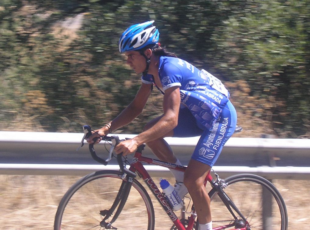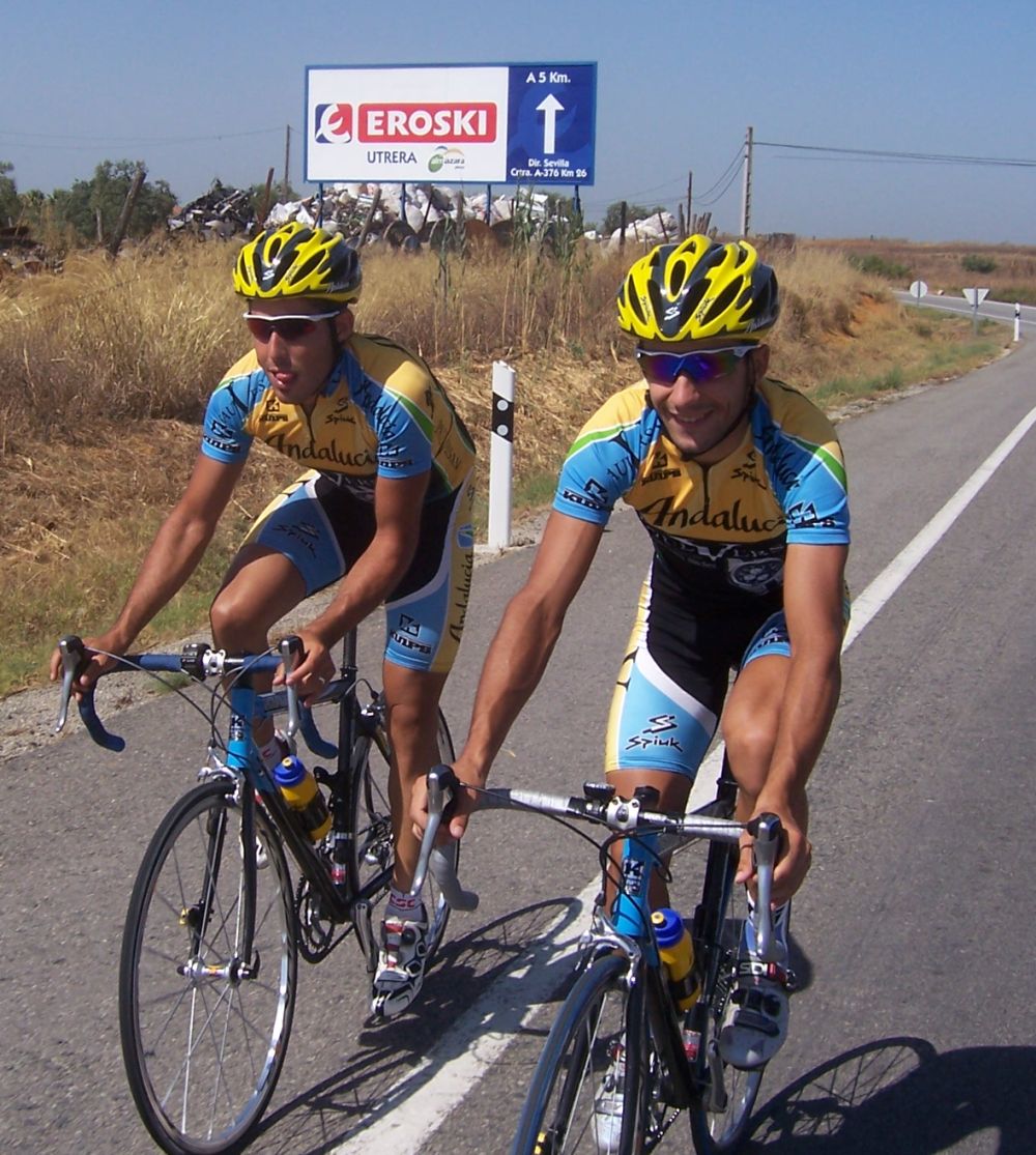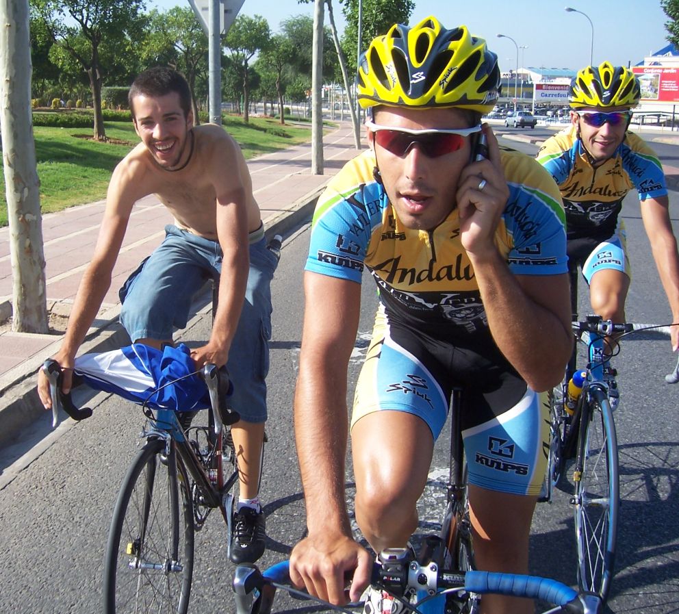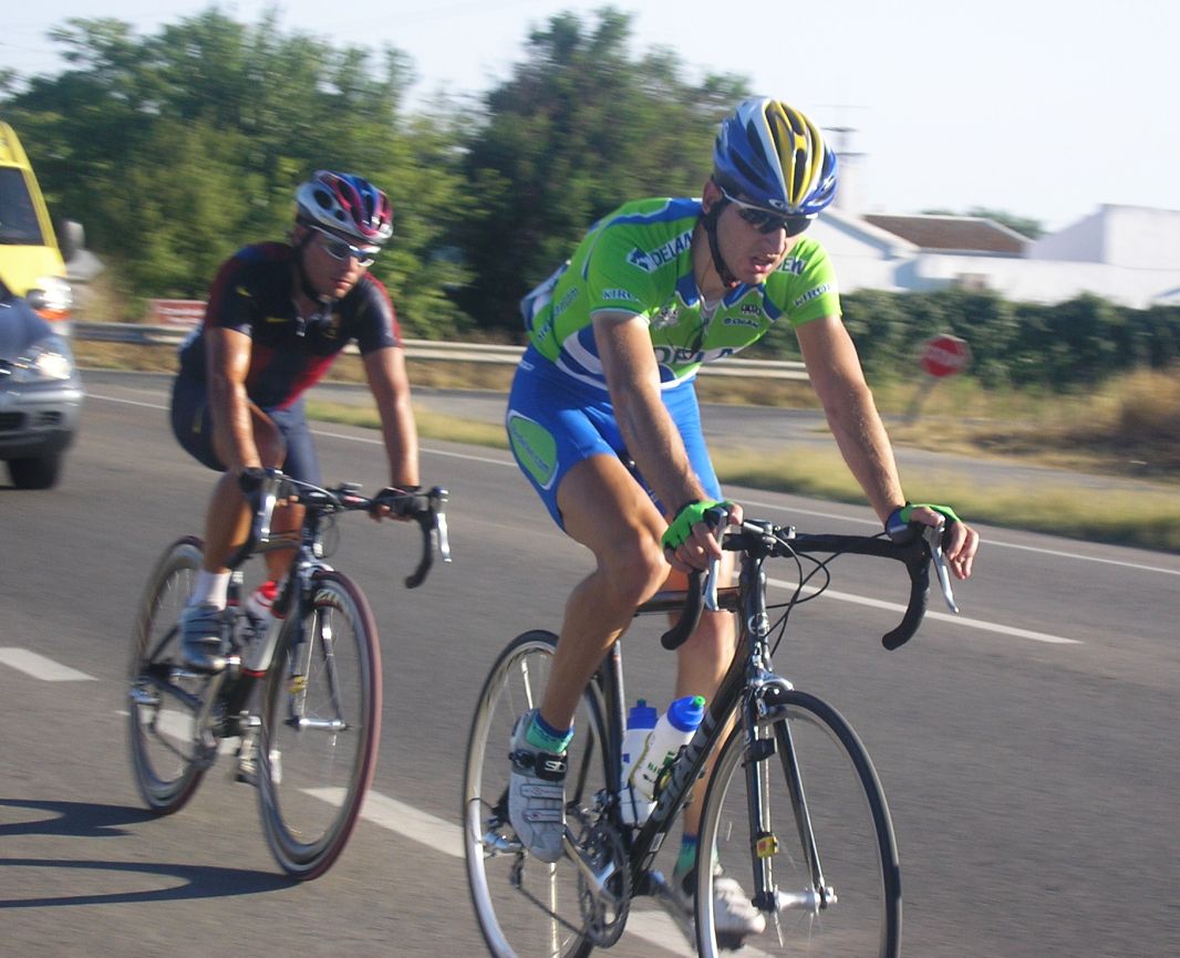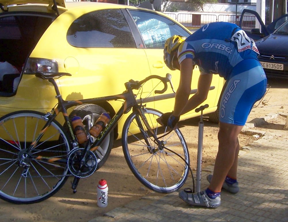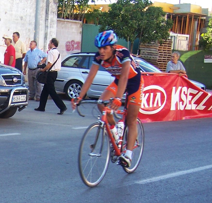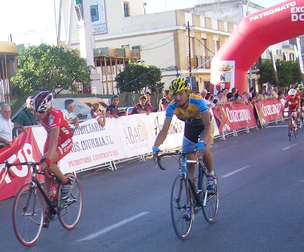 En las calles de Huevar se puso a tirar Jorge Pimienta, yo que habia ido tirando perdi unos metros cuando me dio el relevo, quise cerrar el hueco tumbando mas de la cuenta en una de las curvas del descenso del pueblo donde empezaban los adoquines y sin saber como aparecí en el suelo, no se que hice para caerme pero toda la culpa fue mia, no me tiro nadie, esa curva esta maldita. El año pasado fue donde se cayeron Piedra y Comino subiendo en el Campeonato de Andalucia, se cayeron hasta subiendo, yo bajando pues se me fue la bici, pavimento brillante con el calor..
