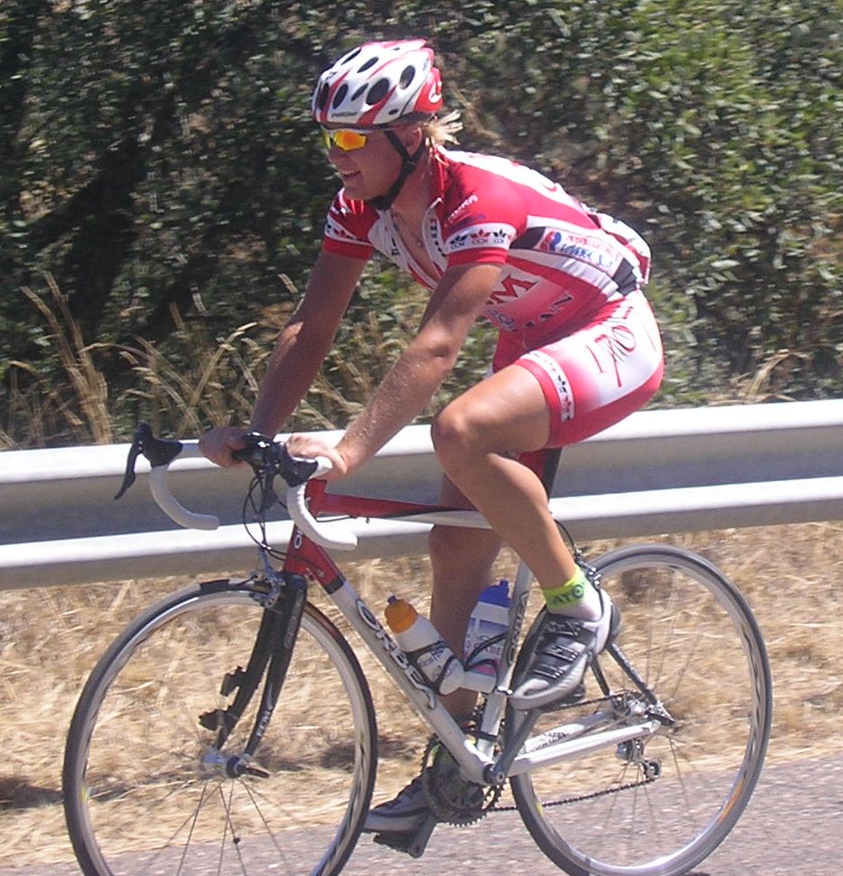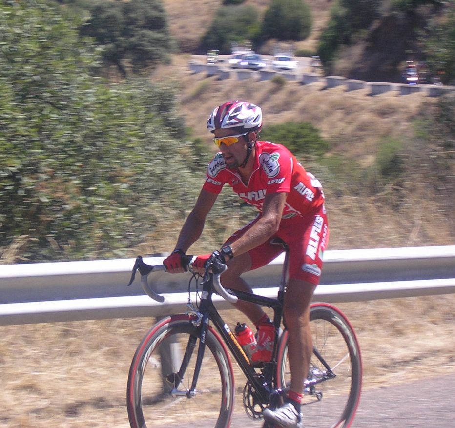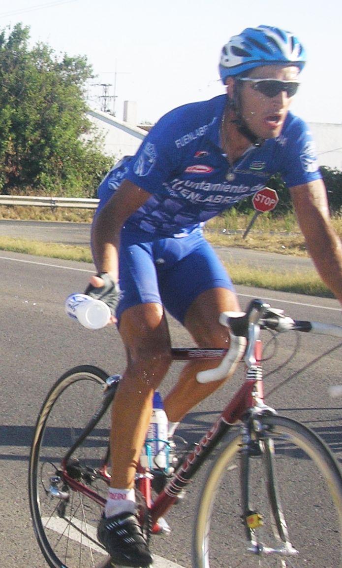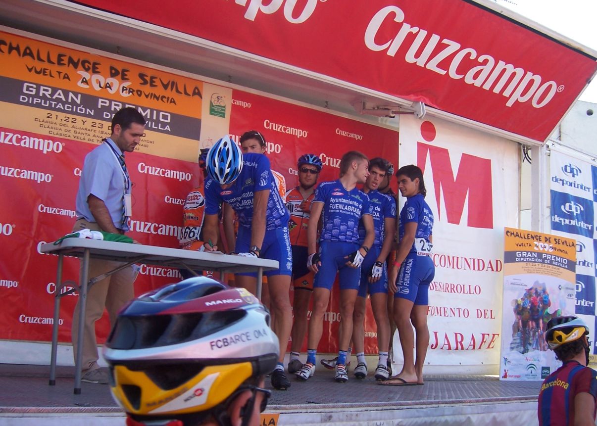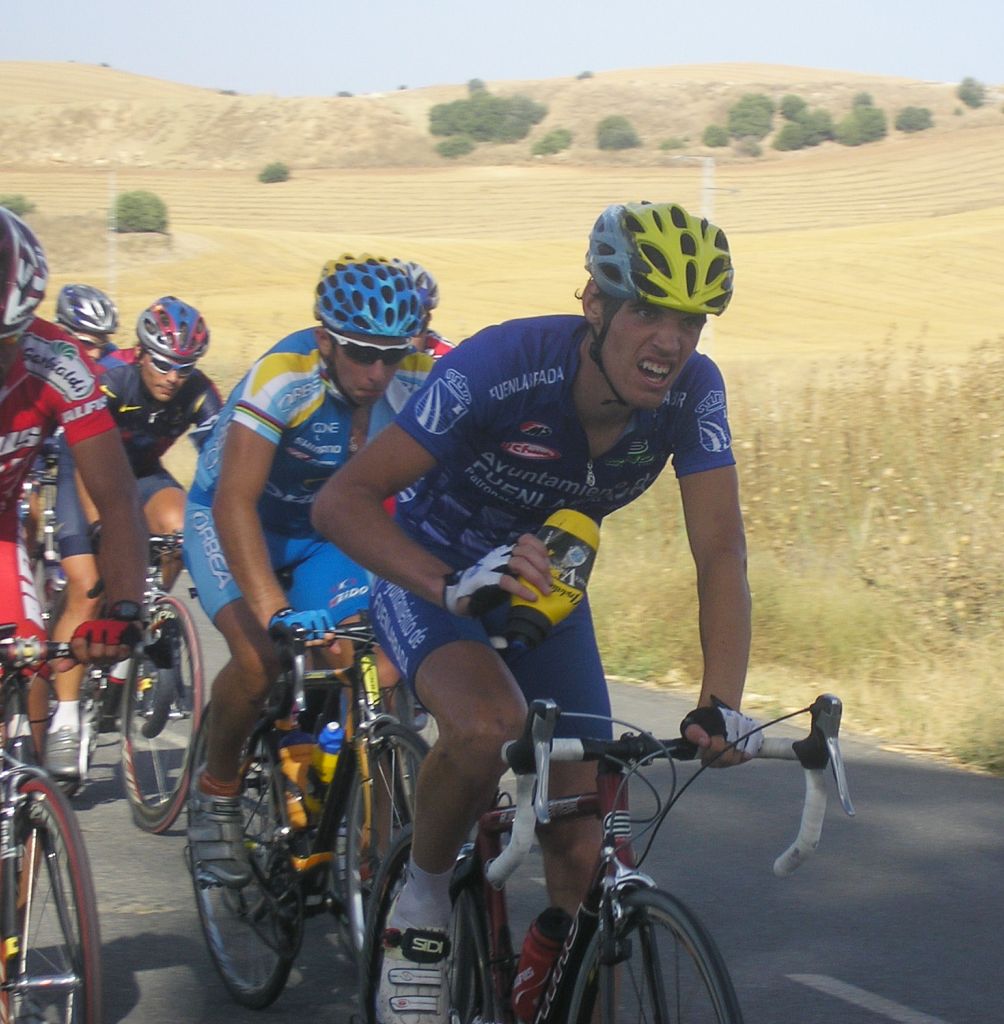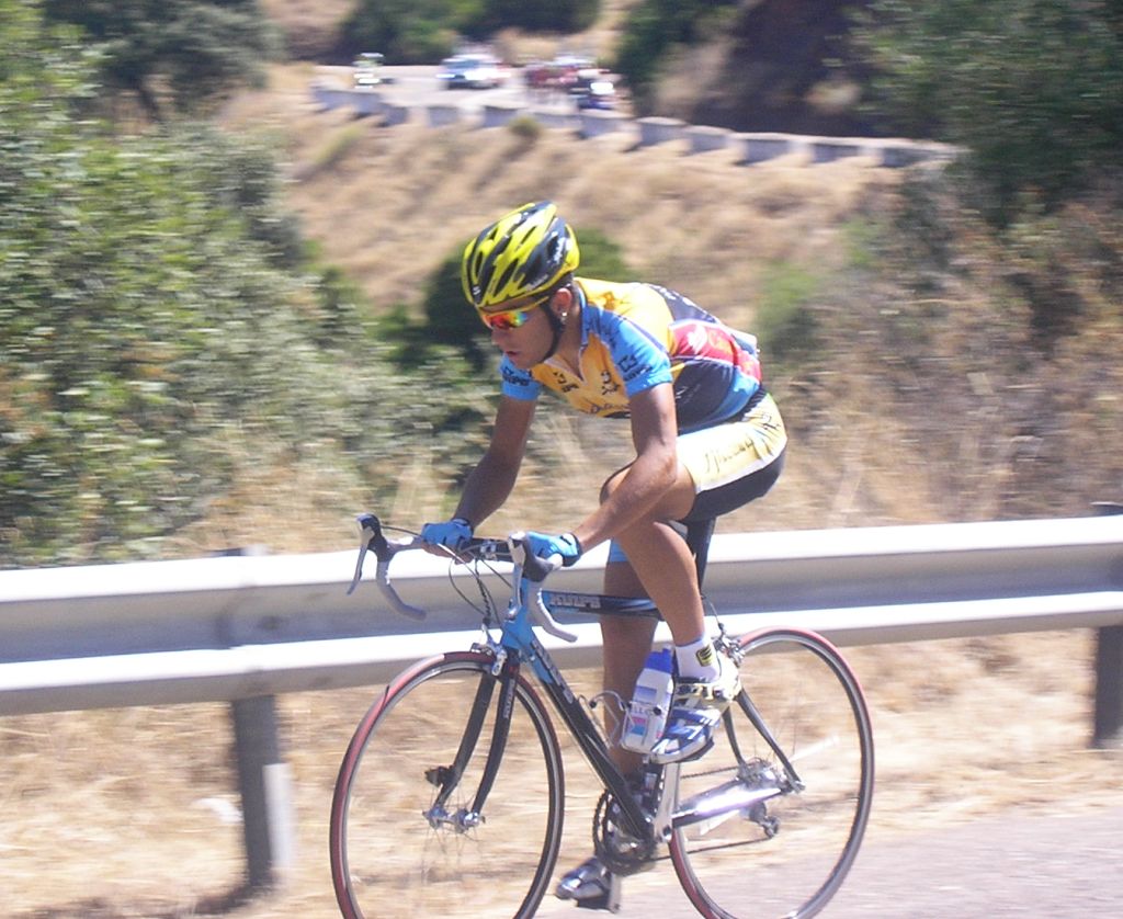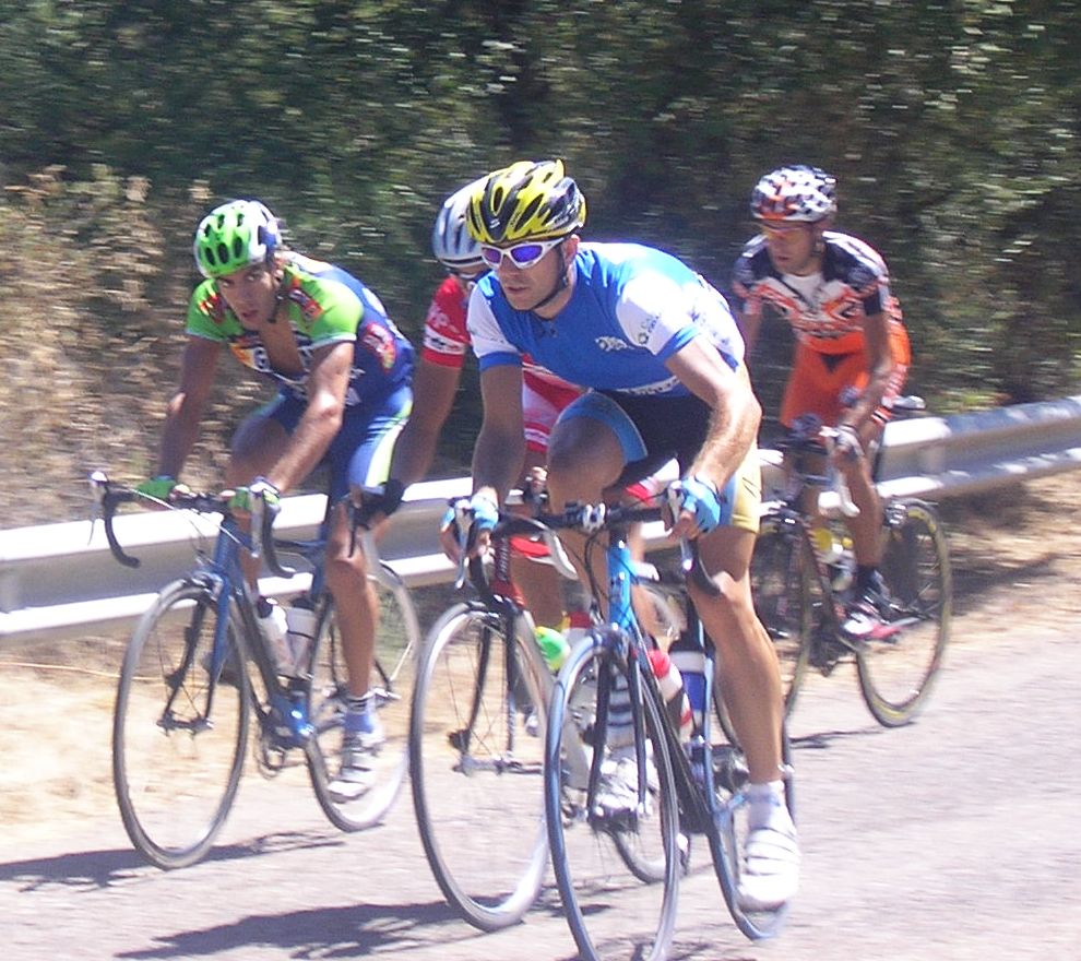 En las calles de Huevar se puso a tirar Jorge Pimienta, yo que habia ido tirando perdi unos metros cuando me dio el relevo, quise cerrar el hueco tumbando mas de la cuenta en una de las curvas del descenso del pueblo donde empezaban los adoquines y sin saber como aparecí en el suelo, no se que hice para caerme pero toda la culpa fue mia, no me tiro nadie, esa curva esta maldita. El año pasado fue donde se cayeron Piedra y Comino subiendo en el Campeonato de Andalucia, se cayeron hasta subiendo, yo bajando pues se me fue la bici, pavimento brillante con el calor..