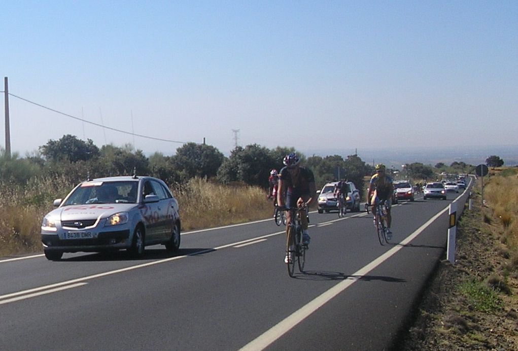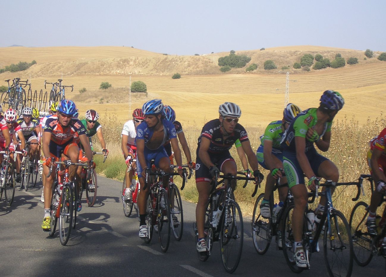 Cada vez los cortes tenian mas consistencia, me meti en uno de 20 tios, demasiado, duro bien poco, pero se notaba que las fuerzas iban mermando segun pasaban los kilometros y el calor aumentaba, subimos el repecho de huevar encunetados, muy deprisa, pero fue ahi donde se hizo parte del corte bueno, se marcharon unos pocos ahi, luego pasando Huevar otros pocos y llegamos al inicio del puerto.