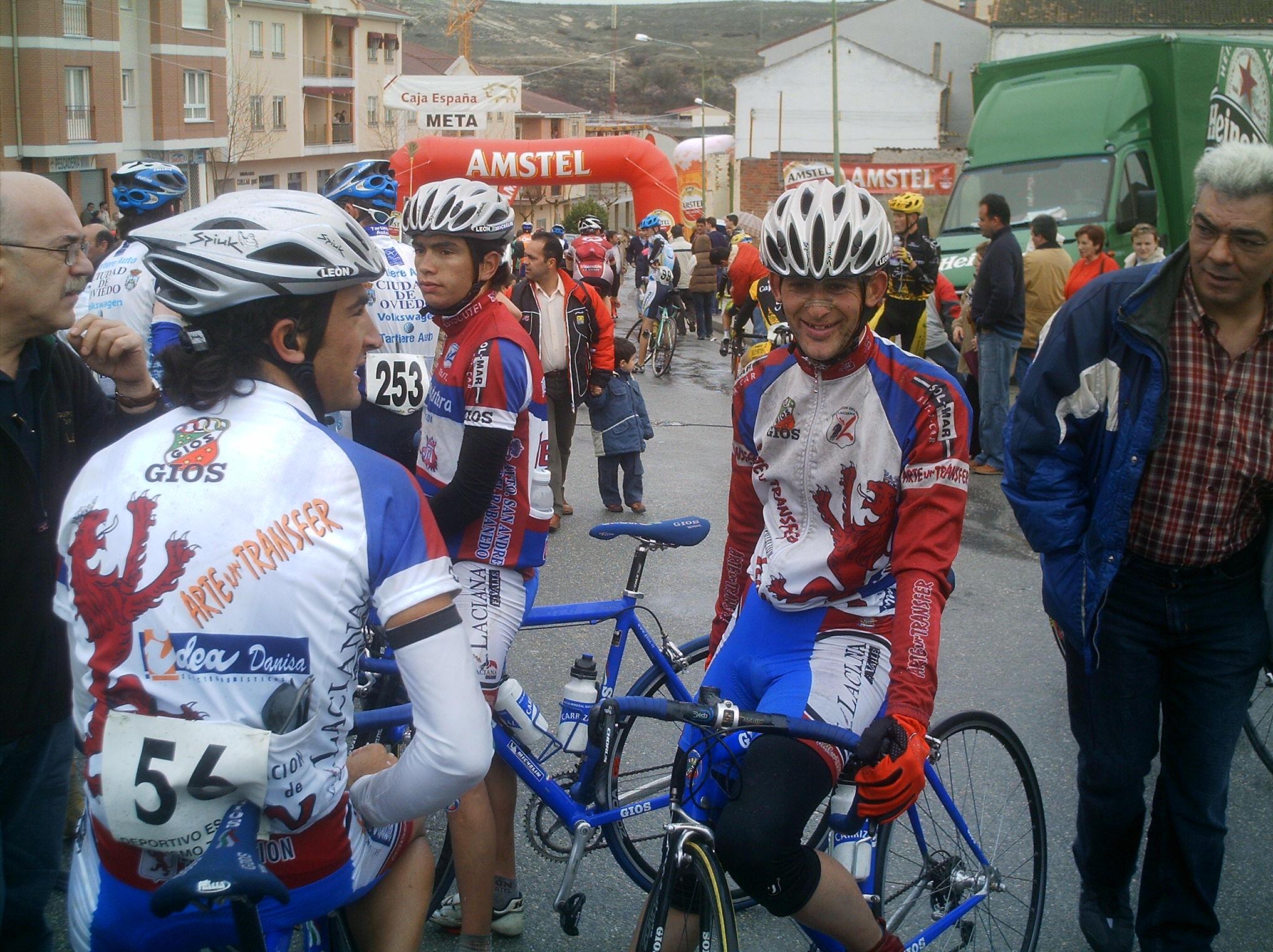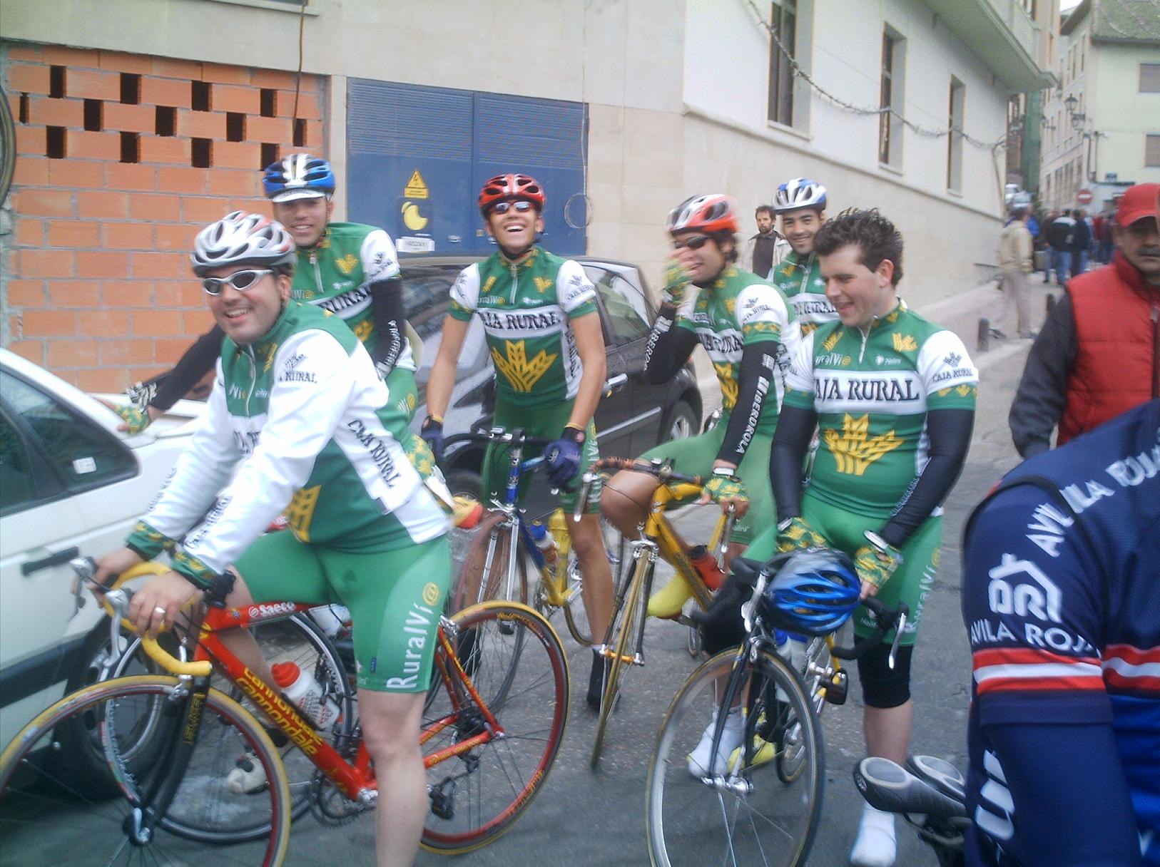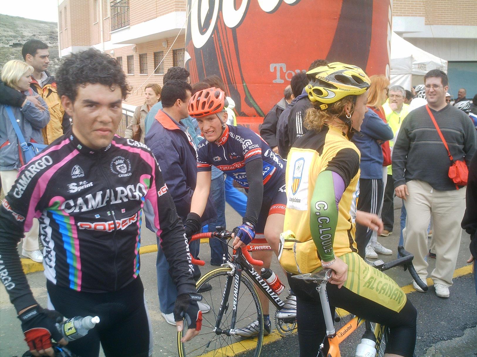 Por lo menos si llegamos a la Meta Volante, que paso primero Abel y segundo yo, ibamos ahi sumando puntos para ganarla alguno del equipo, llevabamos un monton de kms fugados a tope y no abriamos hueco!! No desistimos, seguimos apretando y manteniamos, pero fue tonteria por que nos acabaron cogiendo. Fue un gran chasco, pero una chiruca no es como una vuelta, en una vuelta si te cogen han ido todos a rueda de los CCM o de los Kelme o del tipico equipo que le toca tirar del carro y van todos fumando, aqui no, aqui van menos jodidos que tu pero por el estilo por que han ido a ostias todo el rato. Asi que seguimos arrancando el Abel y yo hasta que nos fuimos, llegamos a la cuarta subida de Cuellar, iba yo haciendola a muerte cuando me arranco un Roper, digo me cawen... ostias, si es el Rojo, joder el Rojo como iba!! Llegamos 5 escapados a la Meta Volante de cuellar, yo la lanzé y Abel la gano, yo segundo y la general de las Metas Abel las gano con 8 puntos y yo segundo con 7, le tocaba ganarlas a el. Carrasco tercero, arramplamos con todo.