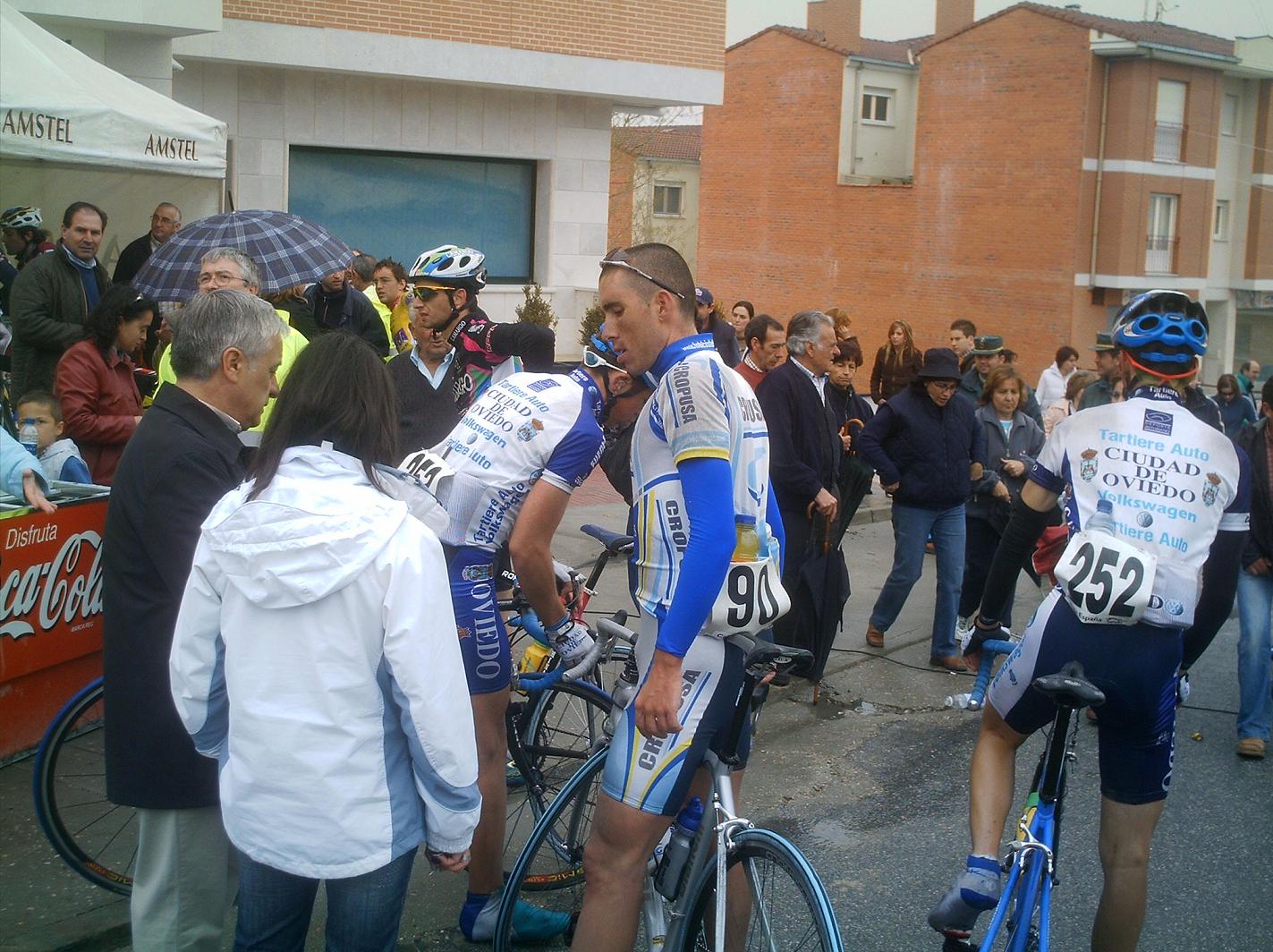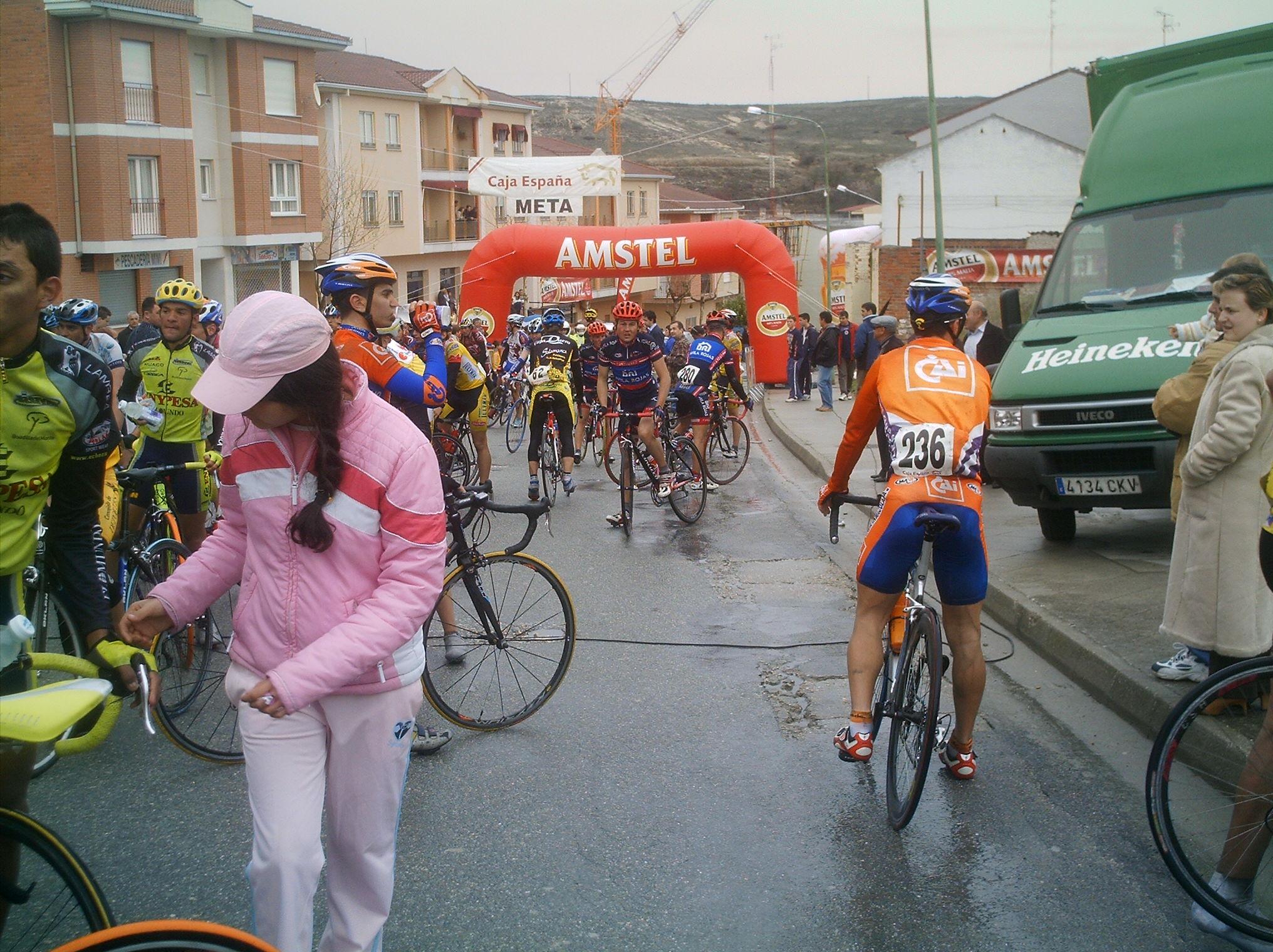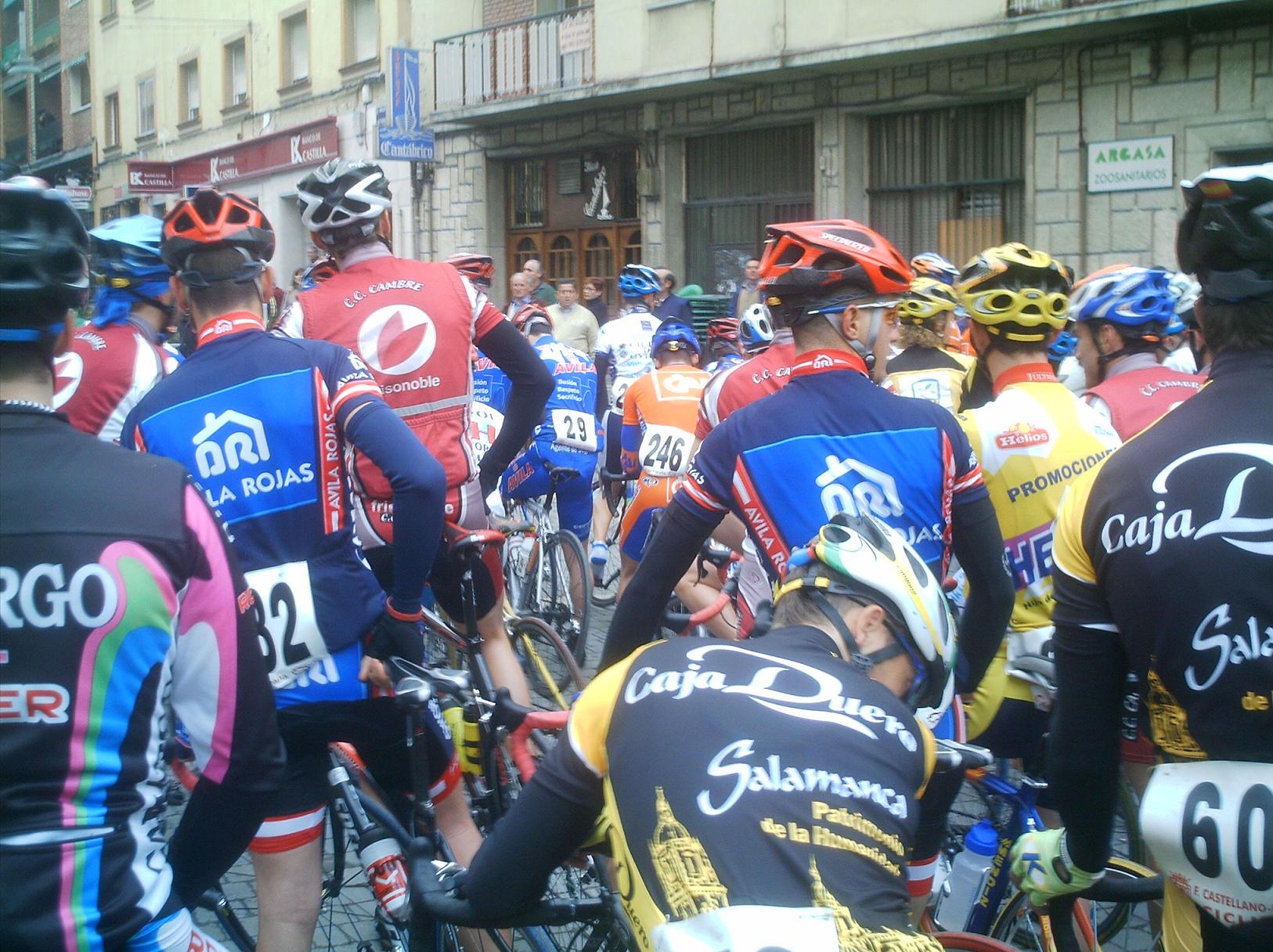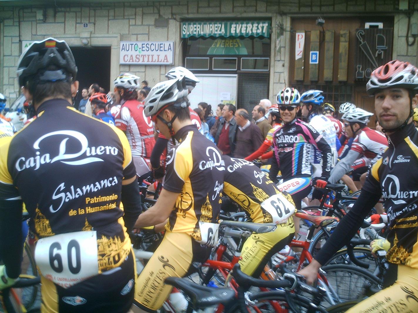 Menudo frio y lluvia hizo en Cuellar, no nos paró en toda la carrera, los primeros kilometros los hice en la oficina to pelao de frio hasta que empezé a arrancar en el km 3 o 4, no pare de hacerlo hasta meta... Aunque al principio arrancaba todo el mundo, se iba rapidisimo y era tonteria arrancar, se llego a la primera Meta Volante, eran 5 y asi ganarlas es tarea dificil, la lanzaron Abel Fragua y el Carras, el Carras ganó el sprint de la meta Volante de todo el peloton y Abel segundo.