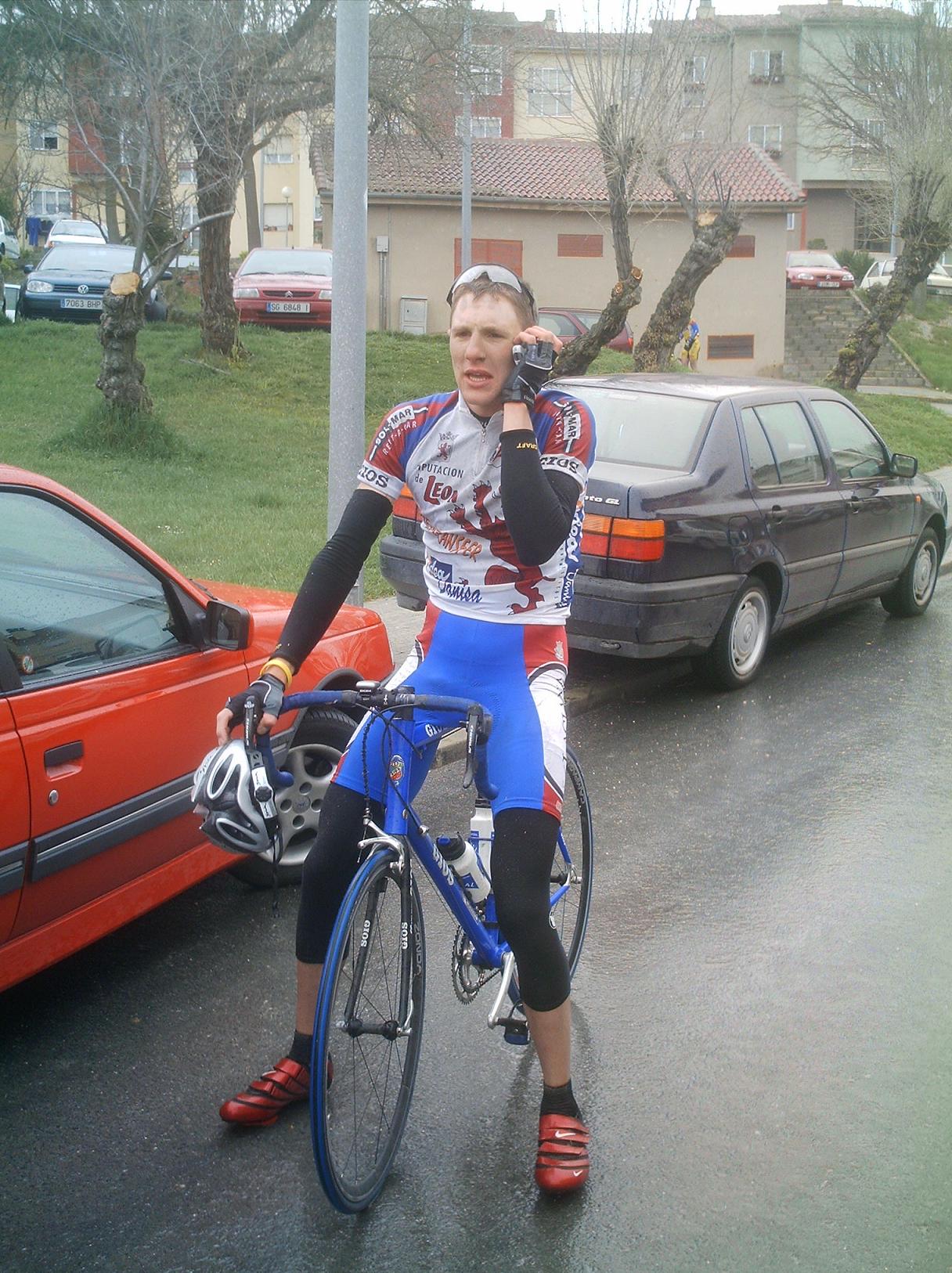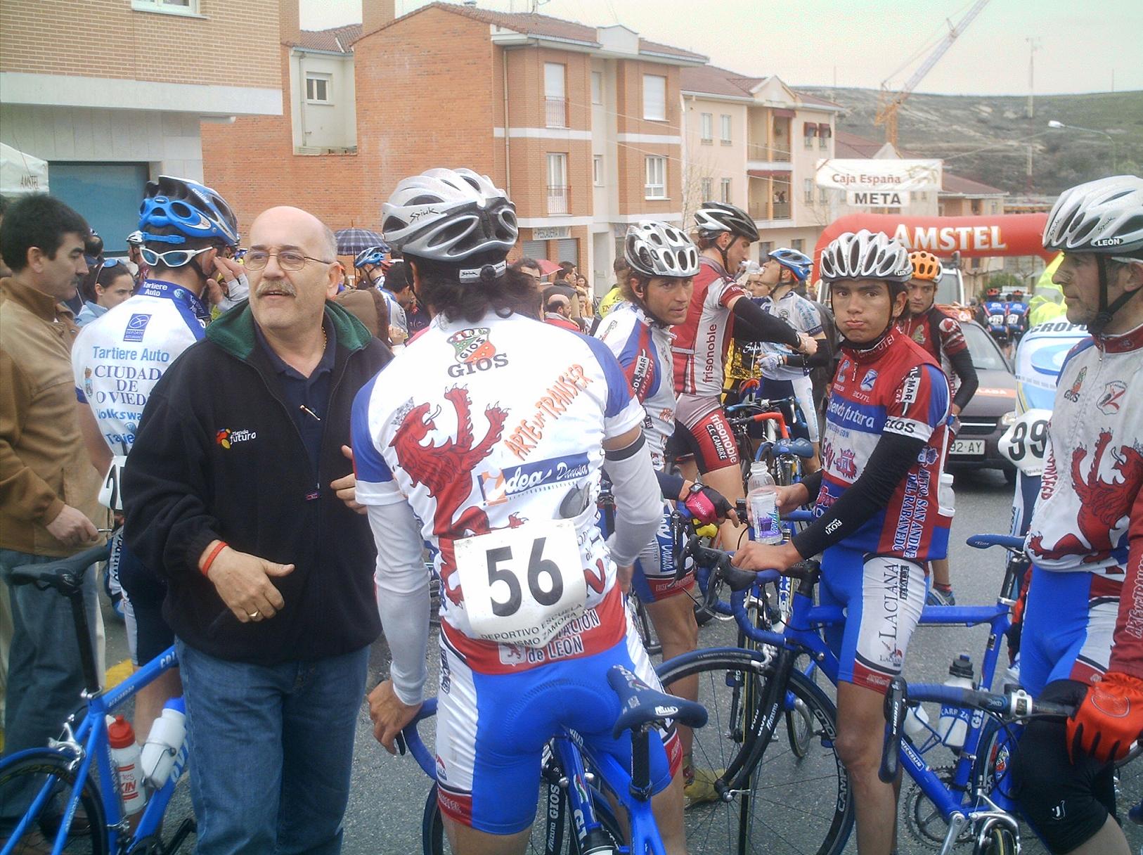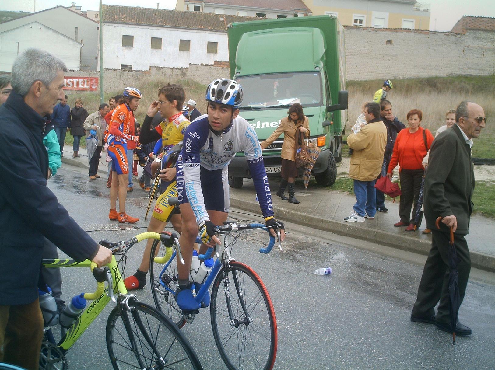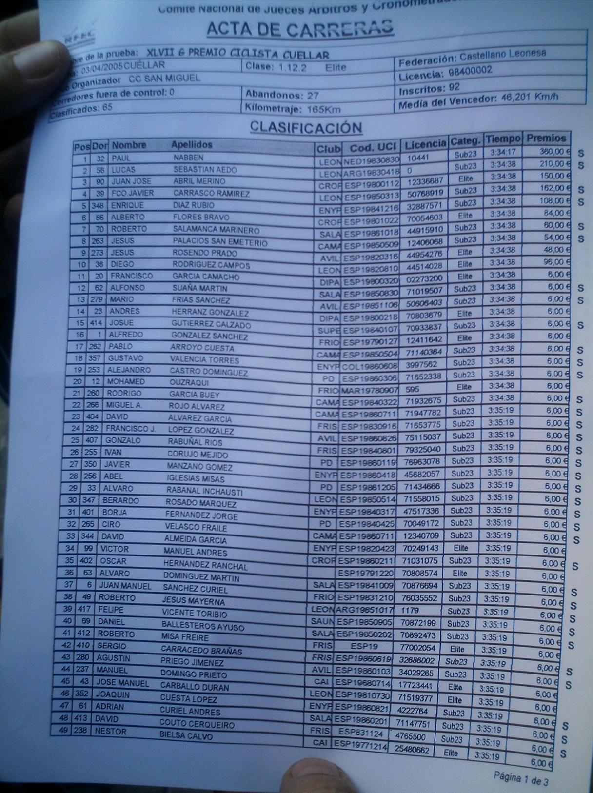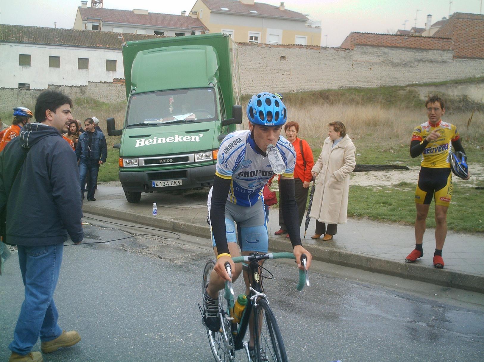 Menudo frio y lluvia hizo en Cuellar, no nos paró en toda la carrera, los primeros kilometros los hice en la oficina to pelao de frio hasta que empezé a arrancar en el km 3 o 4, no pare de hacerlo hasta meta... Aunque al principio arrancaba todo el mundo, se iba rapidisimo y era tonteria arrancar, se llego a la primera Meta Volante, eran 5 y asi ganarlas es tarea dificil, la lanzaron Abel Fragua y el Carras, el Carras ganó el sprint de la meta Volante de todo el peloton y Abel segundo.