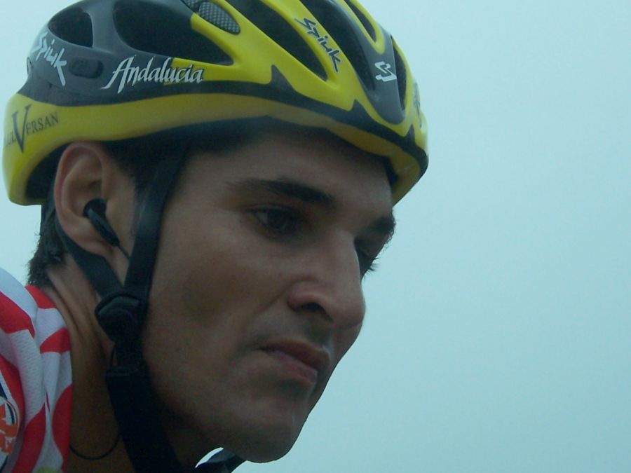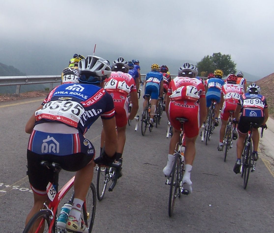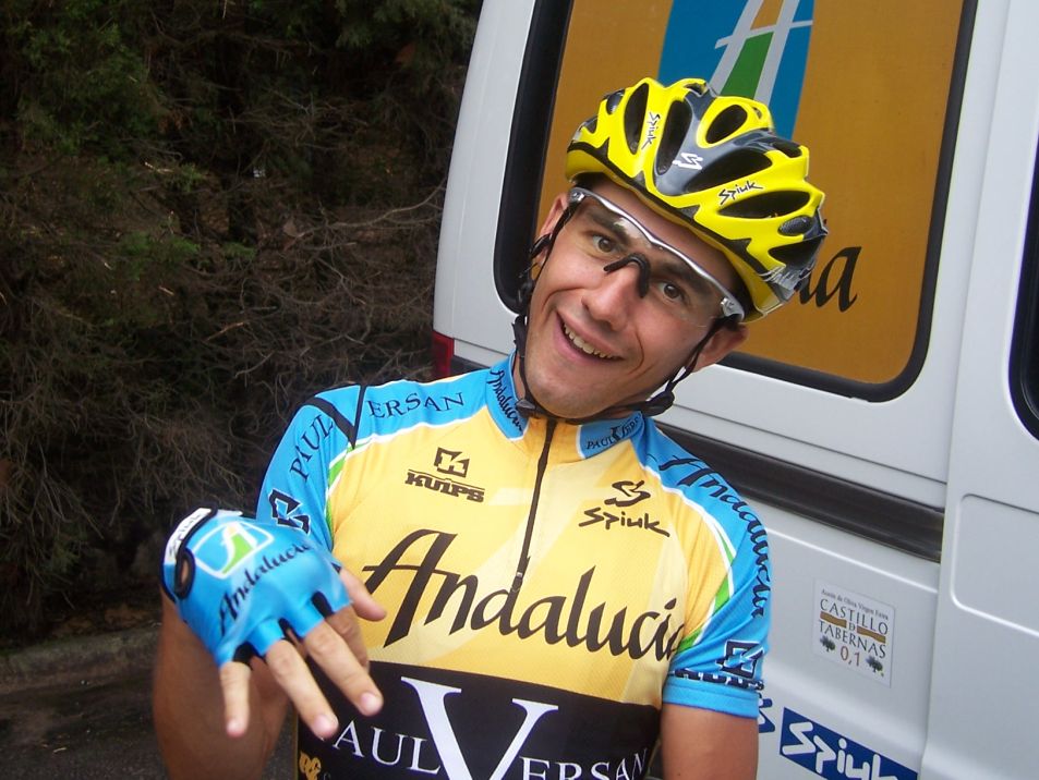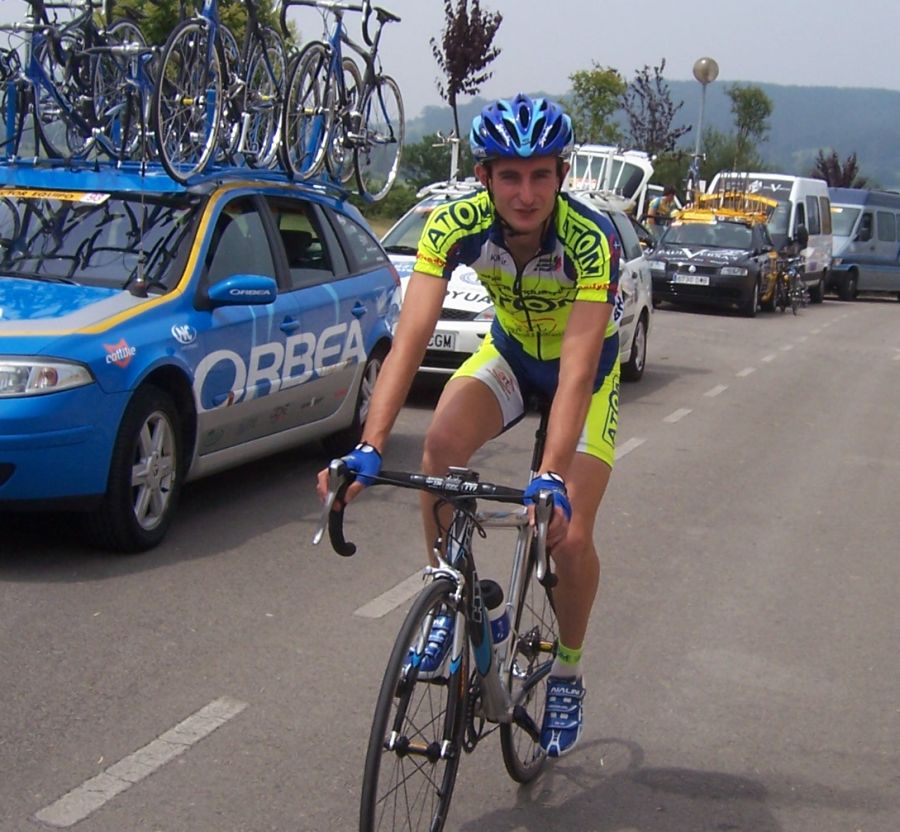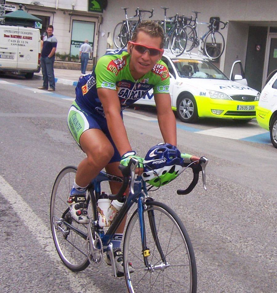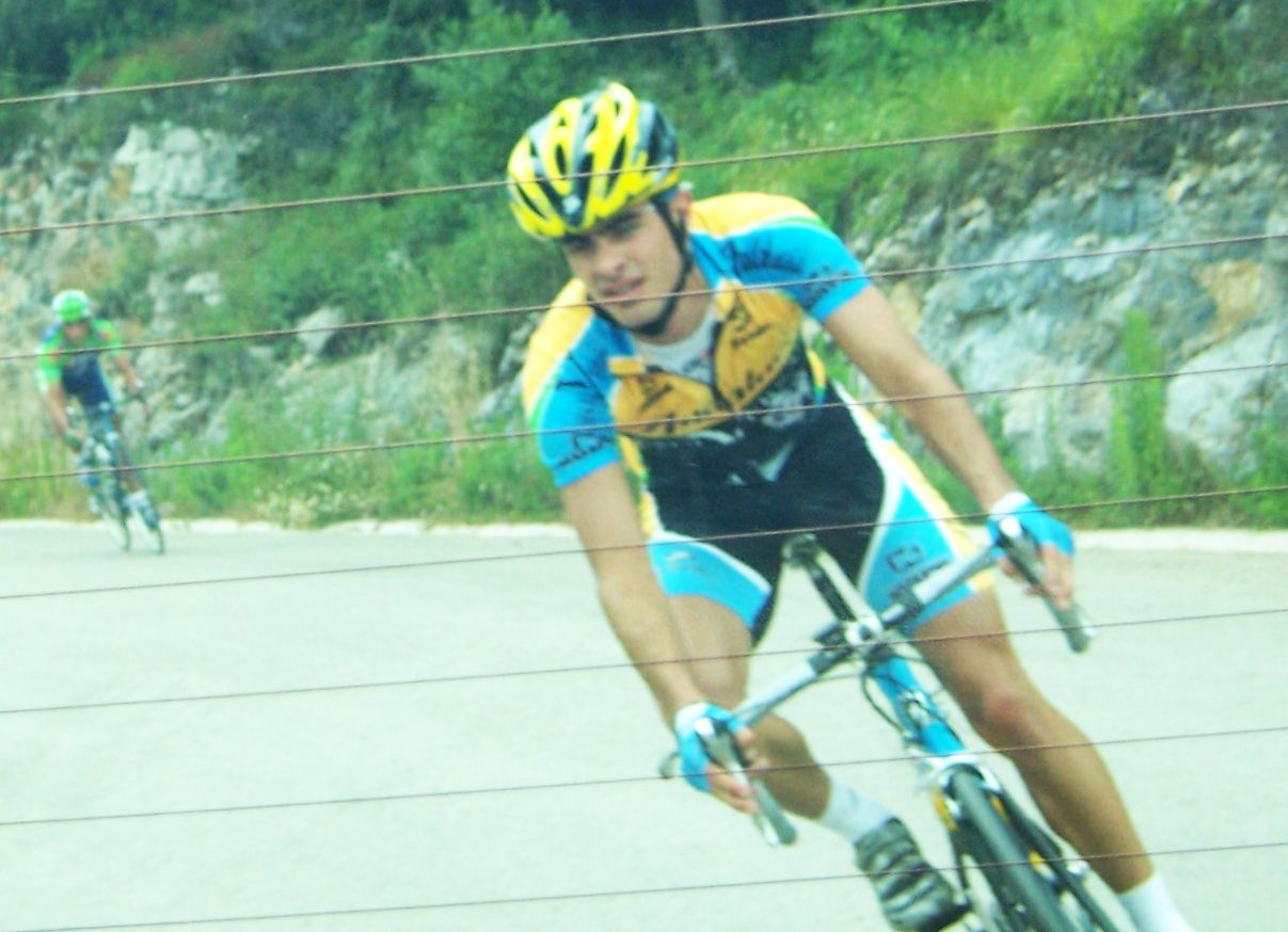 Cariñena viviendo en sus carnes el sufrimiento del Circuito Montañés, con el mallot de lider de la Montaña.