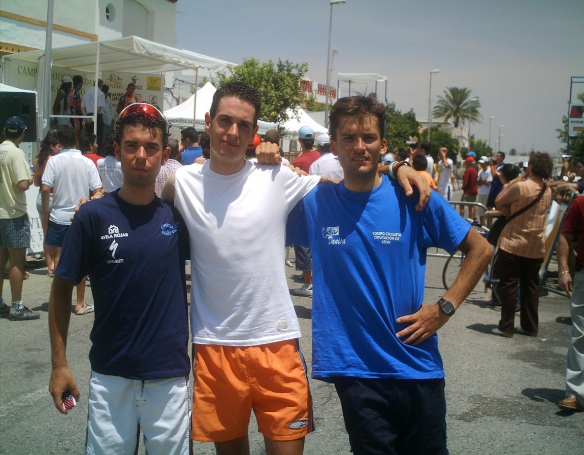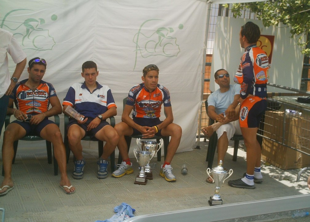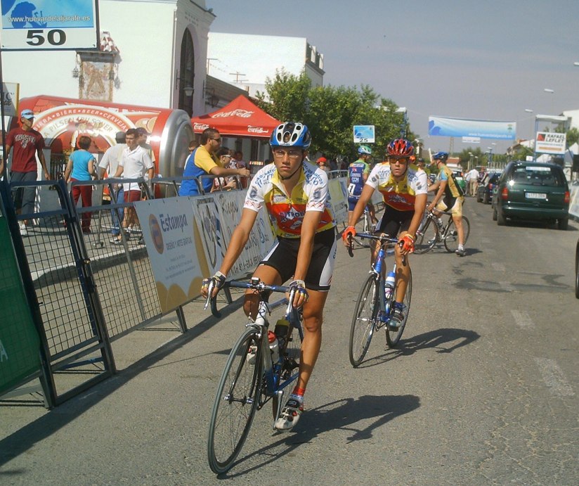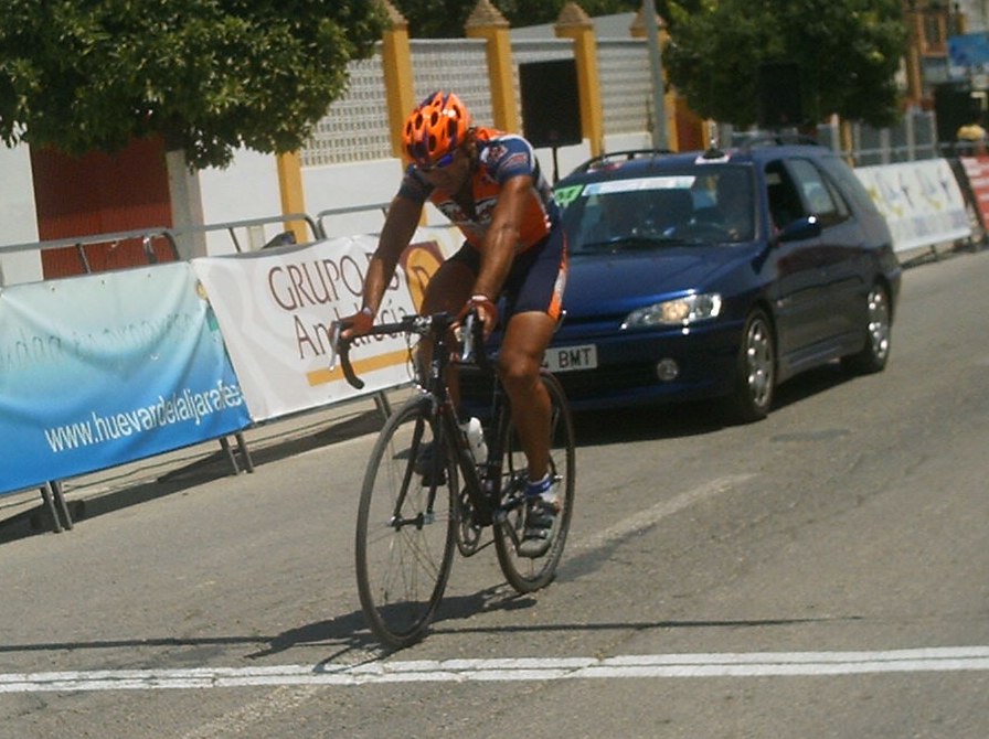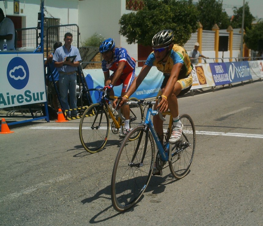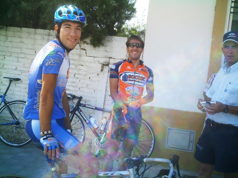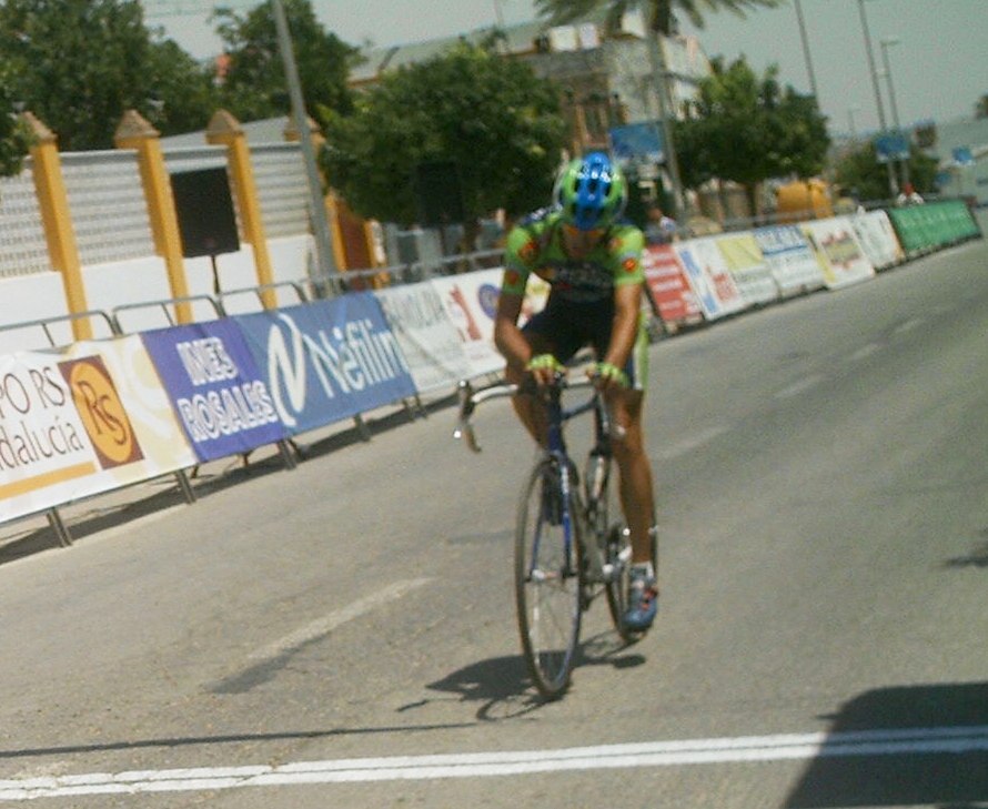 Tuve momentos jodidos, el calor aumentó y aquello empezó a convertirse en un infierno sobre todo para mi, que llevaba mes y pico en Villablino a 20 grados, vine aqui y el aire este que sopla por estas latitudes puede ser tan calido como el que sale de un tubo de escape, cada 5 kms necesitaba un bote de agua, lo pillaba como podia, sudaban los brazos, las piernas, me iba a derretir, menos mal que las etapas de la Vuelta a Cordoba son a las 12, teneis que venir, jejejje, al final en la ultima vuelta como que iba algo mejor, empezamos a atacarno, yo fui el que empeze a remover la mierda en un repecho, pero llegamos cinco para disputarnos el octavo y el bronce elite entre Rosendo, Edu y yo, Marranete habia ganado el Oro y Comino la plata elite, Edu Parras me ganó el sprint, esprinté pero Edu es muy rápido.
