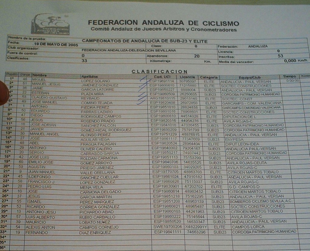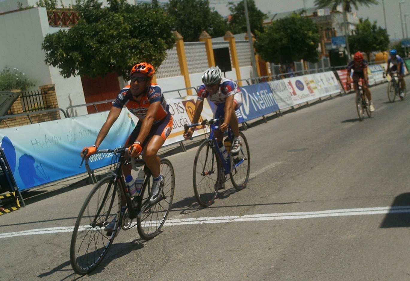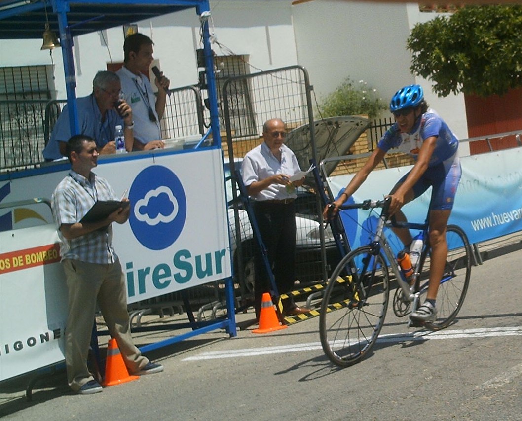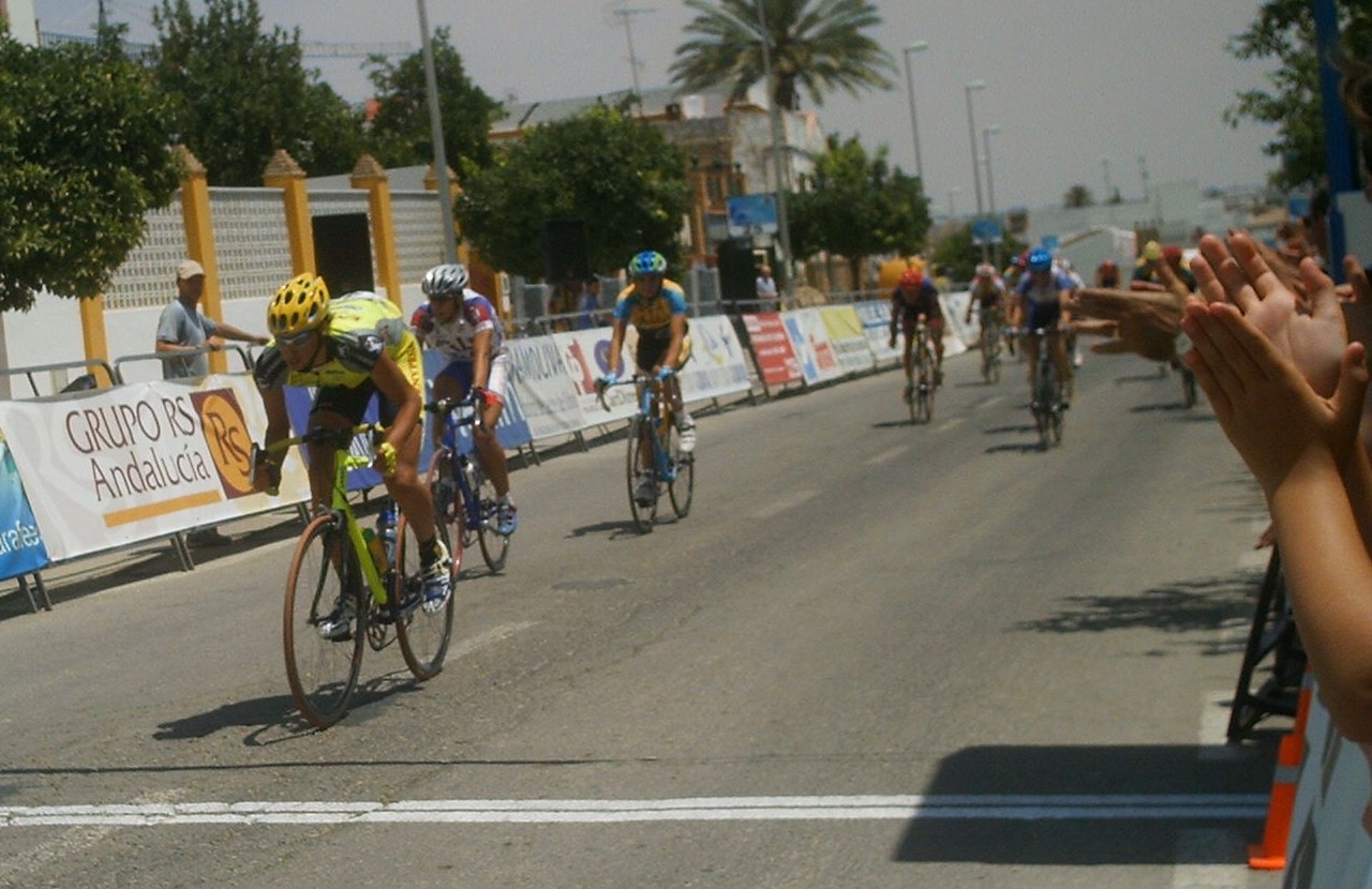 Tuve momentos jodidos, el calor aumentó y aquello empezó a convertirse en un infierno sobre todo para mi, que llevaba mes y pico en Villablino a 20 grados, vine aqui y el aire este que sopla por estas latitudes puede ser tan calido como el que sale de un tubo de escape, cada 5 kms necesitaba un bote de agua, lo pillaba como podia, sudaban los brazos, las piernas, me iba a derretir, menos mal que las etapas de la Vuelta a Cordoba son a las 12, teneis que venir, jejejje, al final en la ultima vuelta como que iba algo mejor, empezamos a atacarno, yo fui el que empeze a remover la mierda en un repecho, pero llegamos cinco para disputarnos el octavo y el bronce elite entre Rosendo, Edu y yo, Marranete habia ganado el Oro y Comino la plata elite, Edu Parras me ganó el sprint, esprinté pero Edu es muy rápido.