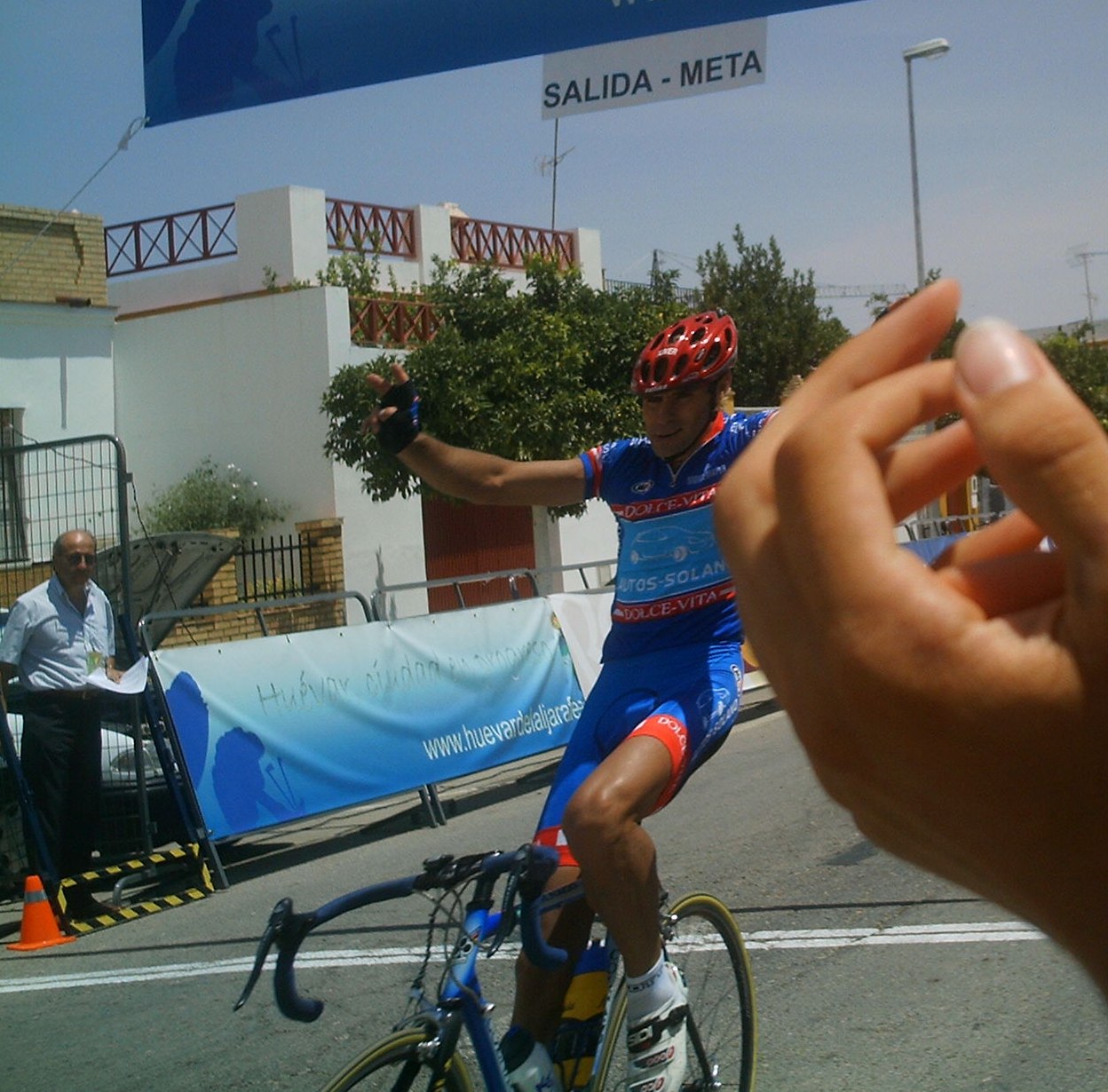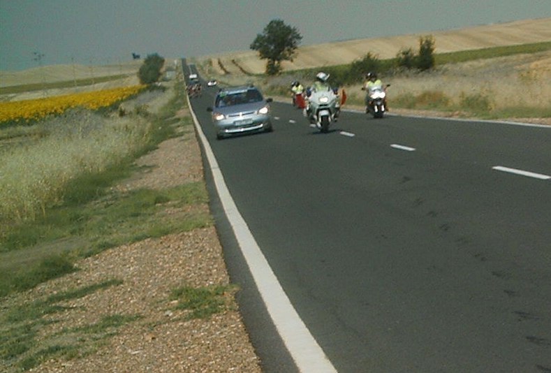 Luego me meti en otro corte con 3 Paul Versan, asi que ellos no iban a tirar por detras, en teoria, por que aparecio Marranete con mas Paul VErsan tirando y nos volvieron a pillar,buff., otros 15 kms de fuga para nada, tanto gasto intutil pasa factura, con el aumentó de temperatura que propició el sol de mediodia se apagó el Automatico y empezé a tener problemas, marché un poco para la oficina y fue el momento donde Marranete lió la escapada buena de 7 que llegó a Meta. Marranete eligio buenos compañeros de fuga para ganarles, Rosendo del Avila Rojas, que habia ganado el Campeonato contrareloja el dia anterior, Edu Parras y yo nos habiamos quedado atras y los de delante iban haciendo tras Marranete, yo les veia desde el pelotón todo jodido con impotencia intentando recuperar para volver a arrancar.