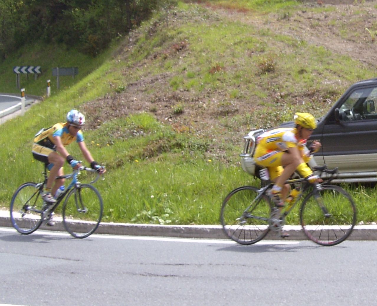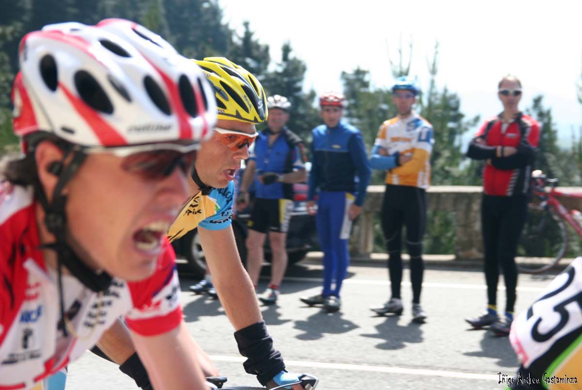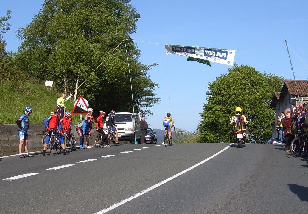 Ya me dejaban flipado, parecia que iban todos contra mi, tiraba yo, paraba para que pasasen y me arrancaban, nada.. cogi al Estrada tirando y va y me arranca el Edu...no entiendo a que jugaban, ya me puse a tirar a por el Edu otra vez y cuando quedaban 5 metros para cogerle me paré con mas mala ostia todavia a ver que hacian los de detras, no tenia ganas de llevar a nadie otra vez.. pues que iba a pasar, que me arrancó mas gente que enganchó con el Edu, ya me fui para atras que era lo que tenia que haber hecho antes y aquello se paró, y el Edu marchó para alante con otros mas que también me habian arrancado, entramos en Legazpi, la segunda Meta Volante, y para mas INRI nos coge todo el pelotón, yo iba amargao, aquello era para coger y bajarse, ya por inercia segui metiendome en cortes, me metí en otra escapada numerosa, parecia que habia mas orden, y giramos a la carretera del puerto de tercera de antes, pero esta vez seguia recto, este era mucho mas duro que el otro.