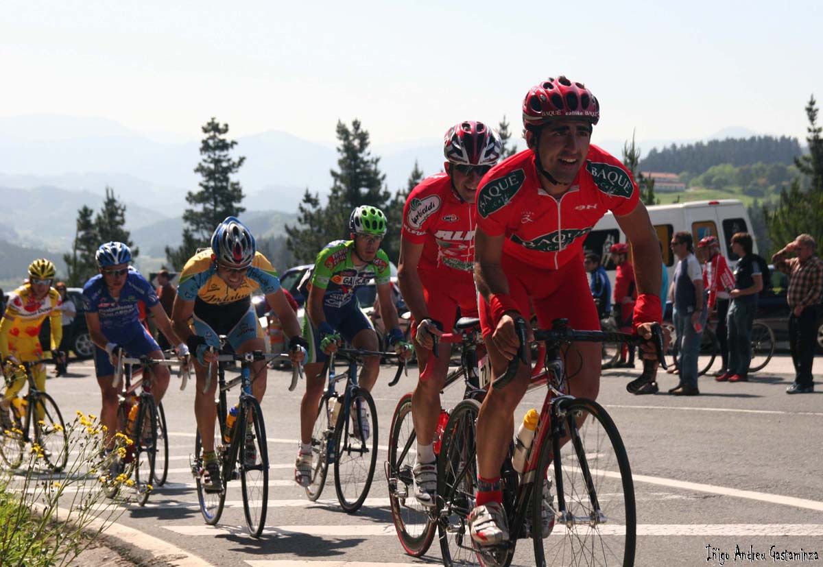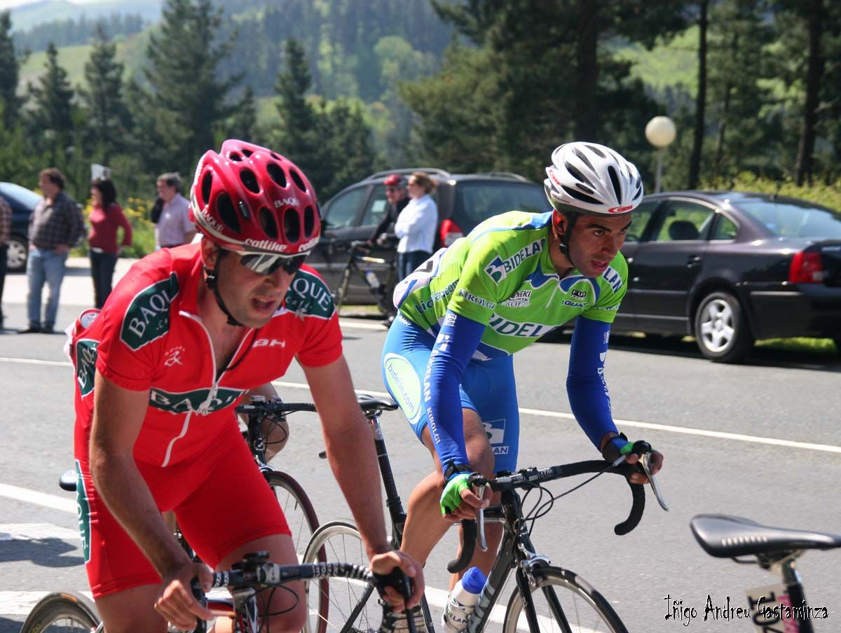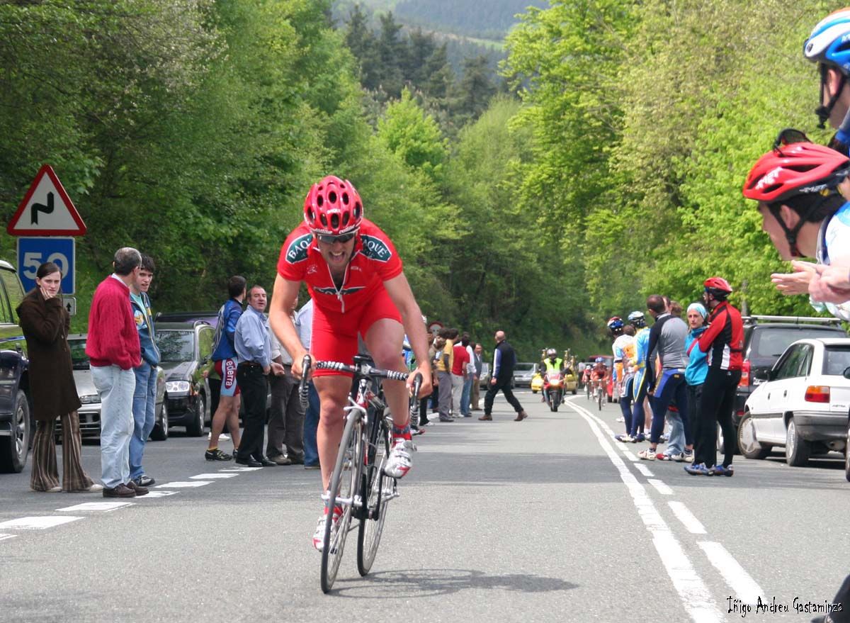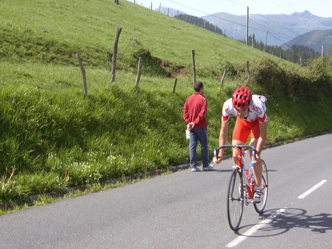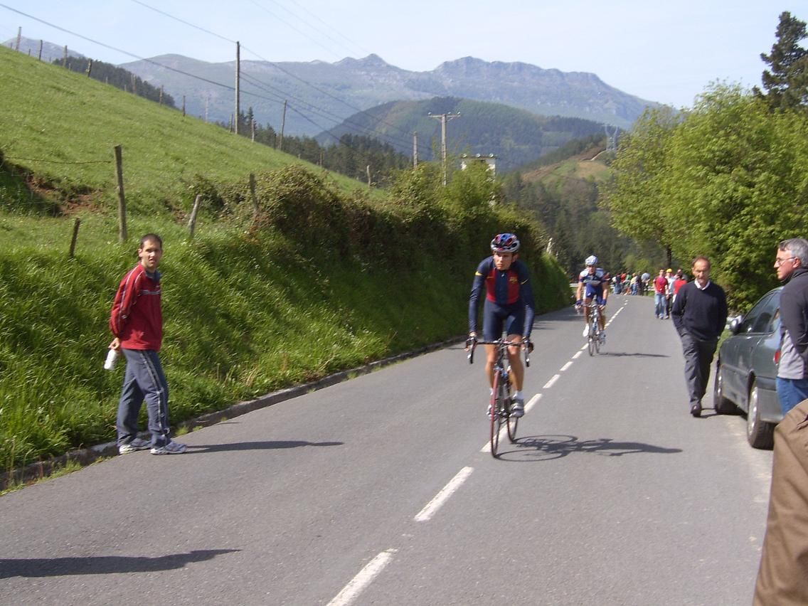 Esta vez habia mas tramo llano entre puerto y puerto y pude por fin recuperar, el siguiente puerto, el segundo paso por Oteiza, ya iba mucho mejor, cogi agua, luego unos Saunier me dieron Coca Cola y eso ya me hizo recuperar bien, ya iba como si acabase de salir en la etapa, subimos el puerto de después de Legazpi, hicimos el descenso largo y ya me puse a arrancar otra vez a 25 de meta, las fuerzas que habia recuperado las gasté arrancando en los leves repechillos antes de la última y definitiva ascensión a Deskarga, hasta que vi al Tren Alfus de Elorriaga con Momparler y el Oso intentando organizarse y ya me quité de atacar.