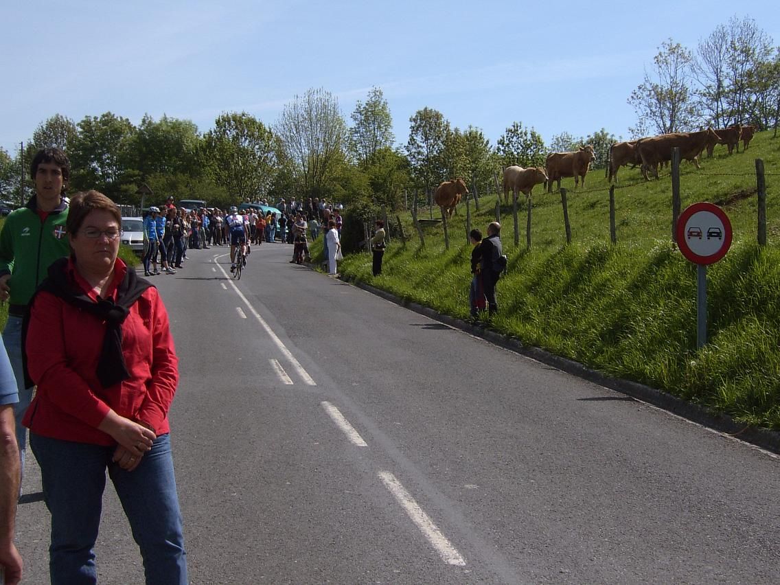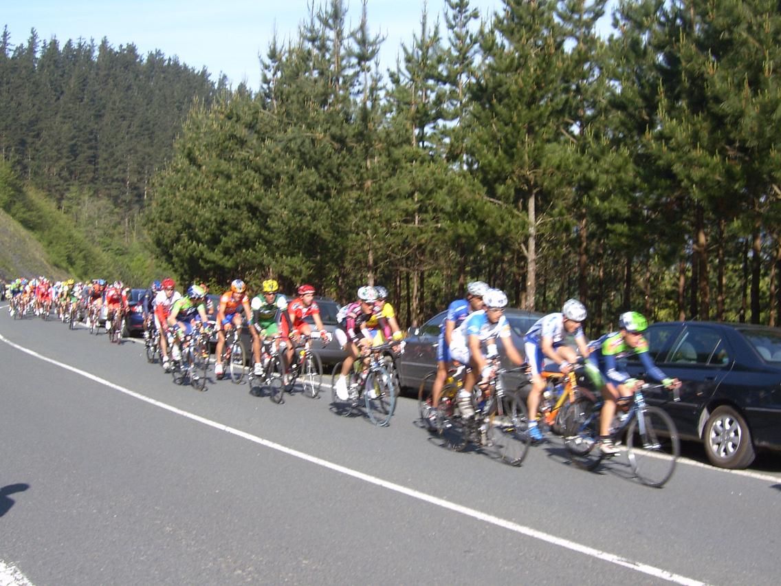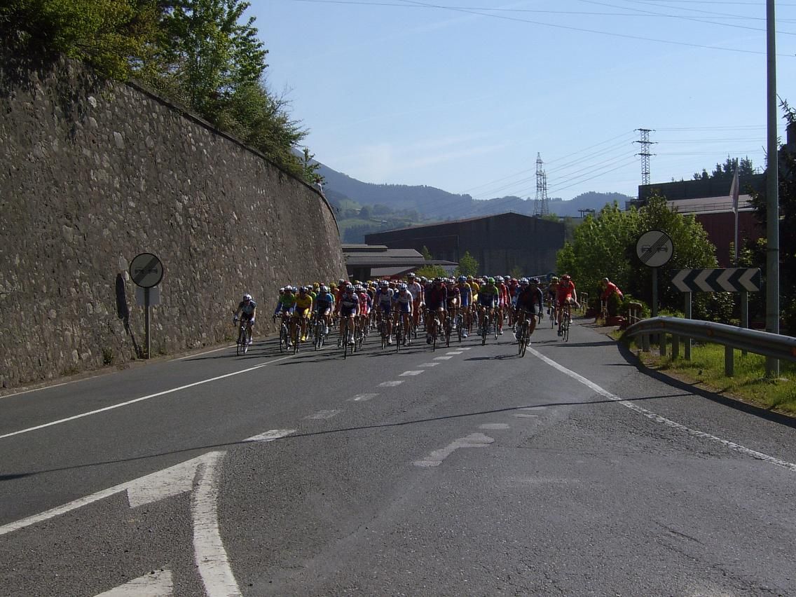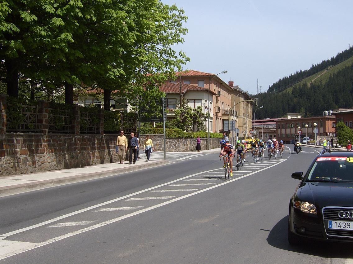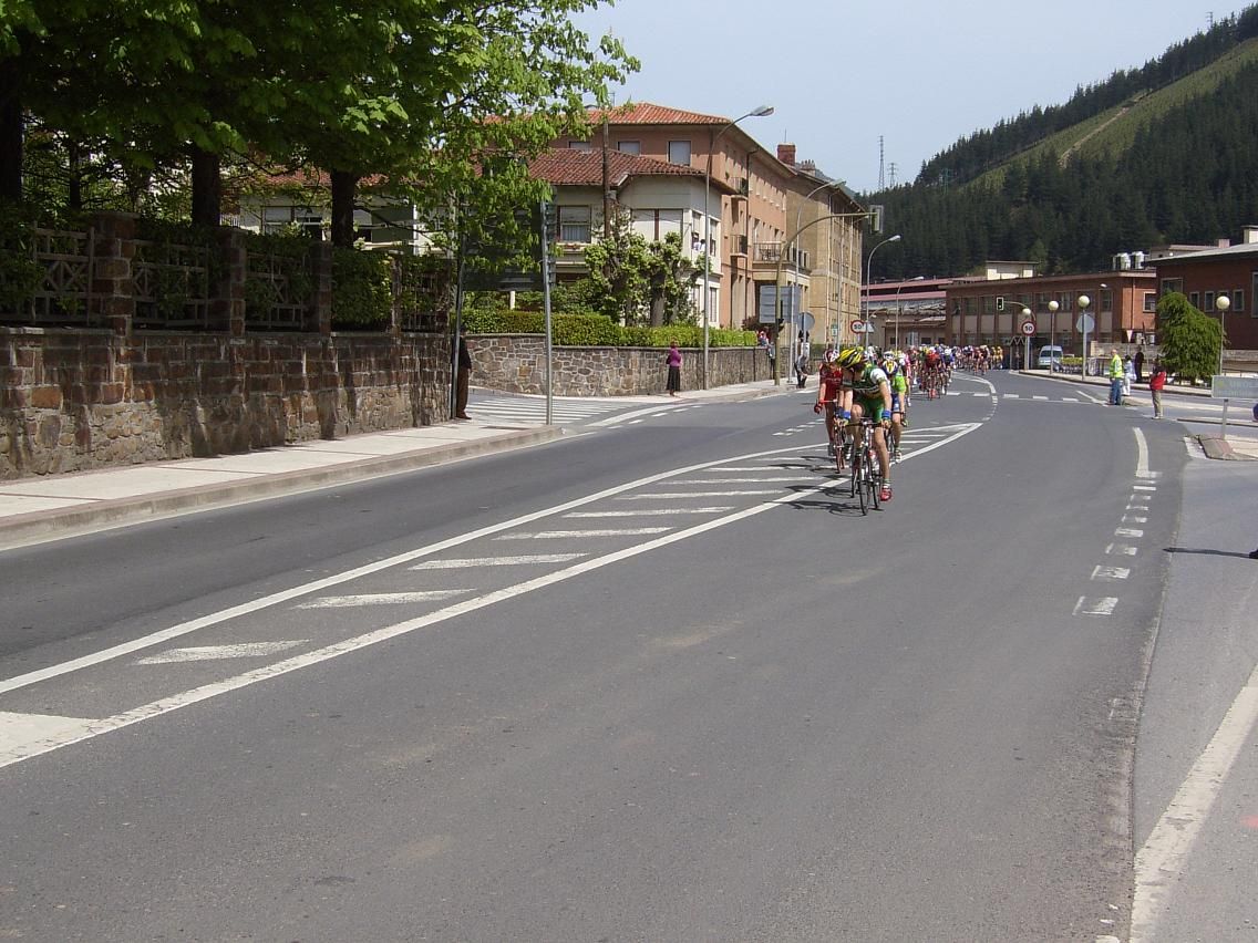Despues del descenso me dijo Cardenas del León, Que tal Diegoweb, como va? -Buff, me han hecho sufrir ya ahi... -Y quien no ha sufrido ahi?? fue lo que dijo Cardenas, yo le dije que algunos no, que mas de uno habrian subido fumando. Pasamos por un pueblo enfilados y comenzamos una carretera ascendente por un rio, alli ya me habian quitado las ganas de arrancar, estuve ahi en el pelotón muchos kms hasta que ya cuando vi que habia reunido las fuerzas para poder salir, pasé para alante, sali a un par de cortes y otra vez atras, que ya se acabaron las fuerzas, a seguir recuperando en el pelotón, llegamos a Legazpi otra vez, el paso por la Meta Volante, se hizo a mil por hora, un látigo alli por el pueblo, los pasos de Cebra, que los habian regado de agua a ver si se caia alguien y se veia espectaculo... estarian limpiando la fiesta que hubo el dia anterior en Legazpi, que en la salida habia mucha gente de fiesta todavia.