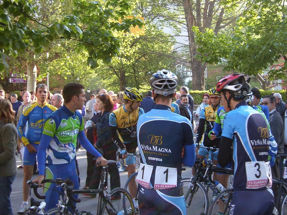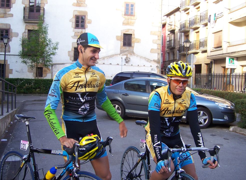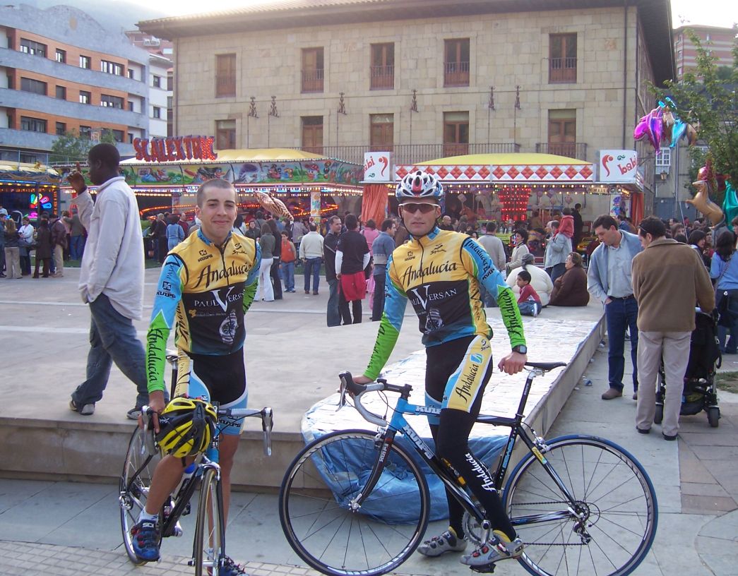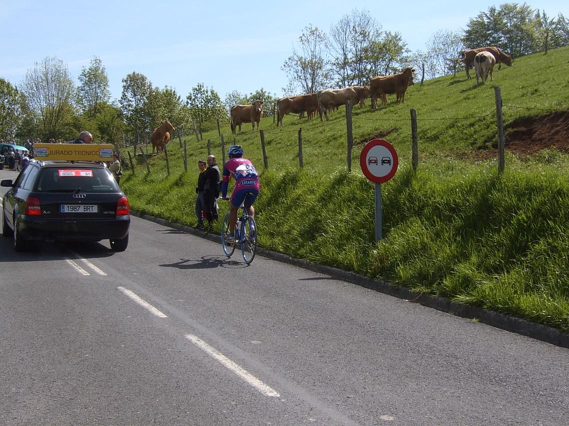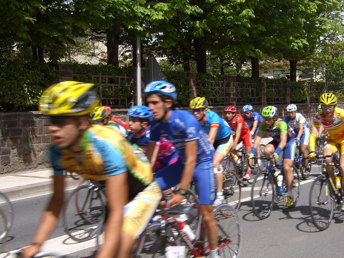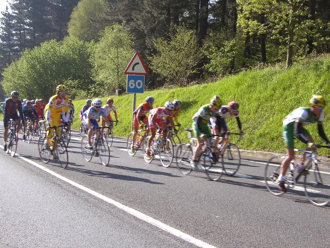 Despues del descenso me dijo Cardenas del León, Que tal Diegoweb, como va? -Buff, me han hecho sufrir ya ahi... -Y quien no ha sufrido ahi?? fue lo que dijo Cardenas, yo le dije que algunos no, que mas de uno habrian subido fumando. Pasamos por un pueblo enfilados y comenzamos una carretera ascendente por un rio, alli ya me habian quitado las ganas de arrancar, estuve ahi en el pelotón muchos kms hasta que ya cuando vi que habia reunido las fuerzas para poder salir, pasé para alante, sali a un par de cortes y otra vez atras, que ya se acabaron las fuerzas, a seguir recuperando en el pelotón, llegamos a Legazpi otra vez, el paso por la Meta Volante, se hizo a mil por hora, un látigo alli por el pueblo, los pasos de Cebra, que los habian regado de agua a ver si se caia alguien y se veia espectaculo... estarian limpiando la fiesta que hubo el dia anterior en Legazpi, que en la salida habia mucha gente de fiesta todavia.