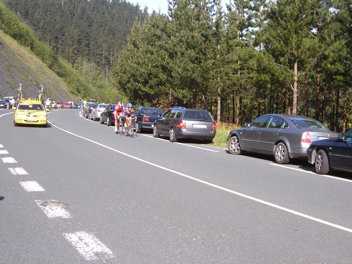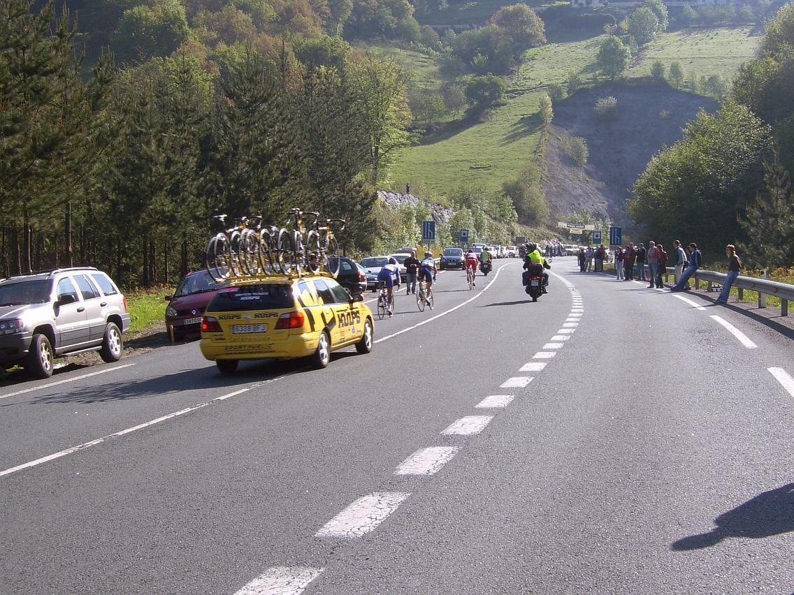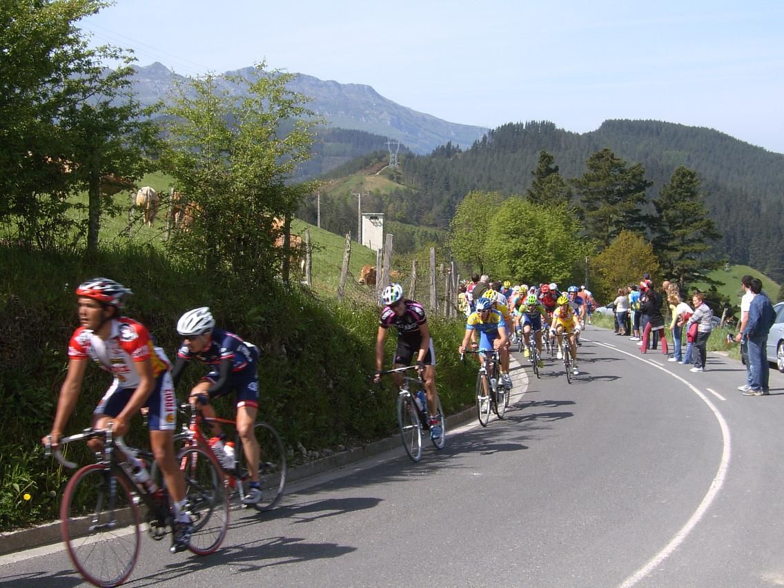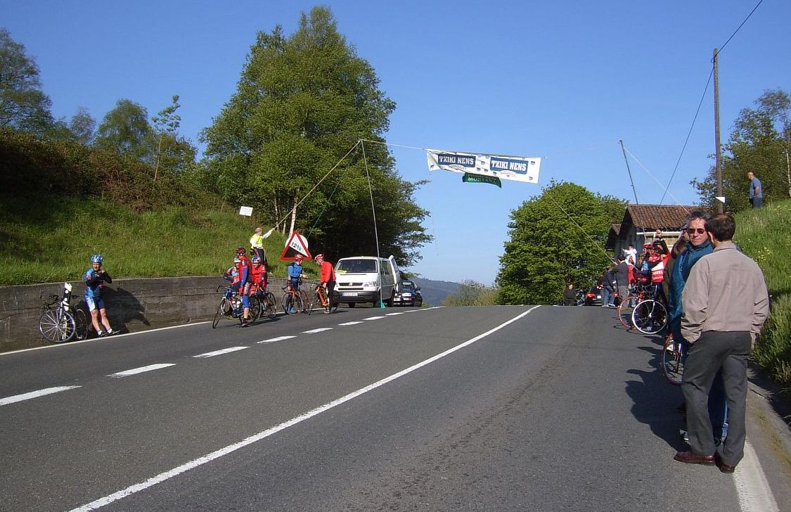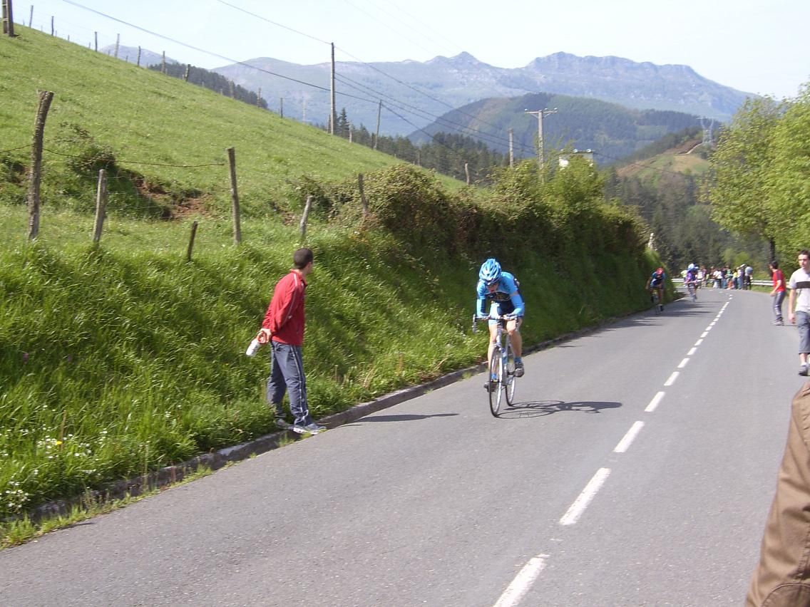 En un plano de esos arrancó el Oso con otro y abrieron hueco los dos, hubo un pequeño parón, les dejaron unos metros y el Oso empezó a Cabalgar, no se si era con Torrella, llegamos al inicio del puerto de Azkarate, de segunda.. uff.. aqui los tercera pican, asi que los segunda ya.. temibles, era una carretera nacional ancha de tres carriles, pero con un desnivel considerables, yo iba ahi metido medio bien, pero la subida era larga larga, al final, cuando ponía 1 km puerto, aqui a los carteles de 1 km habia que añadirles el IVA, la gente empezó a emocionarse y se hizo duro al final, coronamos por un tunel, pasamos el tunel y mire atras a ver si habia habido clareo y nada.. aqui no se queda nadie, ni siquiera llegue a ver la cola de la gente, este debió ser el puerto que se subia en el Valenciaga que también habia un tunel al final, pero subido al revés.. me parecio que era.. igual no..ese creo que se llamaba Osma.