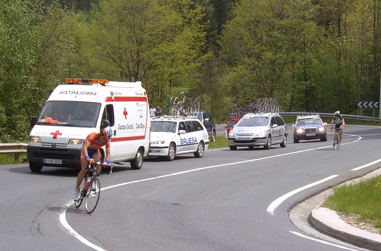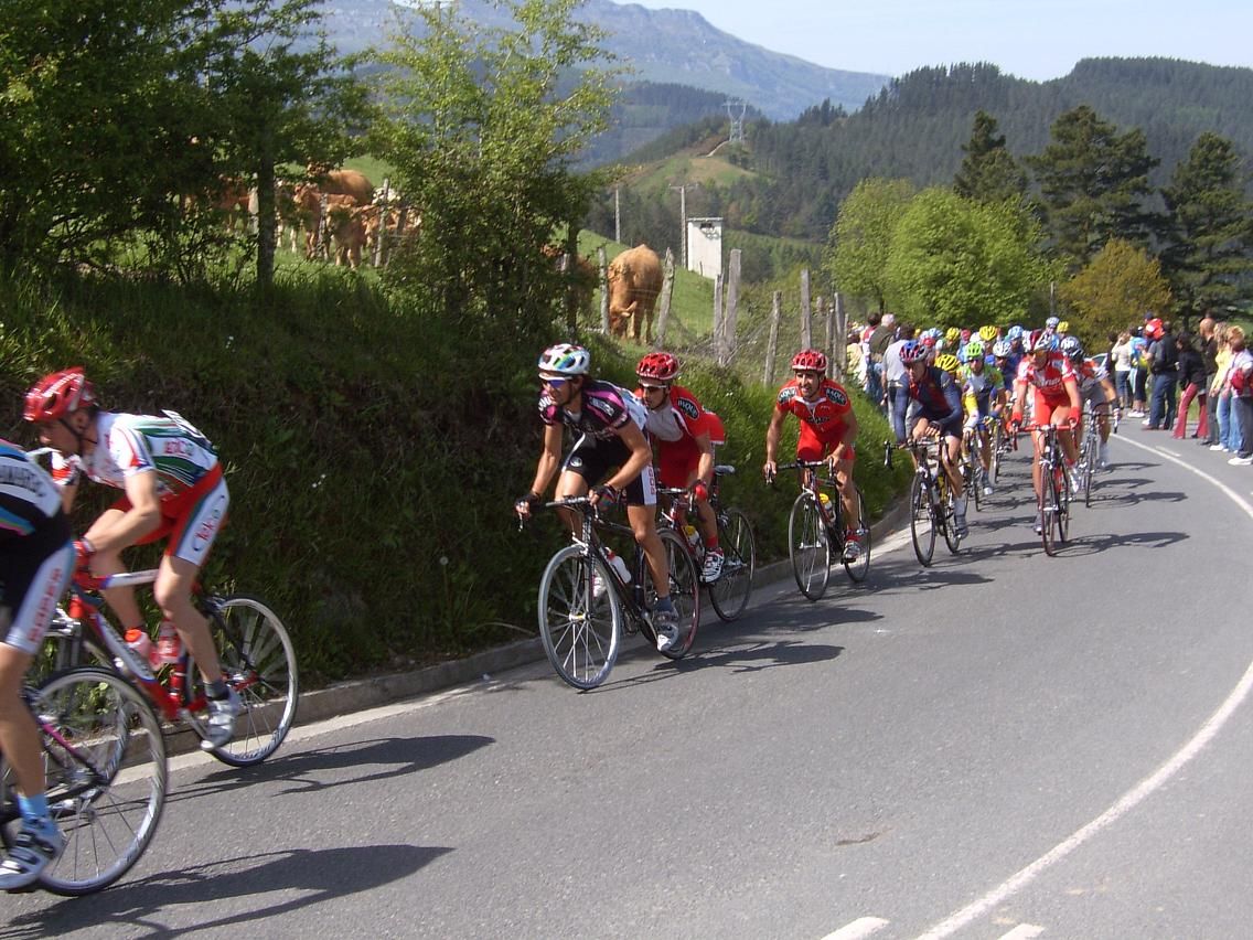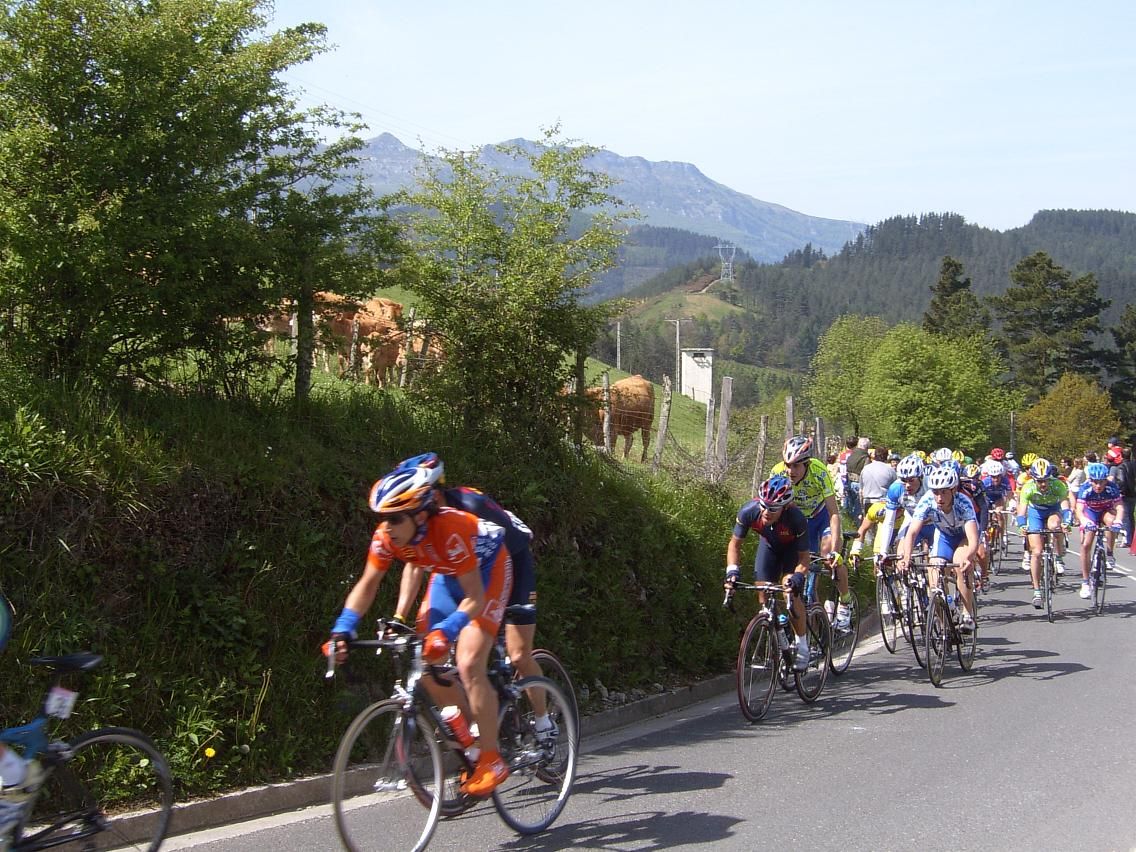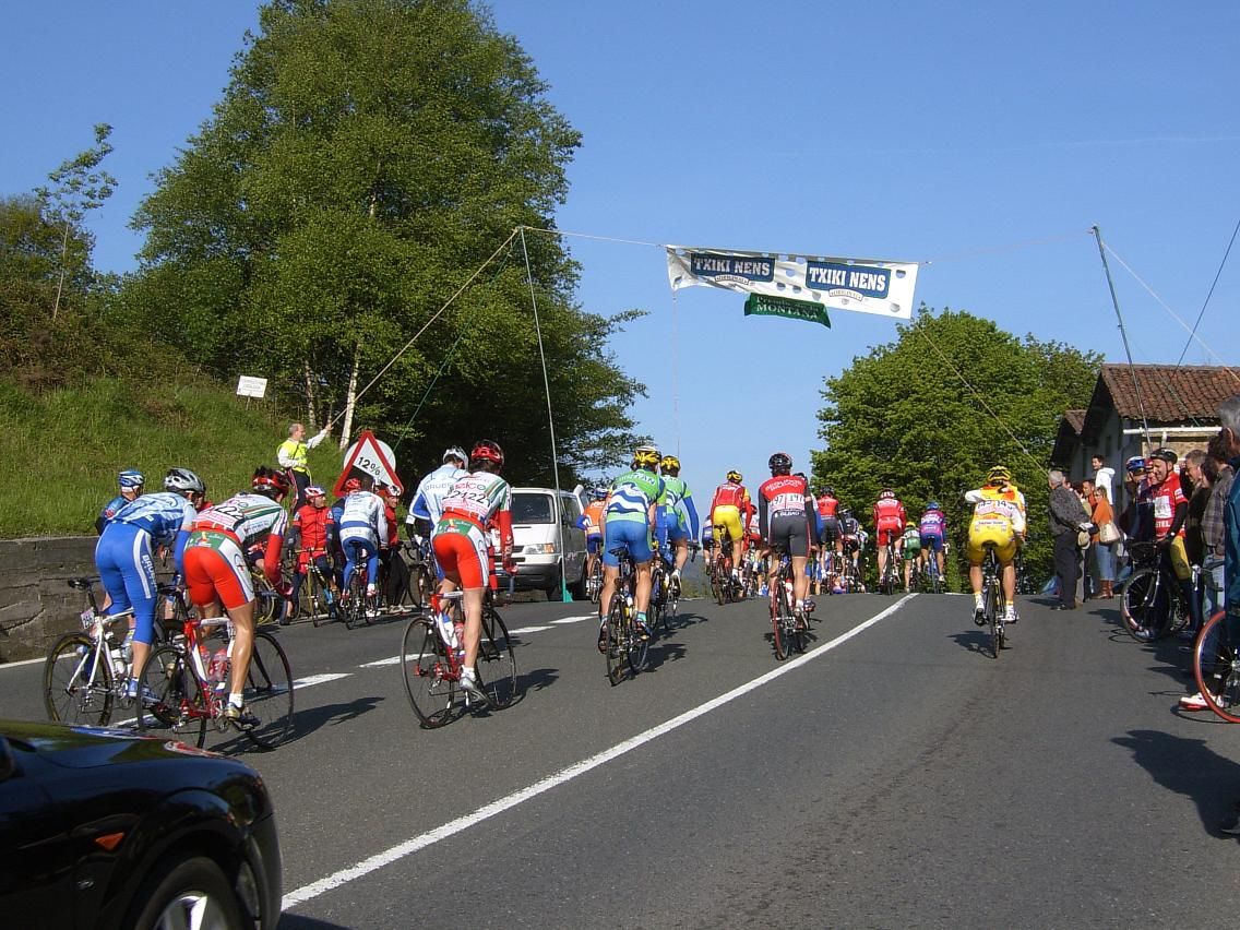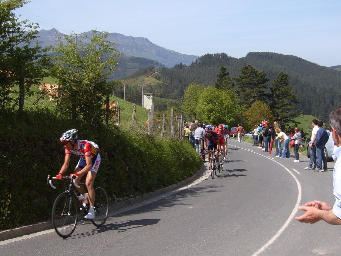En un plano de esos arrancó el Oso con otro y abrieron hueco los dos, hubo un pequeño parón, les dejaron unos metros y el Oso empezó a Cabalgar, no se si era con Torrella, llegamos al inicio del puerto de Azkarate, de segunda.. uff.. aqui los tercera pican, asi que los segunda ya.. temibles, era una carretera nacional ancha de tres carriles, pero con un desnivel considerables, yo iba ahi metido medio bien, pero la subida era larga larga, al final, cuando ponía 1 km puerto, aqui a los carteles de 1 km habia que añadirles el IVA, la gente empezó a emocionarse y se hizo duro al final, coronamos por un tunel, pasamos el tunel y mire atras a ver si habia habido clareo y nada.. aqui no se queda nadie, ni siquiera llegue a ver la cola de la gente, este debió ser el puerto que se subia en el Valenciaga que también habia un tunel al final, pero subido al revés.. me parecio que era.. igual no..ese creo que se llamaba Osma.