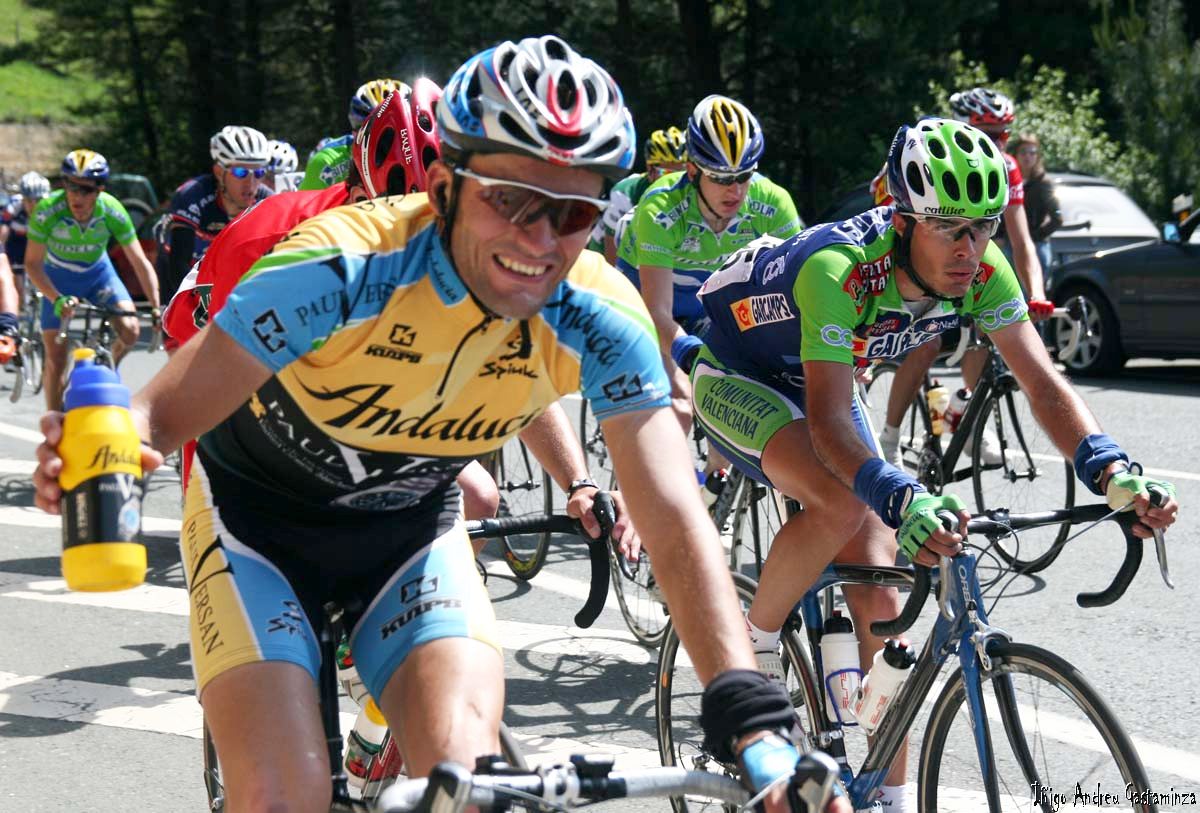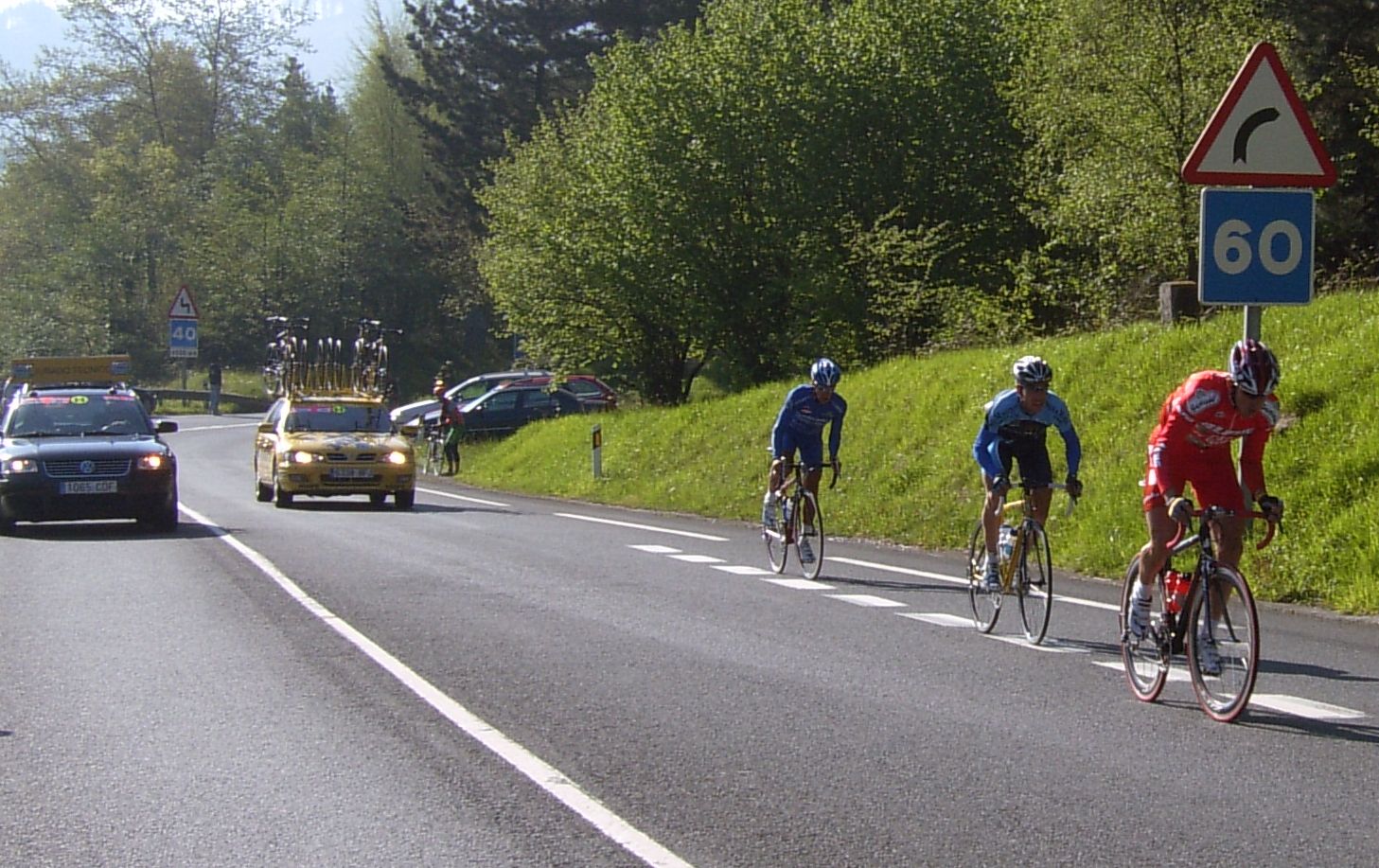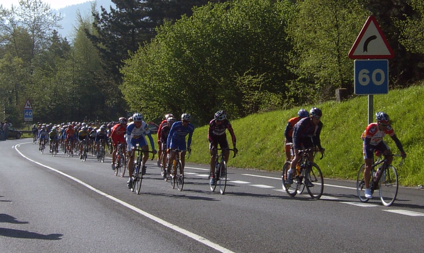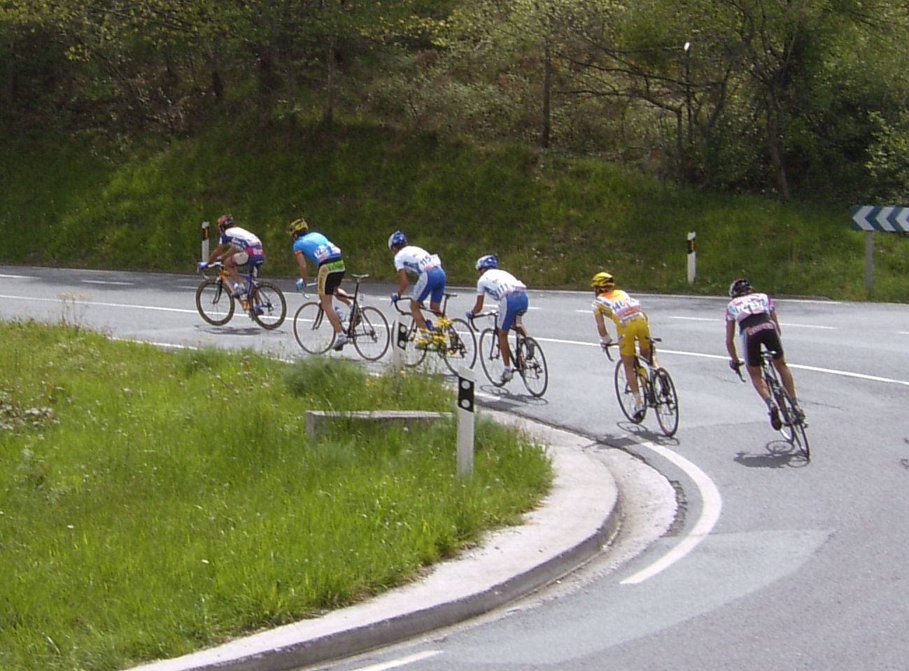 En un plano de esos arrancó el Oso con otro y abrieron hueco los dos, hubo un pequeño parón, les dejaron unos metros y el Oso empezó a Cabalgar, no se si era con Torrella, llegamos al inicio del puerto de Azkarate, de segunda.. uff.. aqui los tercera pican, asi que los segunda ya.. temibles, era una carretera nacional ancha de tres carriles, pero con un desnivel considerables, yo iba ahi metido medio bien, pero la subida era larga larga, al final, cuando ponía 1 km puerto, aqui a los carteles de 1 km habia que añadirles el IVA, la gente empezó a emocionarse y se hizo duro al final, coronamos por un tunel, pasamos el tunel y mire atras a ver si habia habido clareo y nada.. aqui no se queda nadie, ni siquiera llegue a ver la cola de la gente, este debió ser el puerto que se subia en el Valenciaga que también habia un tunel al final, pero subido al revés.. me parecio que era.. igual no..ese creo que se llamaba Osma.