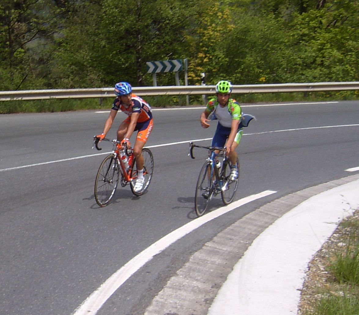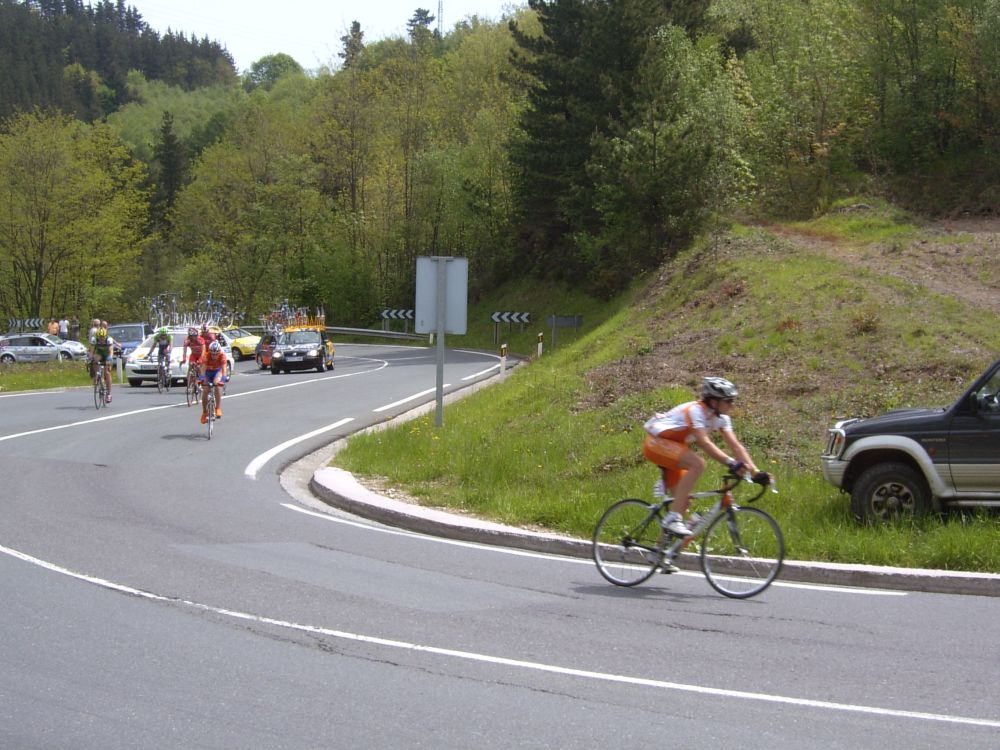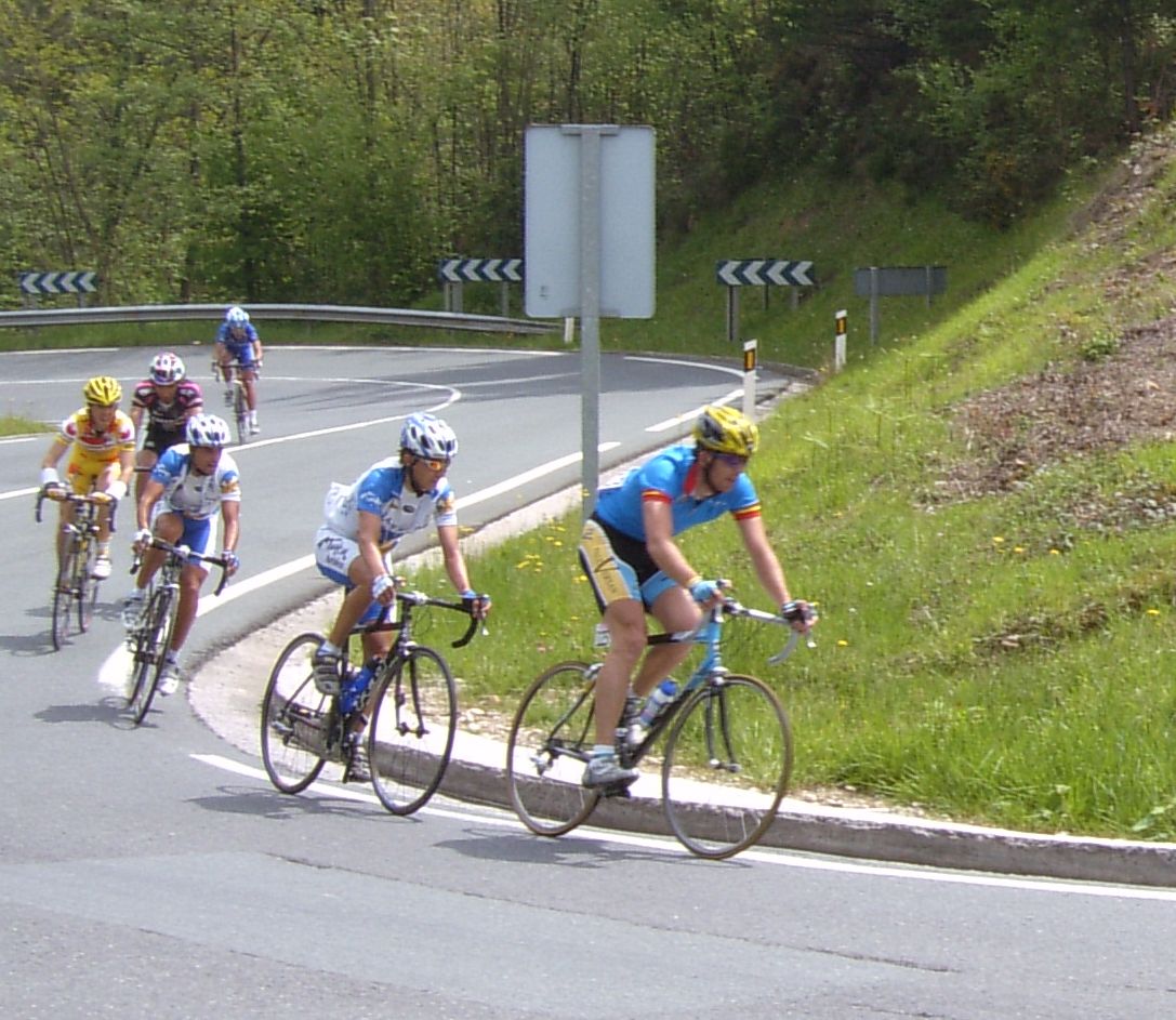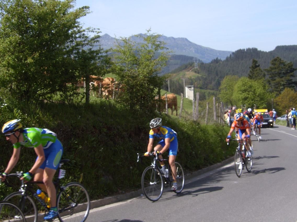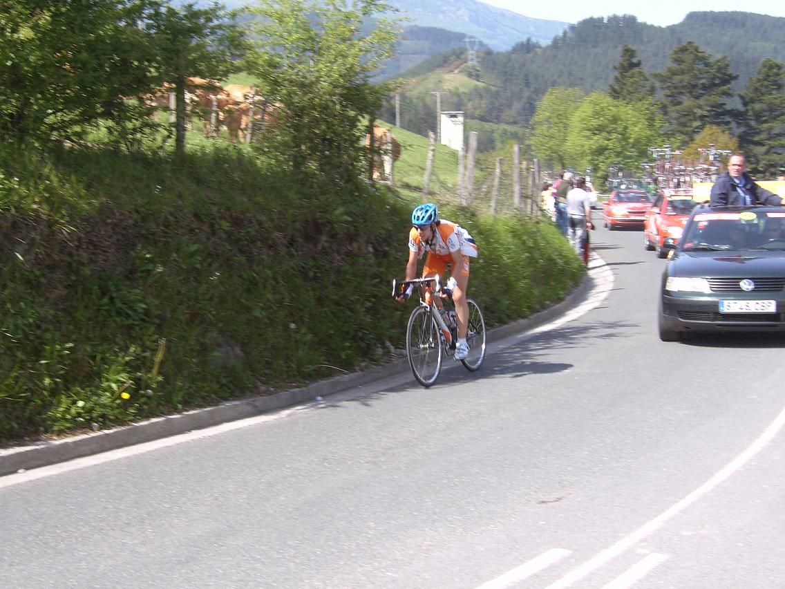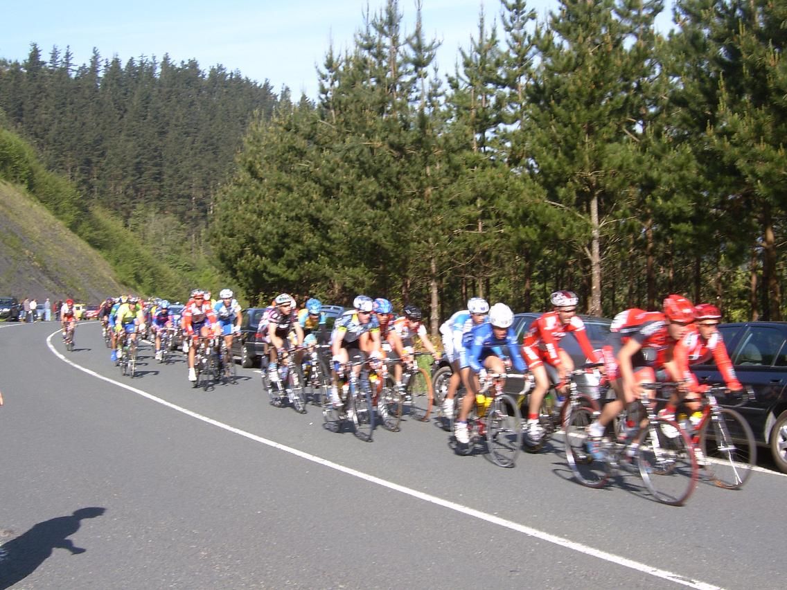 Pasando Legazpi se giraba a la izquierda, inicio puerto de tercera, inicio emboscada, una carretera mas estrecha conducia a una subida que daba miedo, pero giramos a la izquierda otra vez y ya llegamos a una mas tendida sombria entre bosques que se subia a treintaypicos por hora, esta eran 3 kms, era una subida relativamente comoda, aunque fue muy rápida, coronabas y una bajada muy larga con una carretera estrechita, ahi ibamos en fila de uno, tal como empezabas la bajada, acababas la bajada, nos tiramos 7 kms por alli bajando lleno de curvas en fila de uno el látigo, hay mucha gente que le gusta eso, por fin llegamos abajo del todo, y giramos a una carretera nacional grande camino de Zumarraga, alli arranqué yo con unos cuantos y contactamos con la escapada donde iba Cariñena.