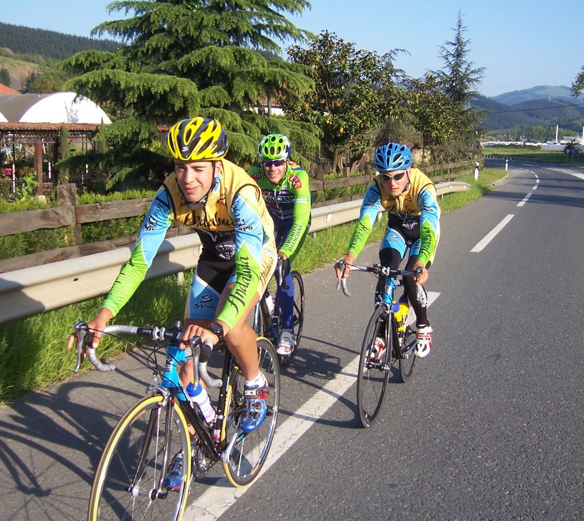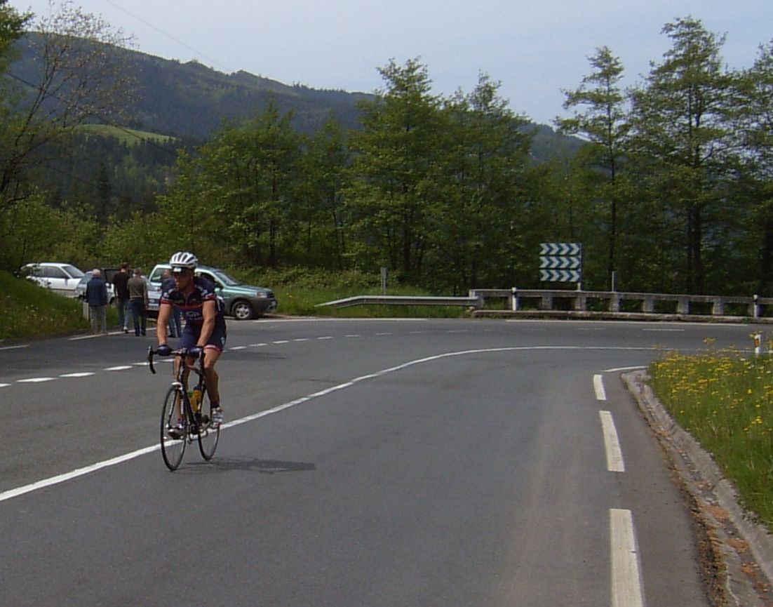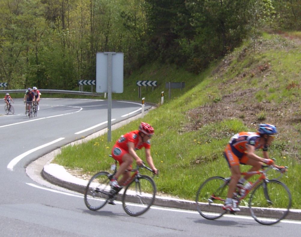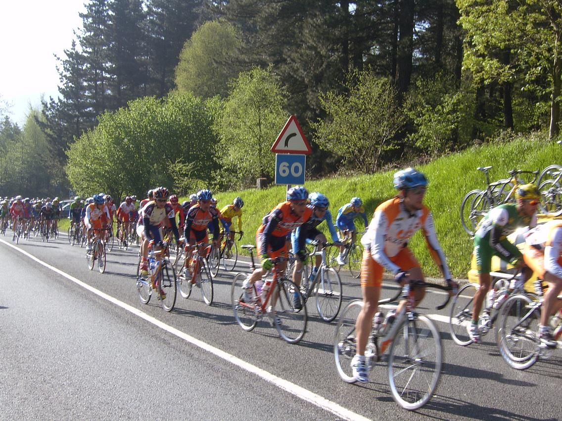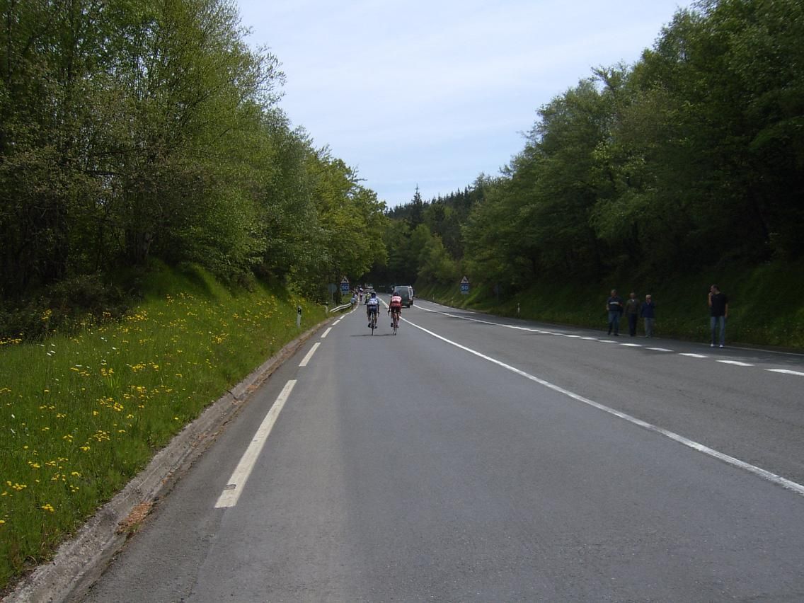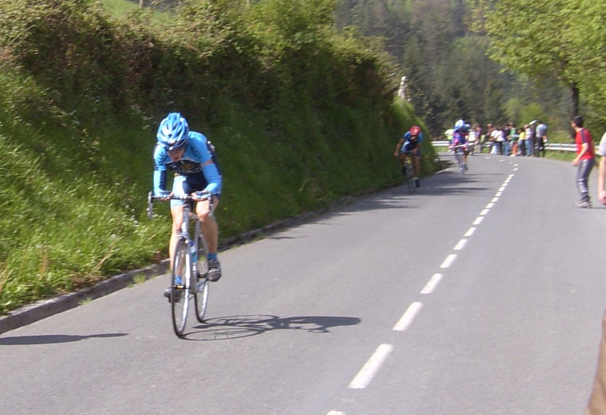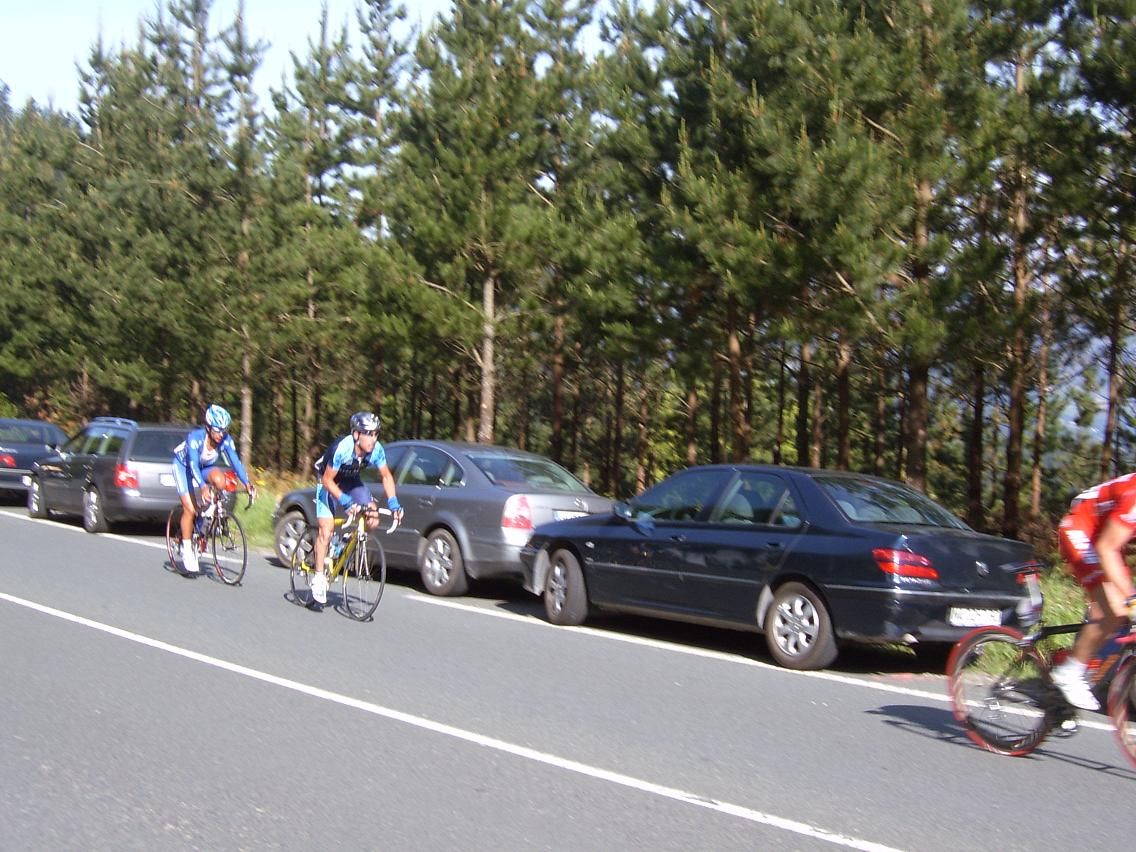 Pasando Legazpi se giraba a la izquierda, inicio puerto de tercera, inicio emboscada, una carretera mas estrecha conducia a una subida que daba miedo, pero giramos a la izquierda otra vez y ya llegamos a una mas tendida sombria entre bosques que se subia a treintaypicos por hora, esta eran 3 kms, era una subida relativamente comoda, aunque fue muy rápida, coronabas y una bajada muy larga con una carretera estrechita, ahi ibamos en fila de uno, tal como empezabas la bajada, acababas la bajada, nos tiramos 7 kms por alli bajando lleno de curvas en fila de uno el látigo, hay mucha gente que le gusta eso, por fin llegamos abajo del todo, y giramos a una carretera nacional grande camino de Zumarraga, alli arranqué yo con unos cuantos y contactamos con la escapada donde iba Cariñena.