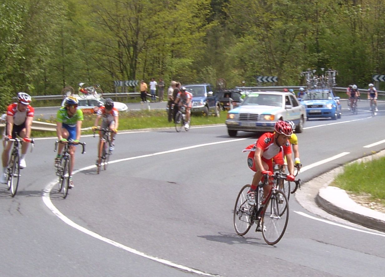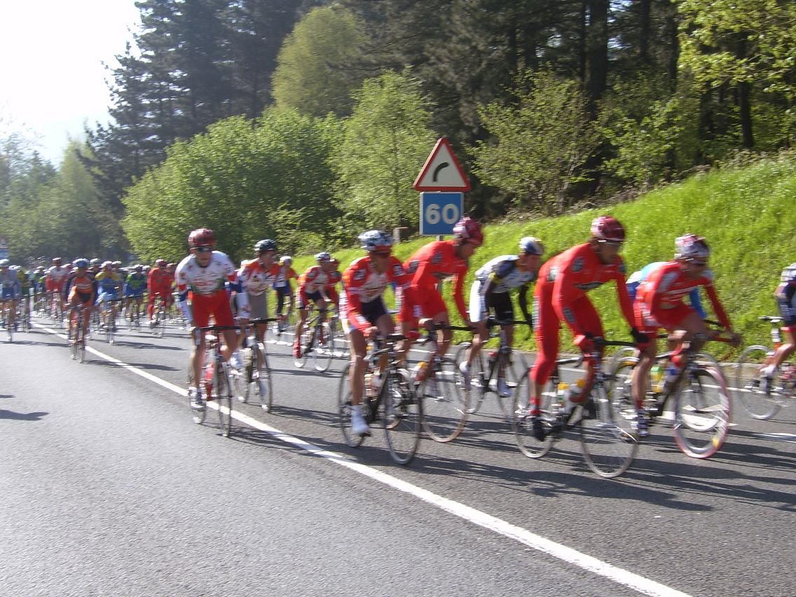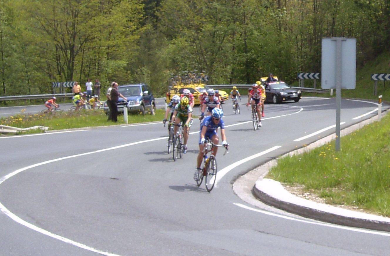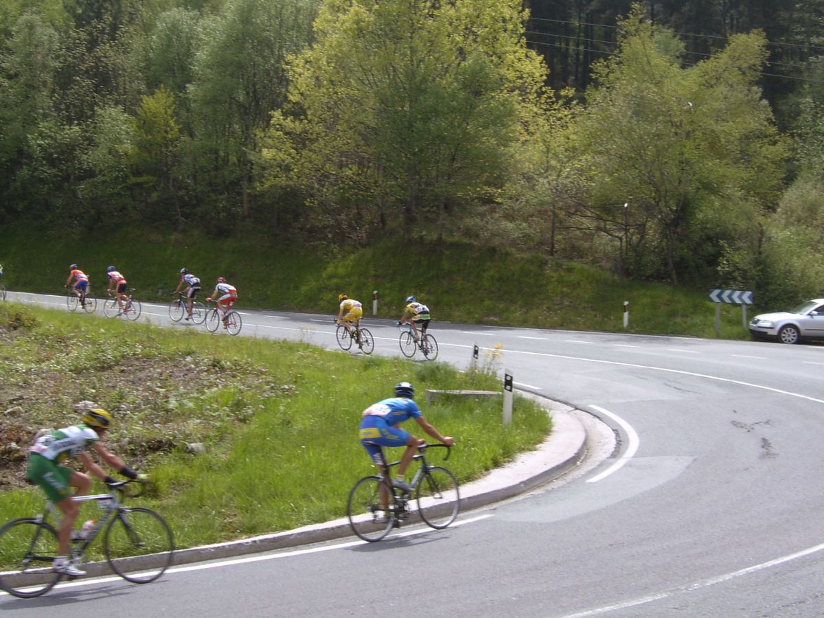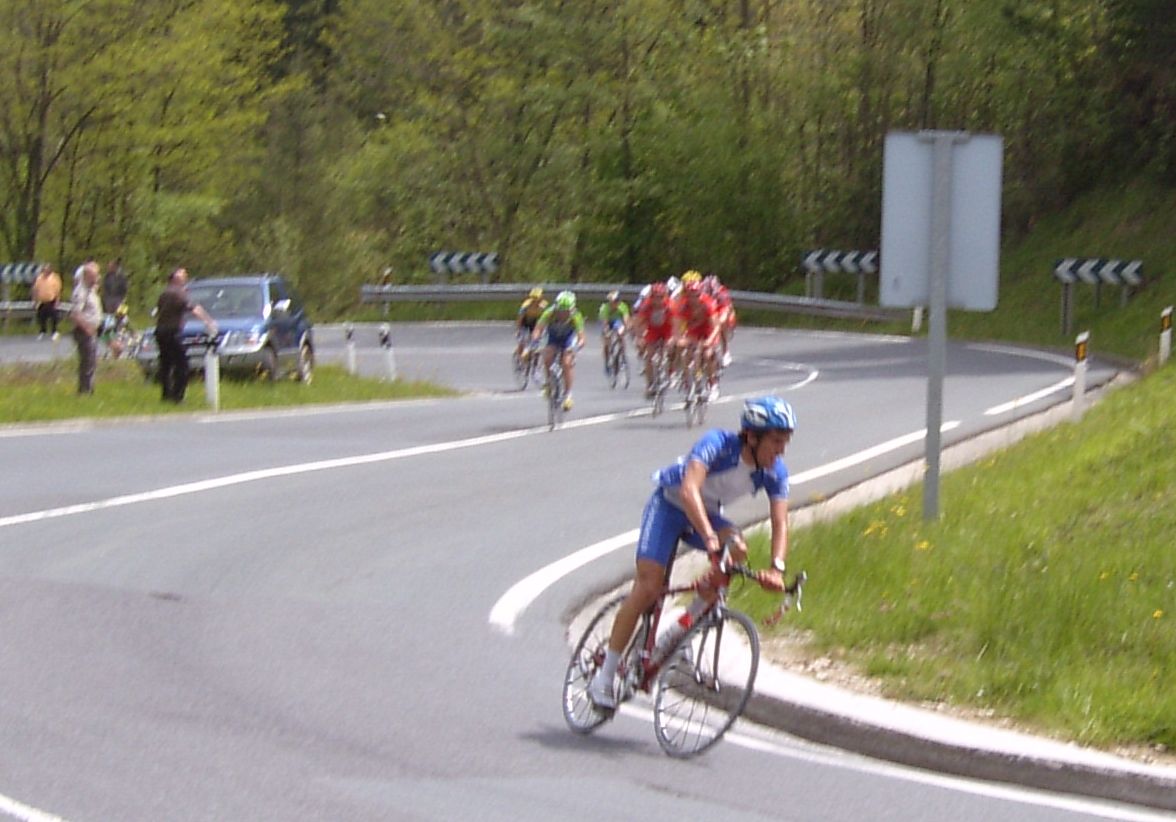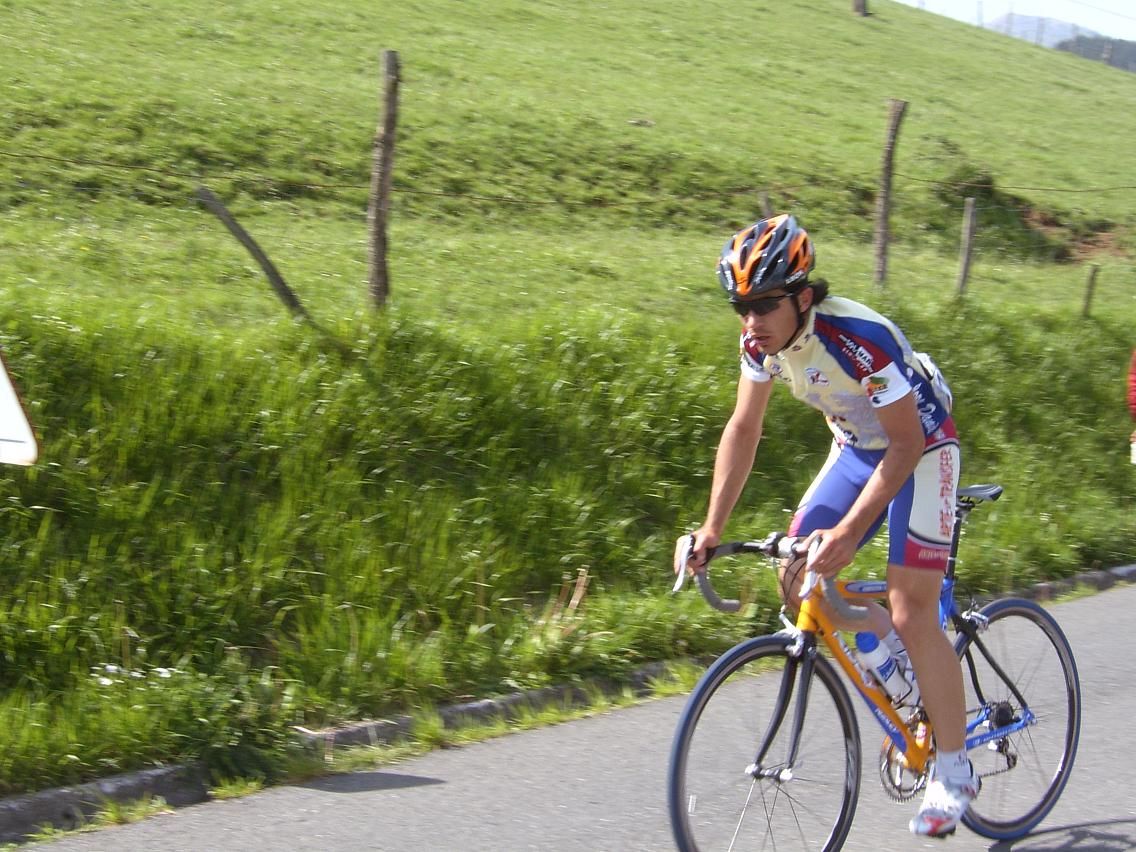 Pasando Legazpi se giraba a la izquierda, inicio puerto de tercera, inicio emboscada, una carretera mas estrecha conducia a una subida que daba miedo, pero giramos a la izquierda otra vez y ya llegamos a una mas tendida sombria entre bosques que se subia a treintaypicos por hora, esta eran 3 kms, era una subida relativamente comoda, aunque fue muy rápida, coronabas y una bajada muy larga con una carretera estrechita, ahi ibamos en fila de uno, tal como empezabas la bajada, acababas la bajada, nos tiramos 7 kms por alli bajando lleno de curvas en fila de uno el látigo, hay mucha gente que le gusta eso, por fin llegamos abajo del todo, y giramos a una carretera nacional grande camino de Zumarraga, alli arranqué yo con unos cuantos y contactamos con la escapada donde iba Cariñena.