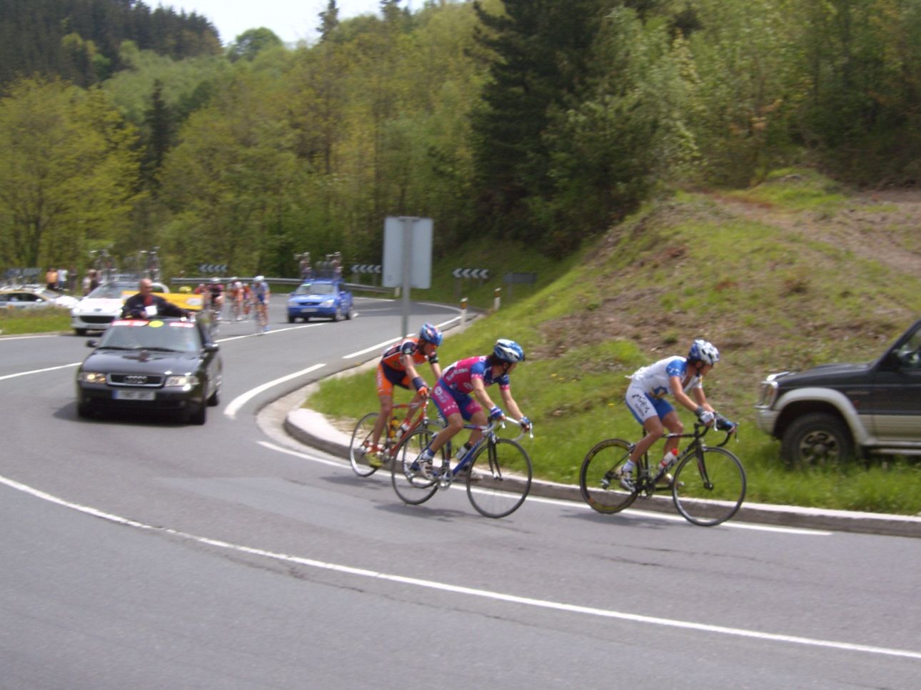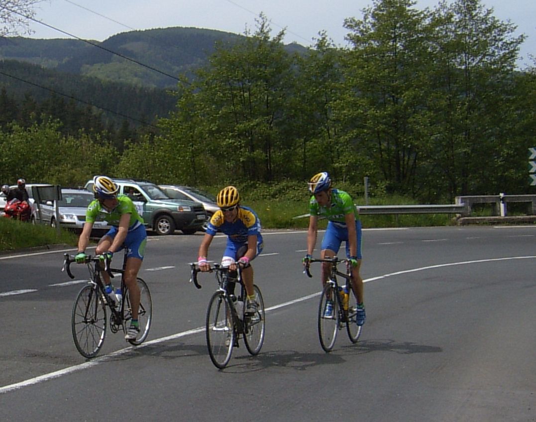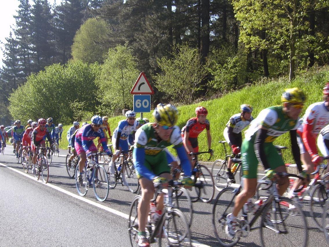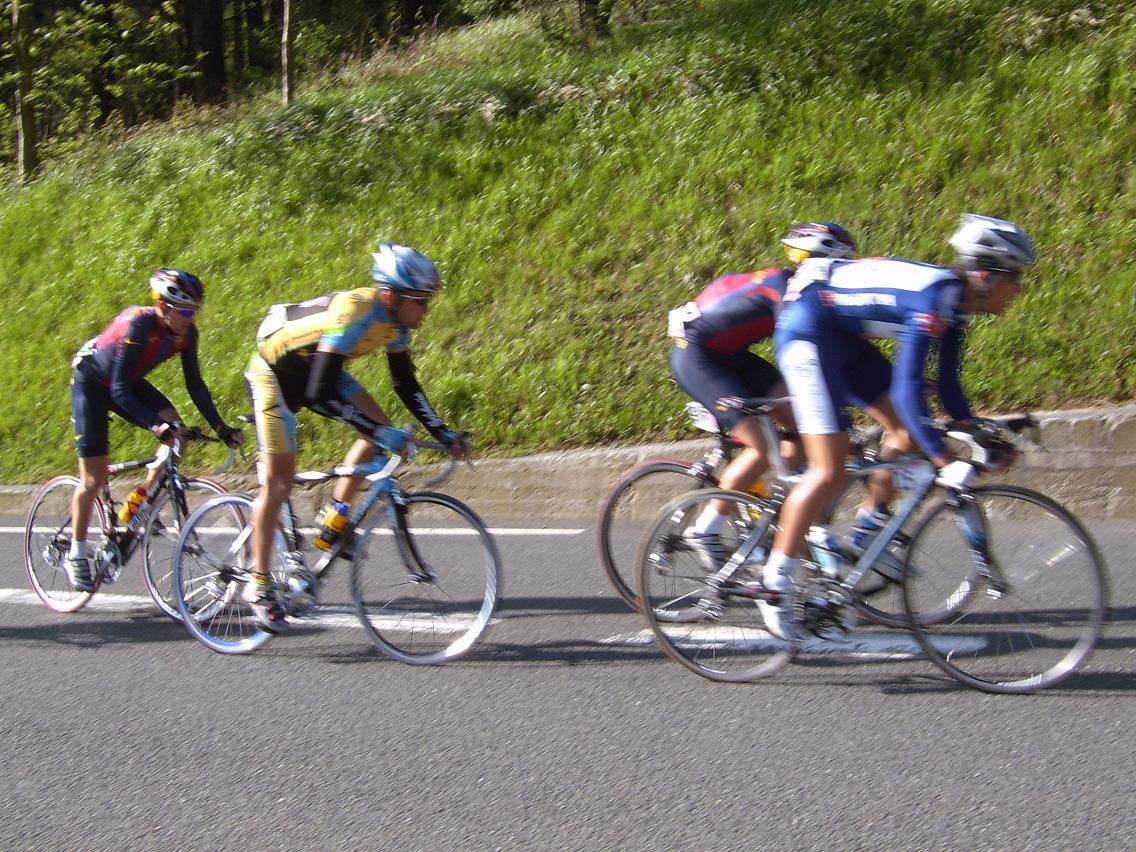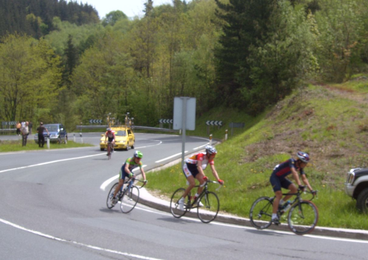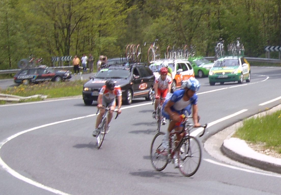 Pasando Legazpi se giraba a la izquierda, inicio puerto de tercera, inicio emboscada, una carretera mas estrecha conducia a una subida que daba miedo, pero giramos a la izquierda otra vez y ya llegamos a una mas tendida sombria entre bosques que se subia a treintaypicos por hora, esta eran 3 kms, era una subida relativamente comoda, aunque fue muy rápida, coronabas y una bajada muy larga con una carretera estrechita, ahi ibamos en fila de uno, tal como empezabas la bajada, acababas la bajada, nos tiramos 7 kms por alli bajando lleno de curvas en fila de uno el látigo, hay mucha gente que le gusta eso, por fin llegamos abajo del todo, y giramos a una carretera nacional grande camino de Zumarraga, alli arranqué yo con unos cuantos y contactamos con la escapada donde iba Cariñena.