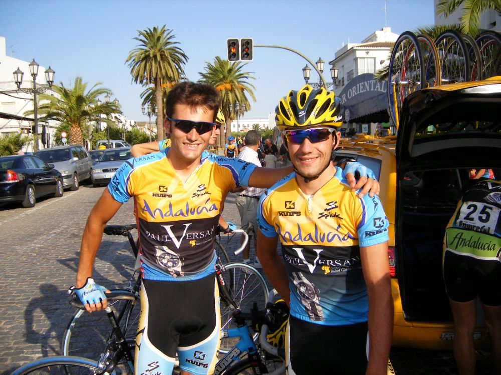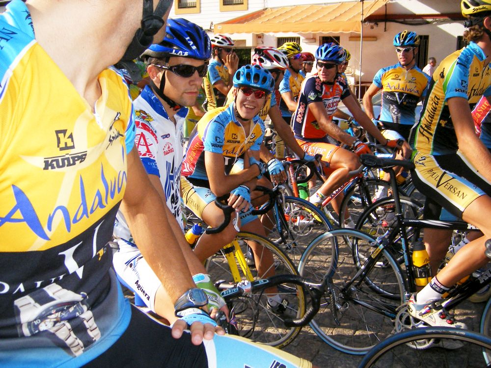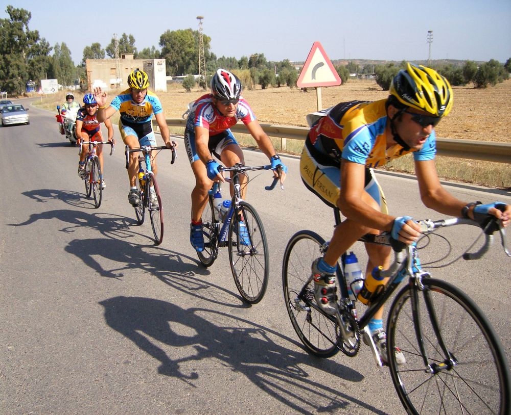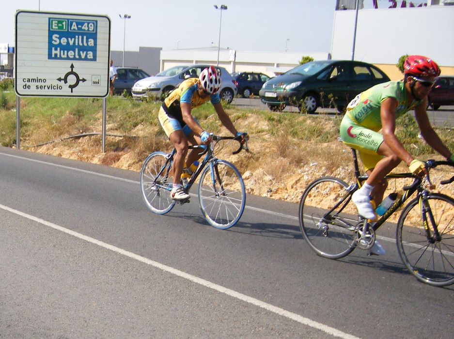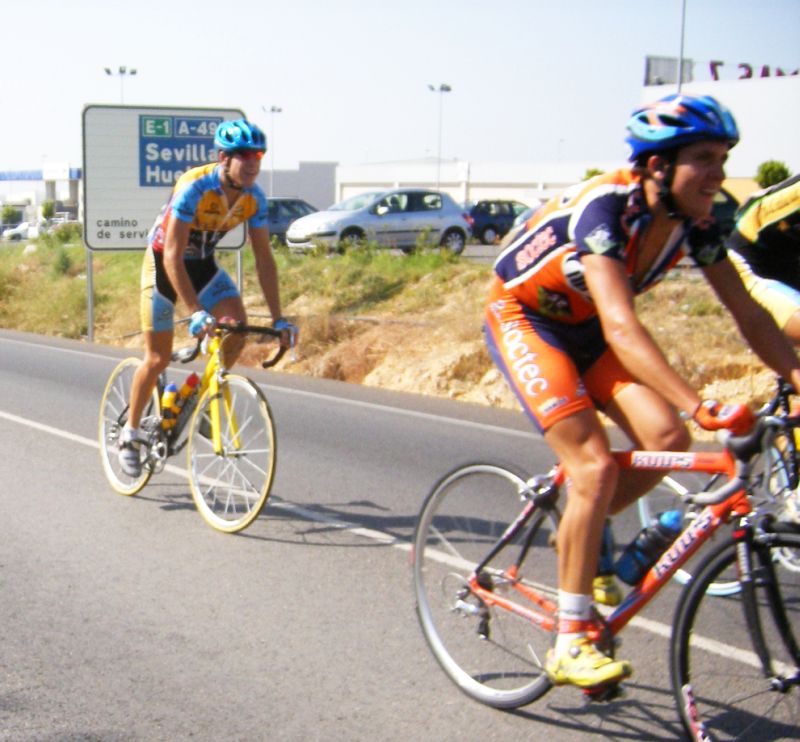 Esperamos a los dos compañeros y ya se ponia la cosa bien, una escapada de 6, 4 Andalucias, Edu Parras y el de Palma, muy mal se tenia que dar ya, aunque desconociamos las diferencias con los demas. Asi pues tirabamos los cuatro y los dos a rueda, aunque con 4 tirando, nos ibamos reservando de vez en cuando, llegamos a Bollullos y quedaba dar otra vez la vuelta larguisima, pero esta vez mas cansados y con mas calor, que empezaba a ser el típico calor asfixiante de las bulerias de verano.