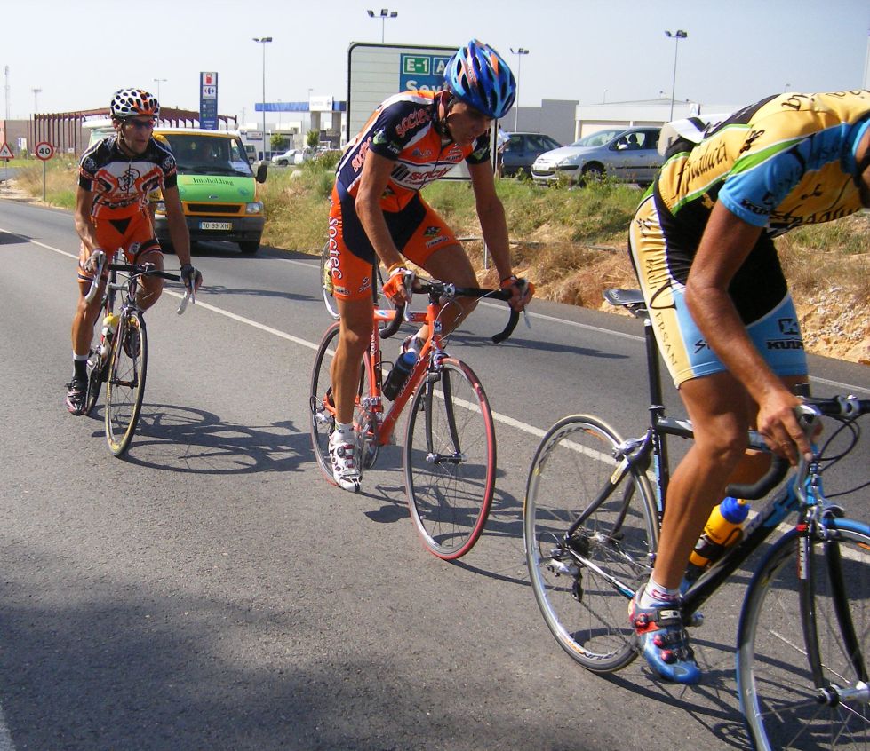 Llegamos al primer repecho, muy duro, de estos de 3 carriles de carretera nacional pero que se agarra bastante, subimos a buena marcheta y cuando lo coronamos vimos que habiamos perdido un integrante de la escapada, el portugués del Loulé se habia quedado, Cecilio dijo que eso no era bueno, que ahora se pondrian a tirar los Loulé por detras.