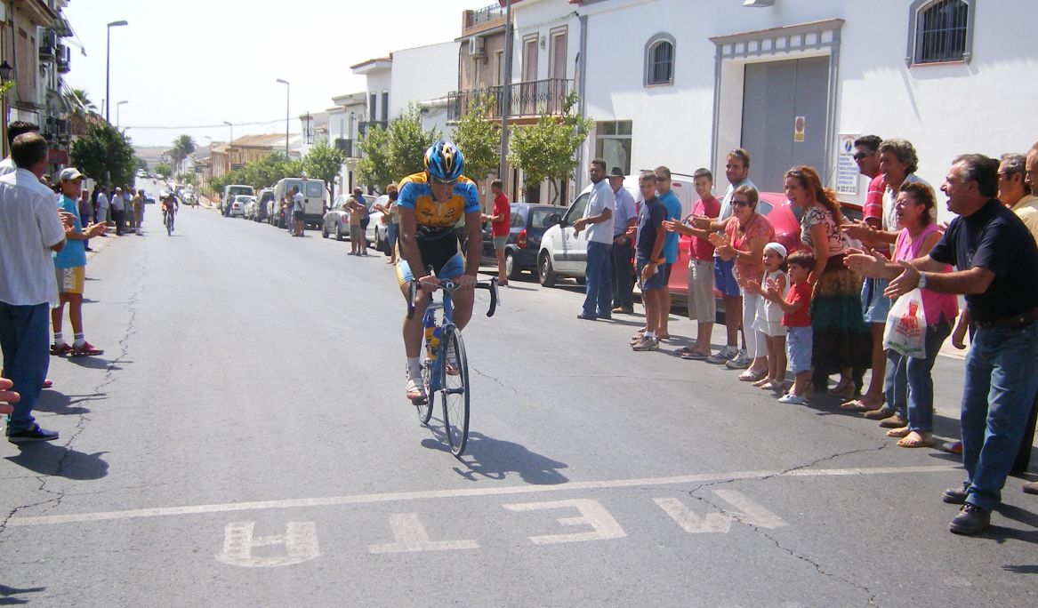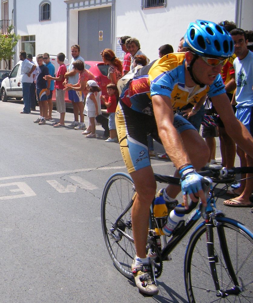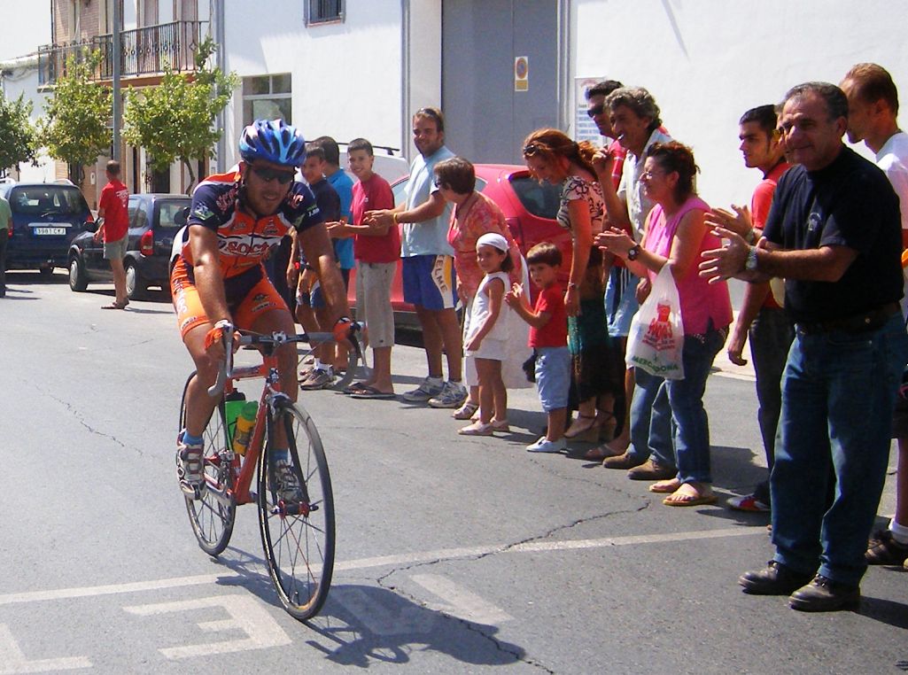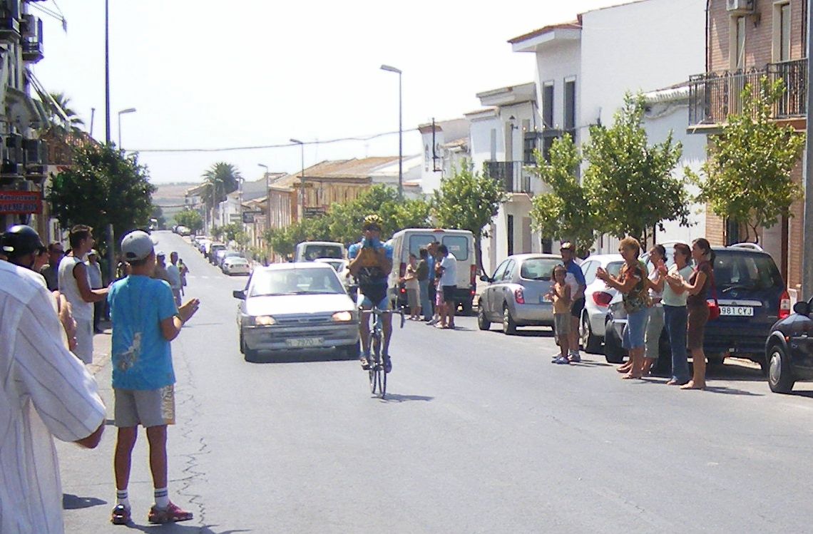 Lo que mas duro se me hizo fue la cuesta de los adoquines de Rociana, yo iba ya pasando una miseria enorme, pero los de atras también y yo mantenía todavia un buen ritmo, pero el final se me hizo durisimo, la miseria acabo cuando en el último repecho antes de Bollullos los jueces me dijeron -Ya puedes levantar los brazos, que por atras ni se ven!!. Ya pude quitar plato y aflojar un poquito, también es que soy un asfixiao, les sacaba mas de un minuto... como en Segovia... pero mas vale que sobre que falte, quien sabe..ya en las calles de Bollullos vi la meta y por fin pude levantar los brazos despues de mas de 50 kms solo, que durisimo fue el final con el calor!!.