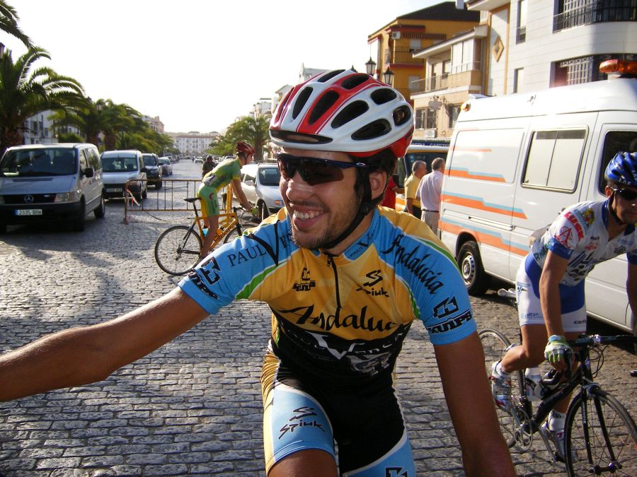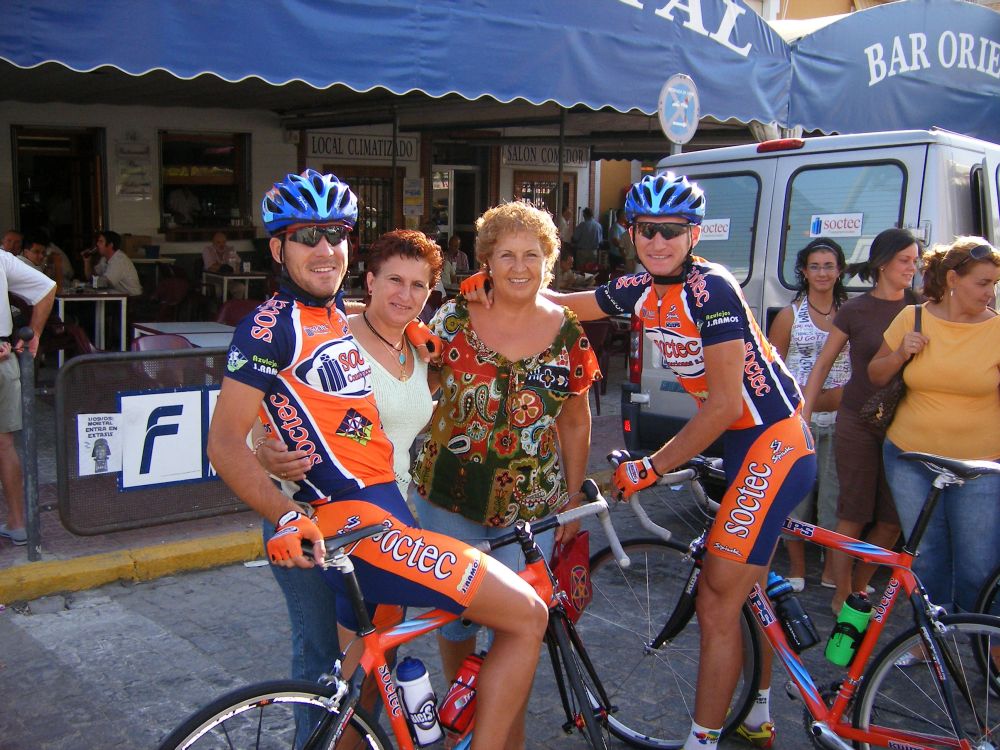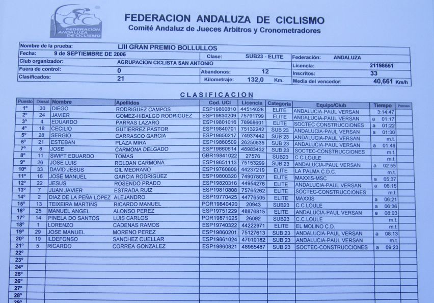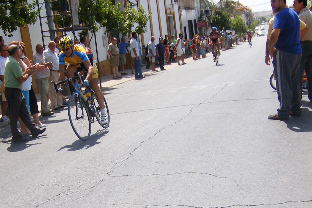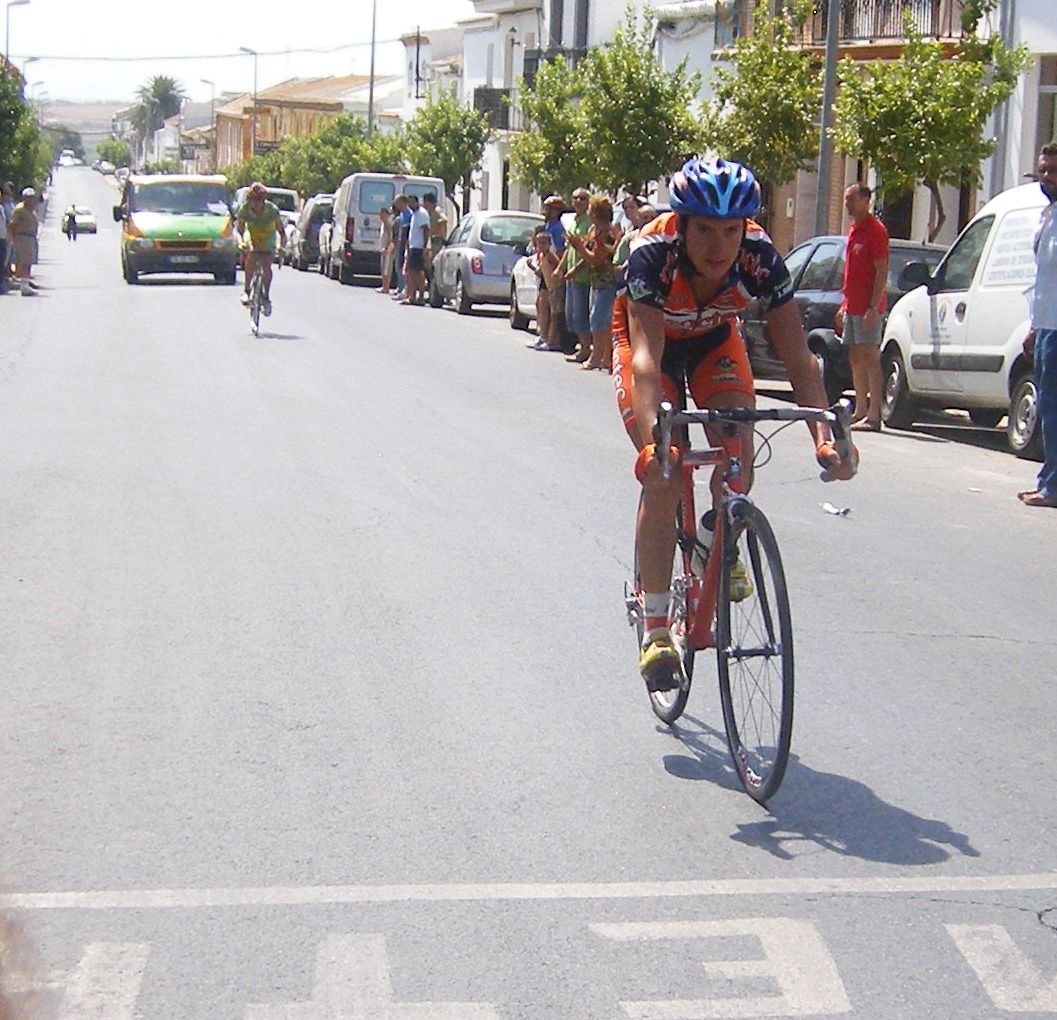 Lo que mas duro se me hizo fue la cuesta de los adoquines de Rociana, yo iba ya pasando una miseria enorme, pero los de atras también y yo mantenía todavia un buen ritmo, pero el final se me hizo durisimo, la miseria acabo cuando en el último repecho antes de Bollullos los jueces me dijeron -Ya puedes levantar los brazos, que por atras ni se ven!!. Ya pude quitar plato y aflojar un poquito, también es que soy un asfixiao, les sacaba mas de un minuto... como en Segovia... pero mas vale que sobre que falte, quien sabe..ya en las calles de Bollullos vi la meta y por fin pude levantar los brazos despues de mas de 50 kms solo, que durisimo fue el final con el calor!!.