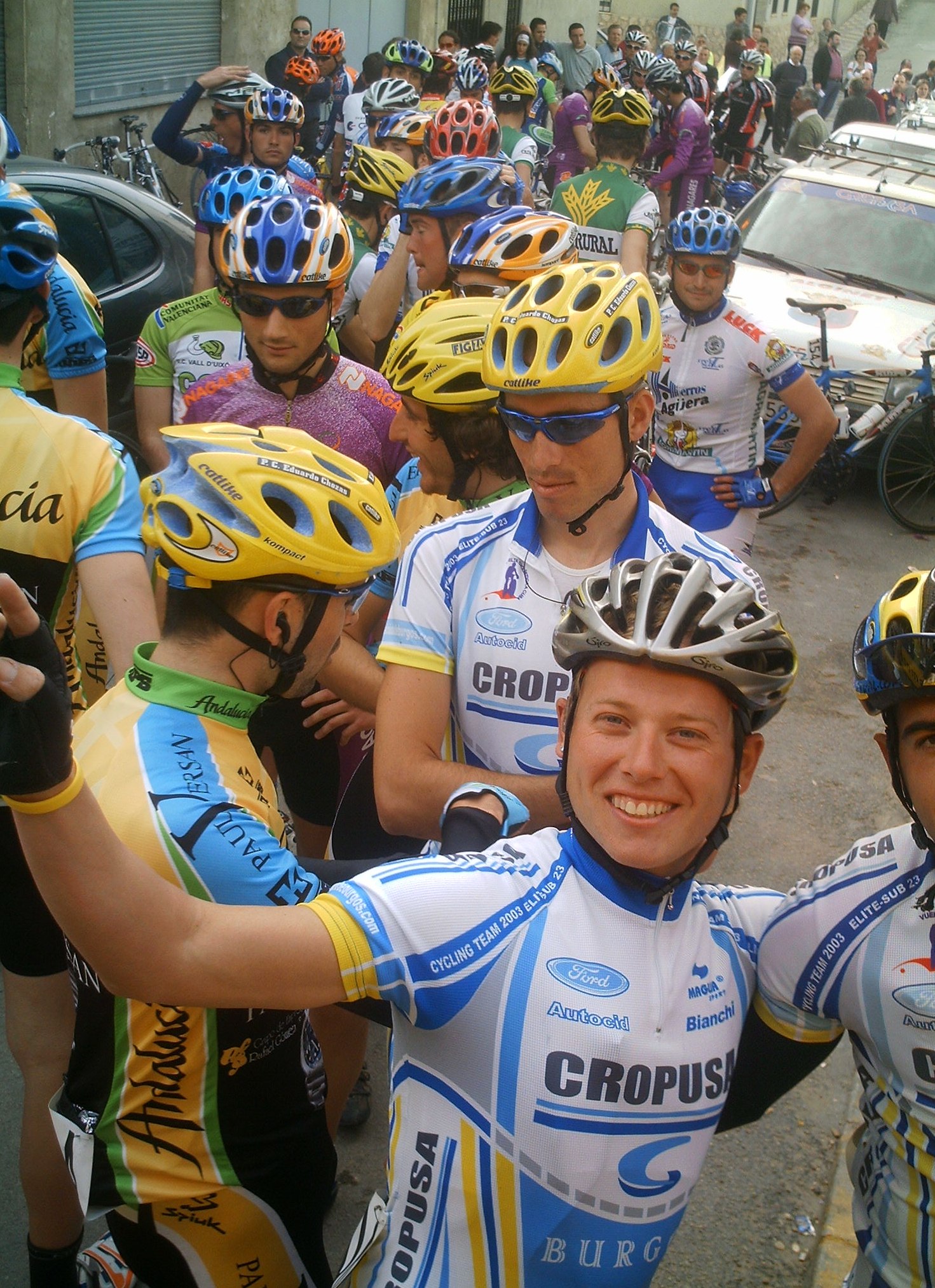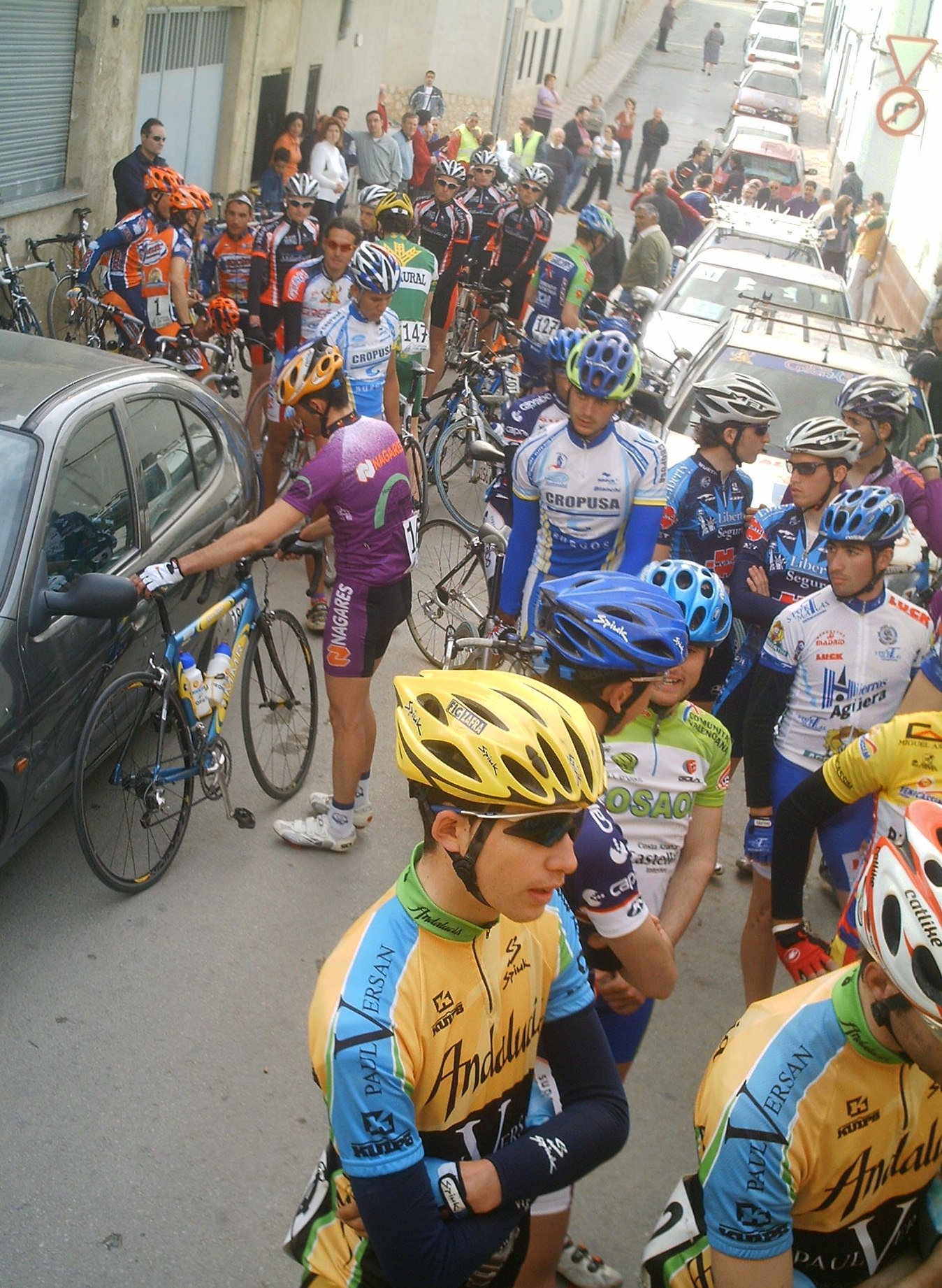 Despues de dar unas cuantas vueltas al pueblo neutralizadas se salió por la carretera de Fuente Alamo, alli todo el mundo arrancando con toda la fuerza, arrancaban por todos los lados, yo tambien ahi metido en los ataques, como no, al final de la recta de Fuente Alamo hay unas cuestitas buenas para arrancar, ahi me meti en un corte que iba tirando Redondo tirando y yo a rueda, cuando nos cogieron arranqué, no tiraba por que estaba claro que nos iban a coger. Bueno, arranque solo y nada, que iba a durar yo solo en Ontur con toda España ahi, pues si dure 200 metros muchos fueron...