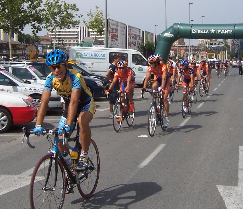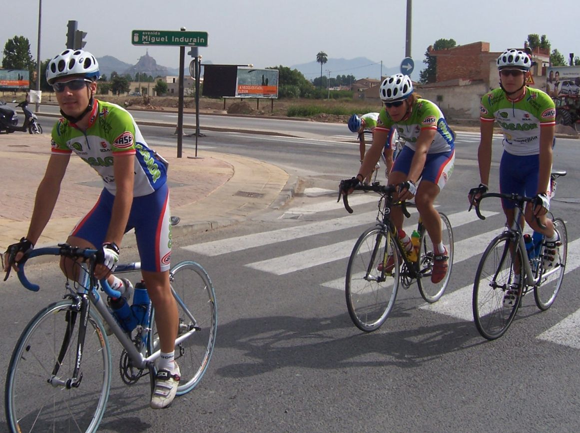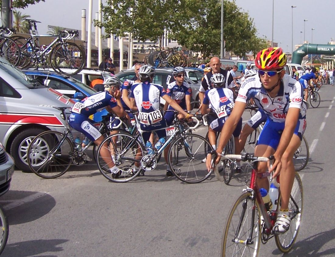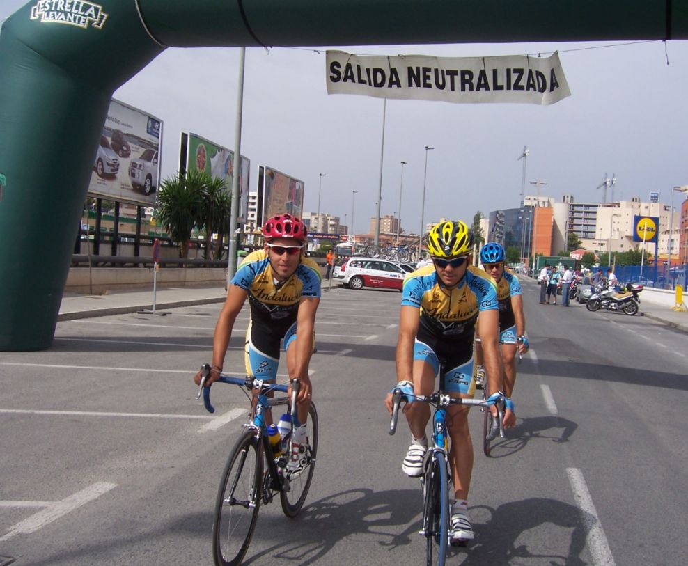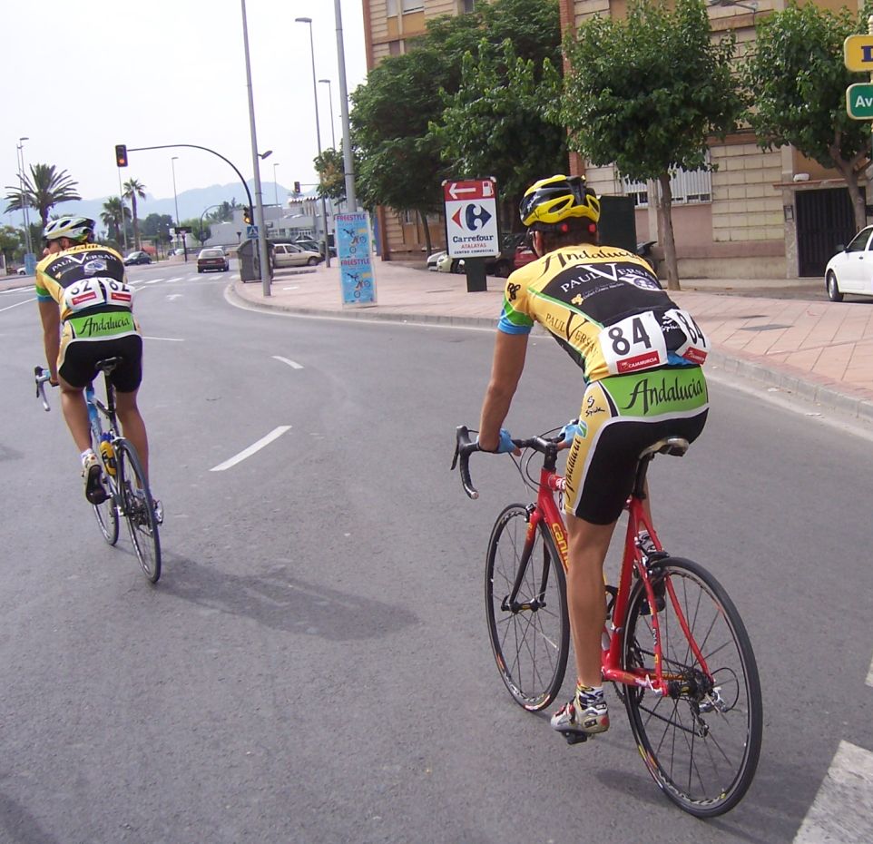 Después de la neutralizada por las calles de la capital Murciana se daba la salida, pelotón enfilado, yo iba ahi metido entre los 20 primeros sin atacar, se veia un Hierros por delante cabalgando, era el Cubano, poco después arrancó el Montenegro y se juntaron los dos, menudo par de bichos rodando en solitario por delante.