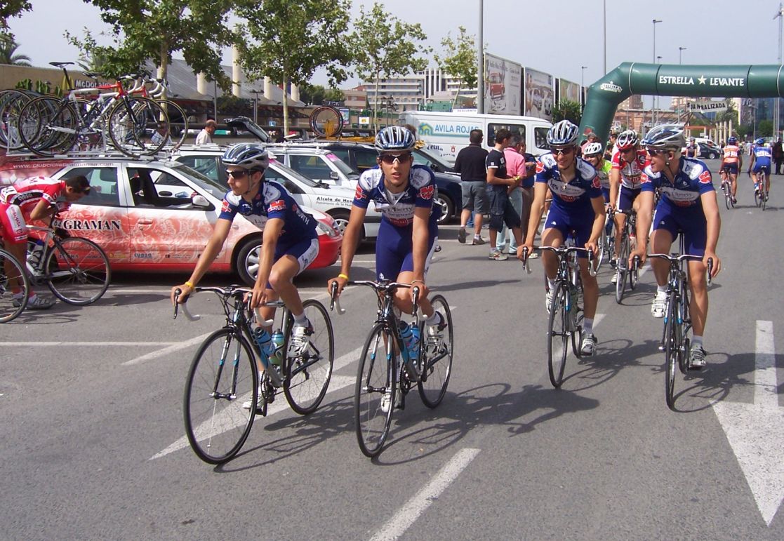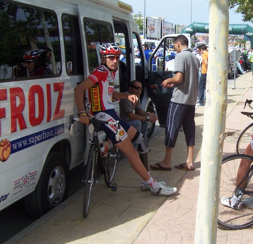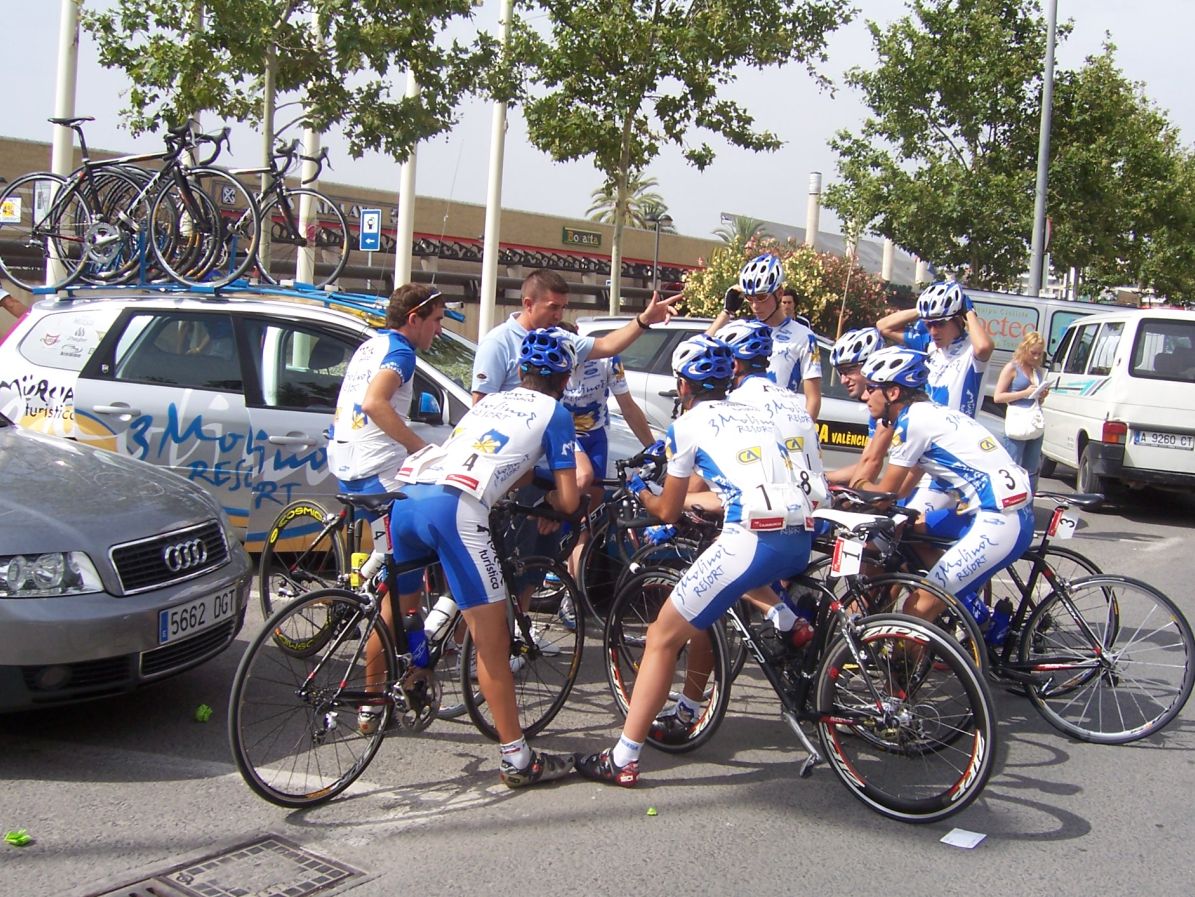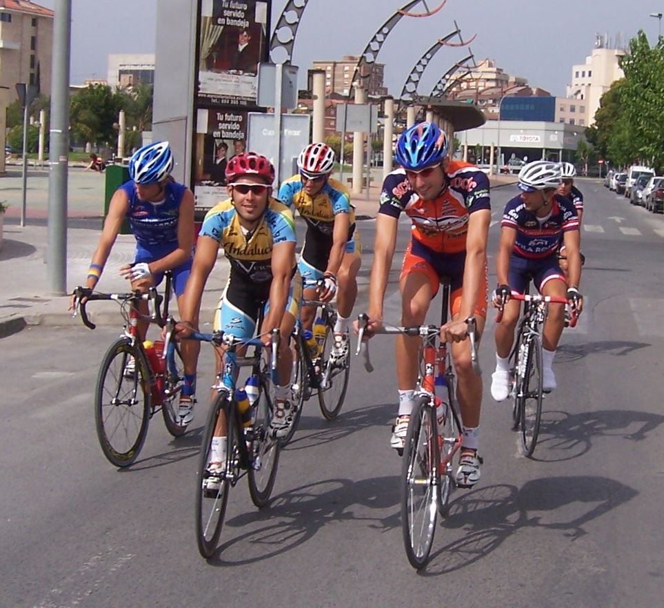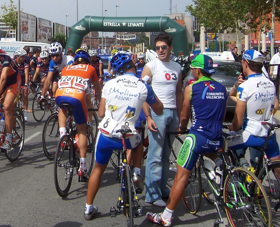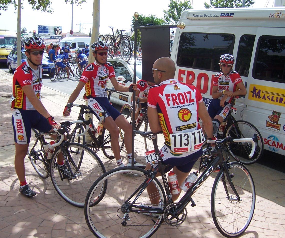 Después de la neutralizada por las calles de la capital Murciana se daba la salida, pelotón enfilado, yo iba ahi metido entre los 20 primeros sin atacar, se veia un Hierros por delante cabalgando, era el Cubano, poco después arrancó el Montenegro y se juntaron los dos, menudo par de bichos rodando en solitario por delante.