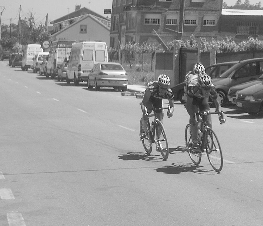 Hasta los cojones de dar el saque de honor, esta vez le toco a un Azysa, fue en el km 15 cuando me meti en la fuga buena, ibamos 15 tios o asi, iba gente buena, los Froiz, el PAdilla del Soctec, peligrosos para la general, ibamos de mi equipo Andres Cardenas y yo, me mandaron arrancar y me fui solo en un repecho, menudo suicidio, estuve unos 10 kms o asi solo esperando que viniera Andres o alguien pero llego la escapada entera con el peloton cerca, seguimos arrancando Andres y yo pero no nos ibamos, por la primera Meta Volante solo pude pasar tercero, las vendian caras y en la segunda me lanzó Andres, pero como era para abajo, vinieron por detras y no me dejaron ni hacer tercero, asi que nada.