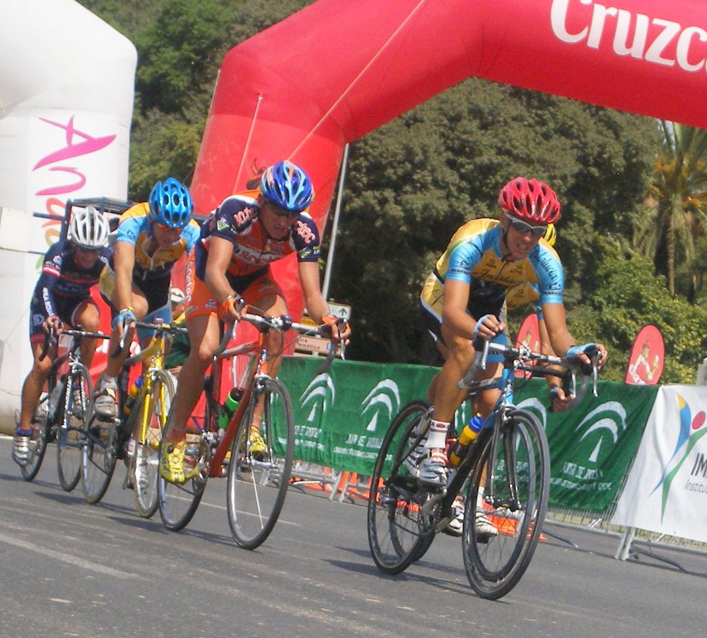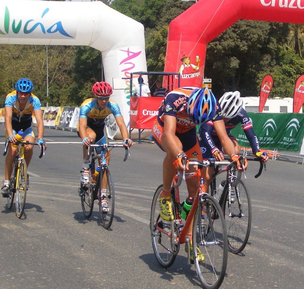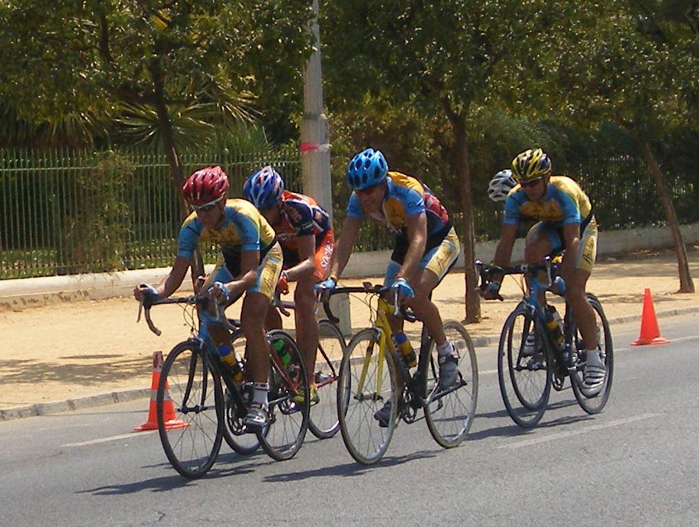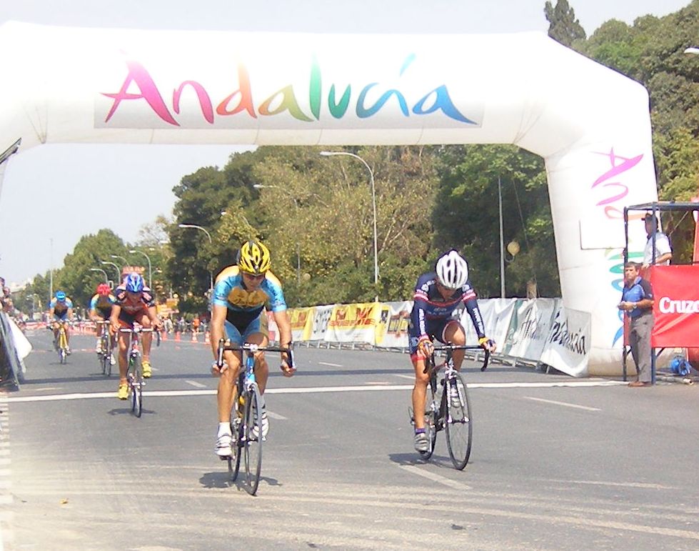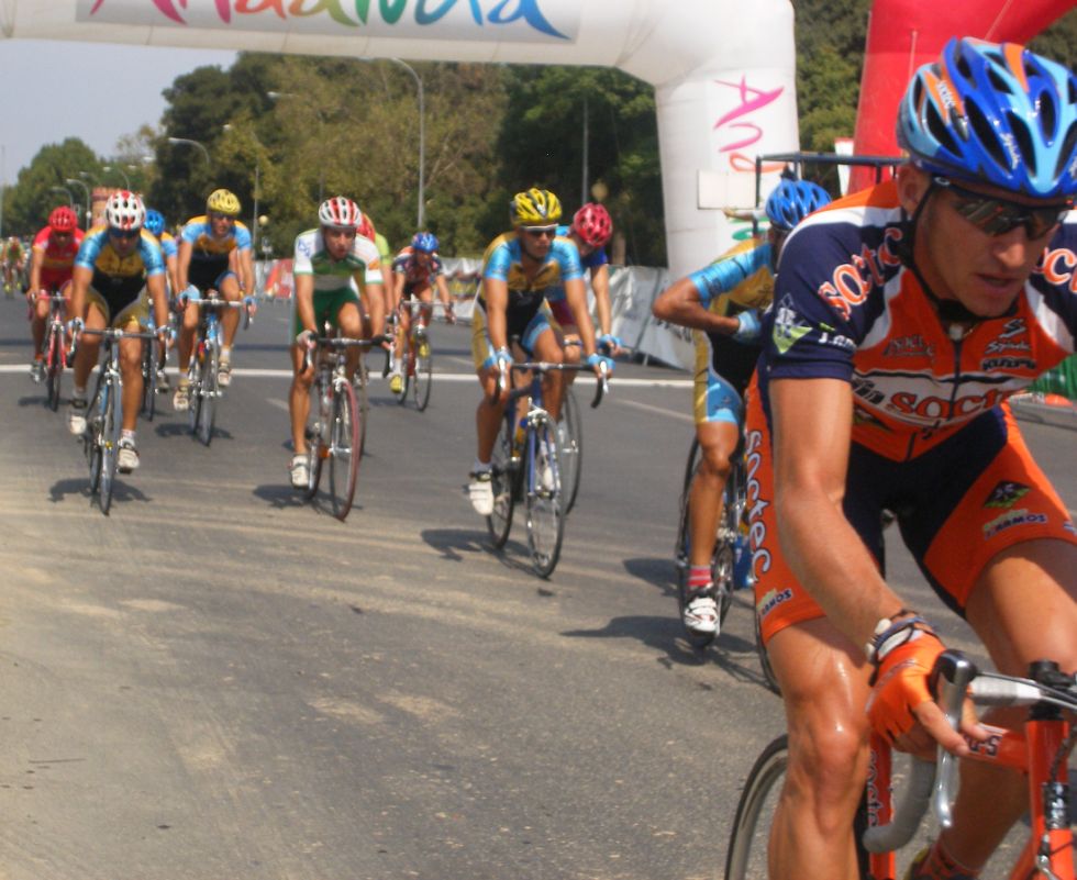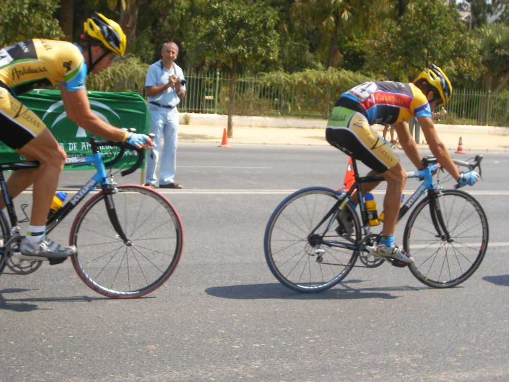 25 vueltas son 50 esprines, pero estos son muy comodos al ser el circuito plano, lo malo que el circuito es muy corto, sales de una curva y cuando te das cuenta ya estas parando para tomar otra curva. Después de muchos intentos se hizo la escapada buena, yo sali mas bien a pocos, estaba muy cansado del esfuerzo del dia anterior en Bollullos, la escapada buena eran tres Andalucia, Rosendo, JOse Luis Roldán y Jose Moreno el Churrianero, un Soctec, Estrada, y un Avila rojas, Luisillo.