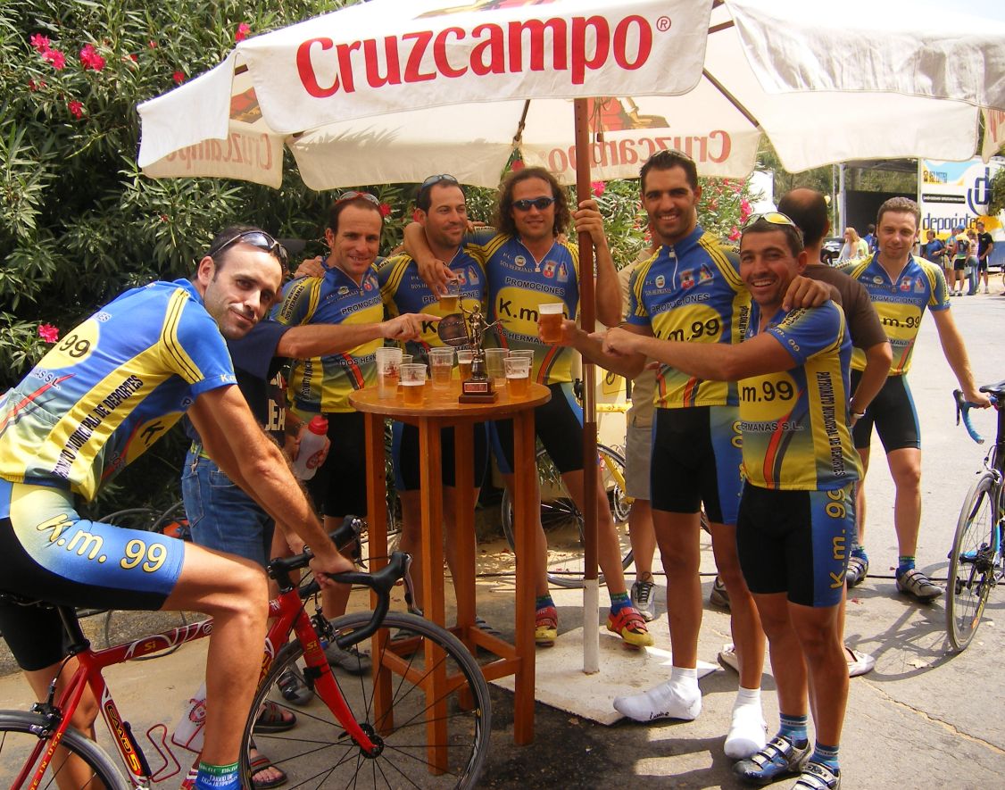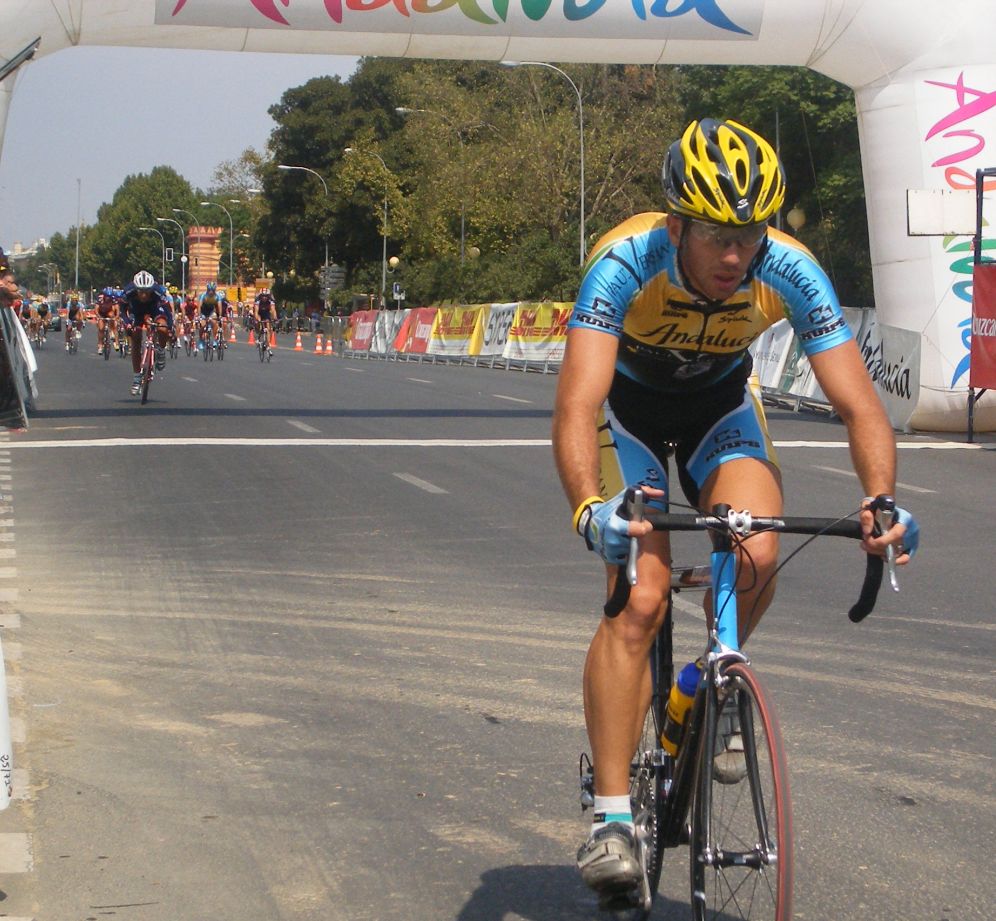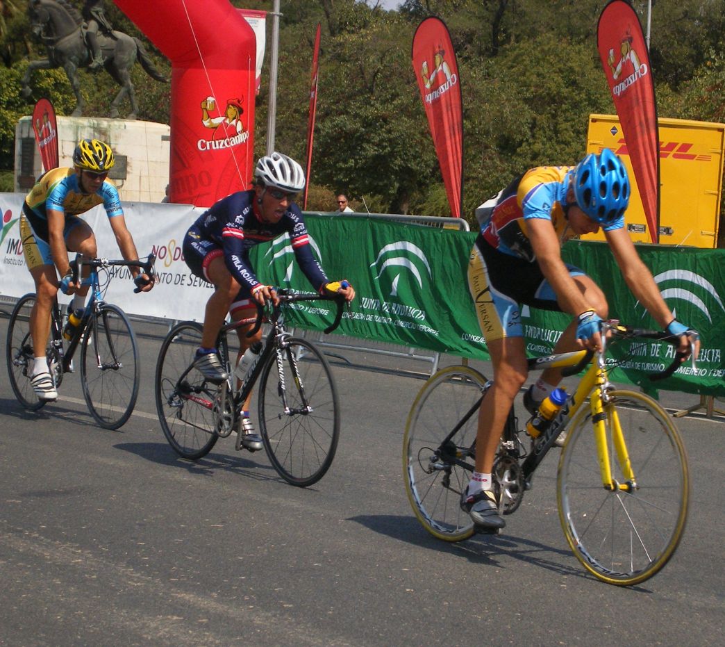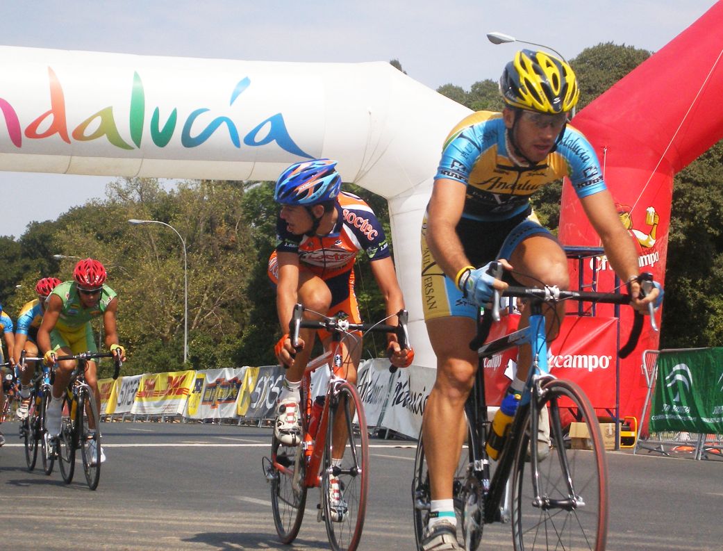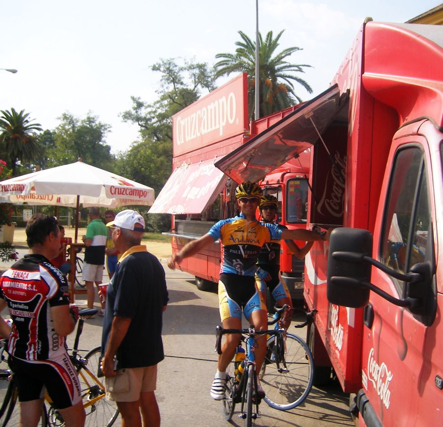 25 vueltas son 50 esprines, pero estos son muy comodos al ser el circuito plano, lo malo que el circuito es muy corto, sales de una curva y cuando te das cuenta ya estas parando para tomar otra curva. Después de muchos intentos se hizo la escapada buena, yo sali mas bien a pocos, estaba muy cansado del esfuerzo del dia anterior en Bollullos, la escapada buena eran tres Andalucia, Rosendo, JOse Luis Roldán y Jose Moreno el Churrianero, un Soctec, Estrada, y un Avila rojas, Luisillo.