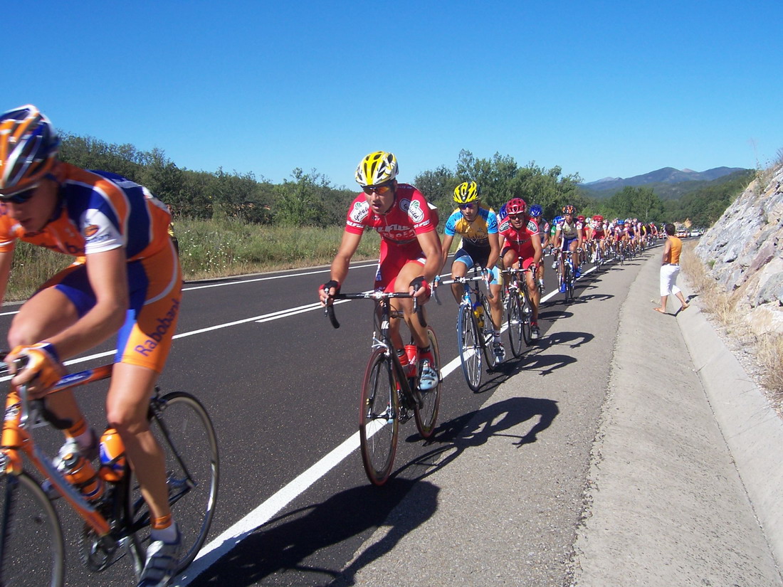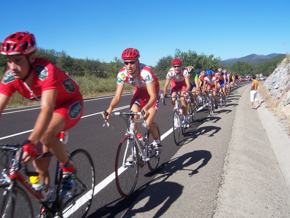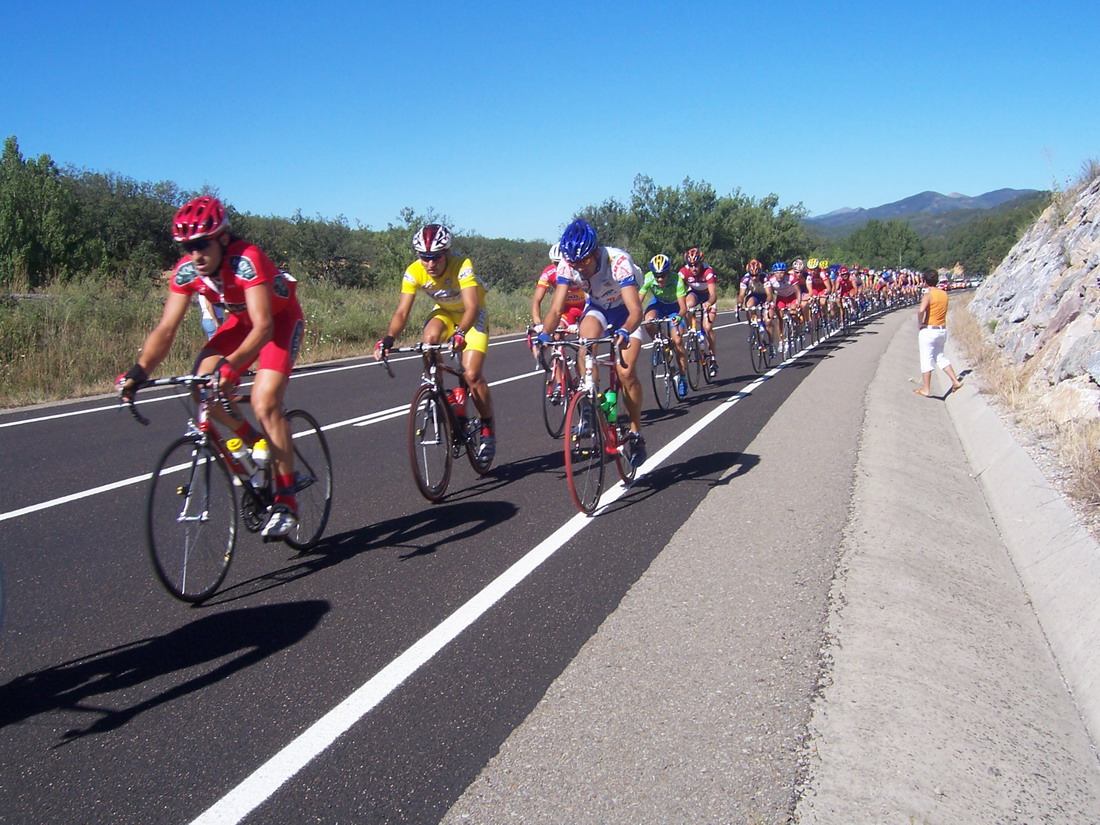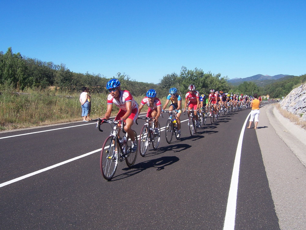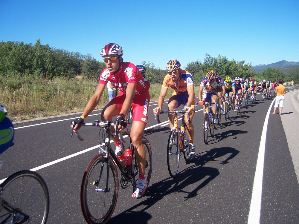 El Francés se iba escaqueando en el ultimo puerto, pensabamos que iba jodido, pero iba aprovechandose de nosotros para luego arrancarnos y dejarnos tiraos, pase primero el premio montaña tirando y en el siguiente repecho nos atacó el Francés, y a mi me dejo tirao, el Bidelan intento cogerle, al final nos cazó el peloton a todos y gano Pacheco el Sprint. Unos 90 kms escapados los tres solos contra el aire que no sirvieron.