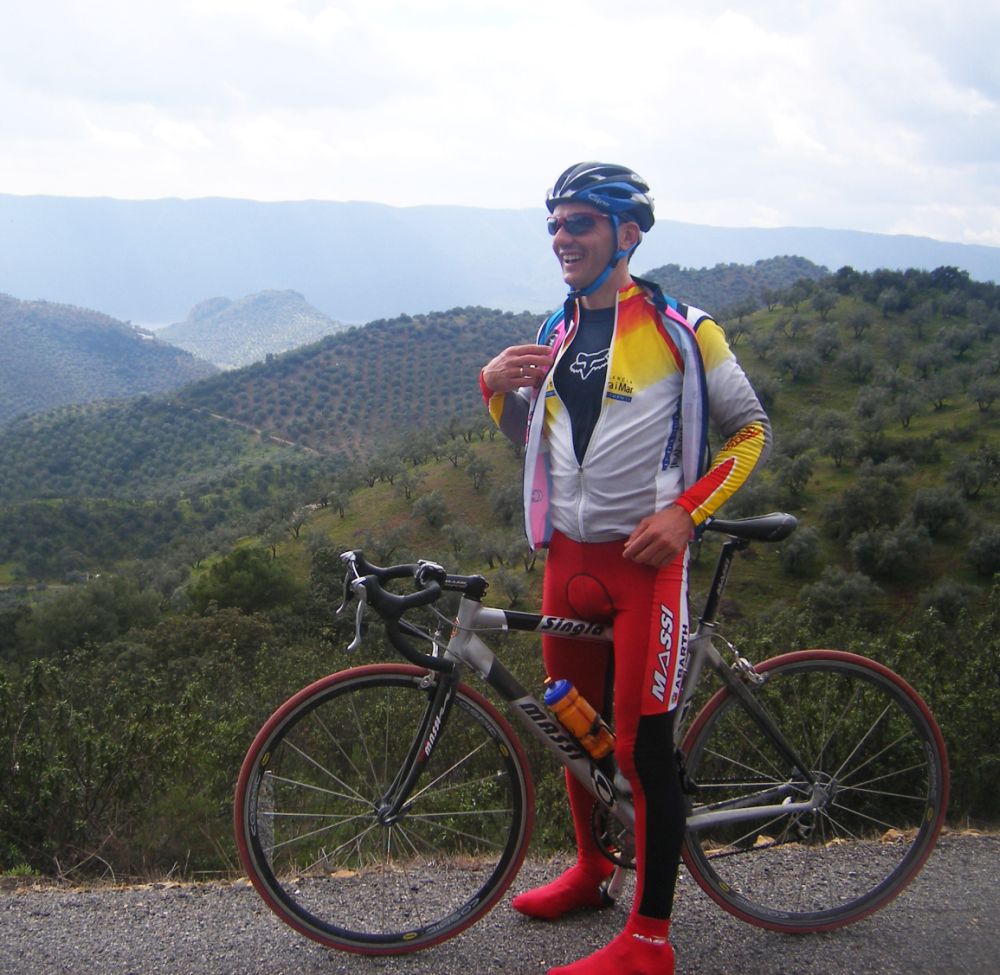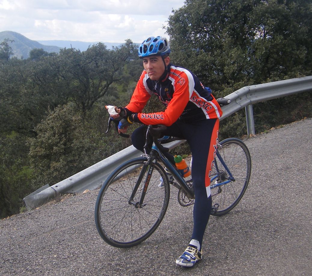 Diegoweb comprobando la presión de la rueda delantera en el alto del Caballón.